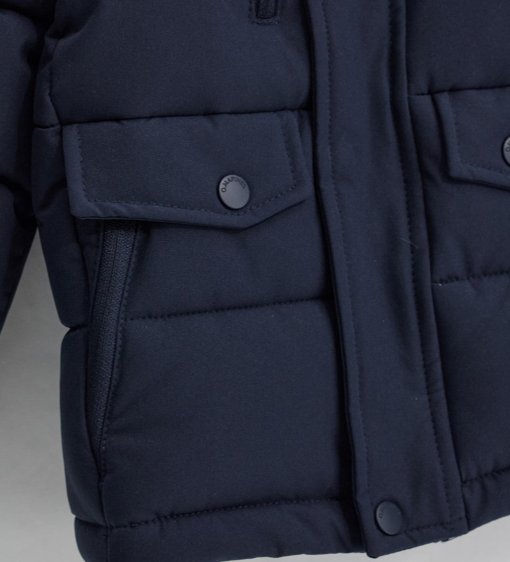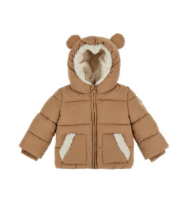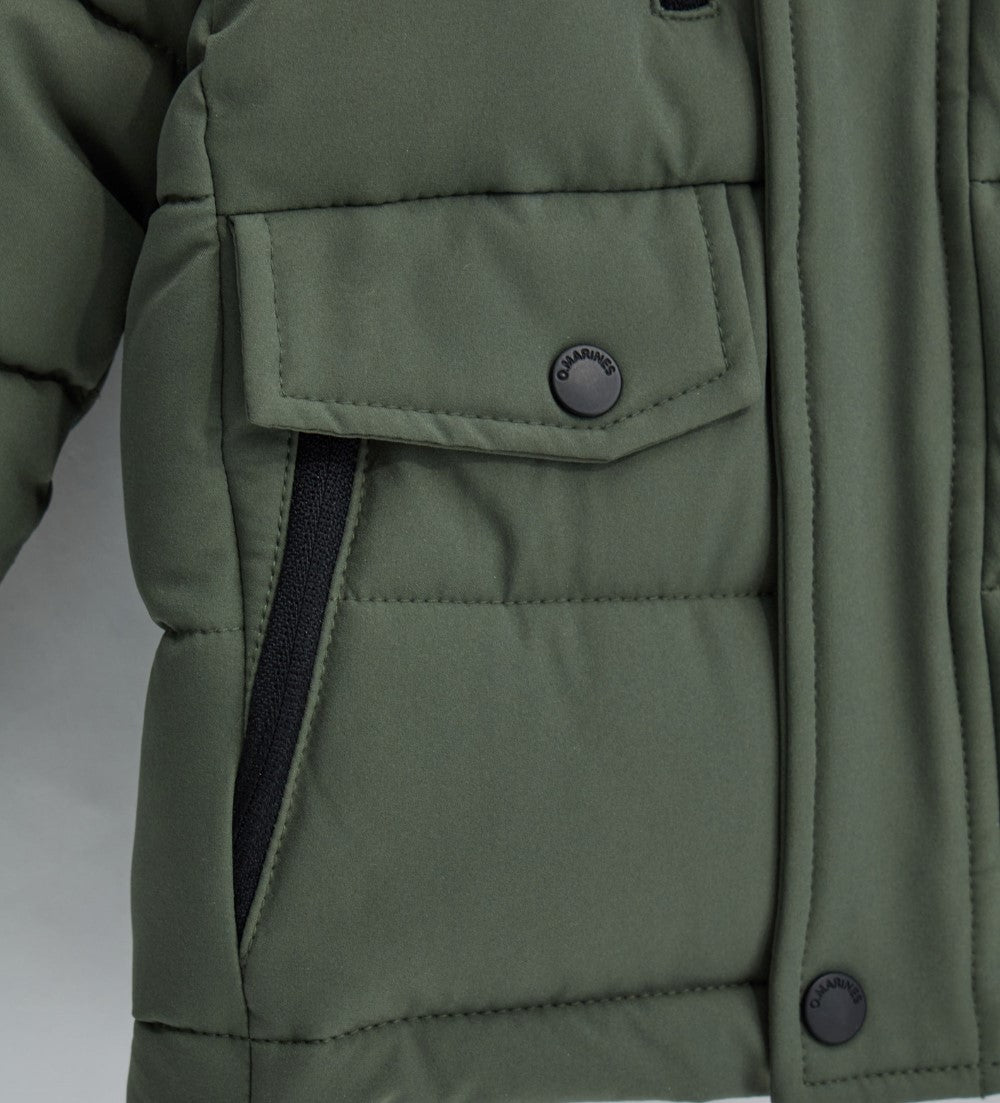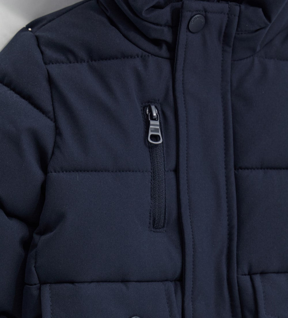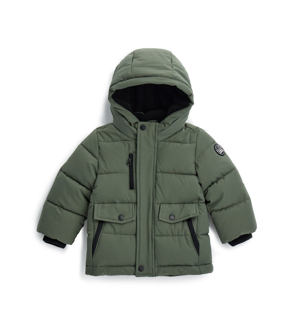 Parka en nylon rembourrée avec capuche, ouverture zippée et boutonnée, poignets côtelés, poches avant zippées et doublure polaire douce.