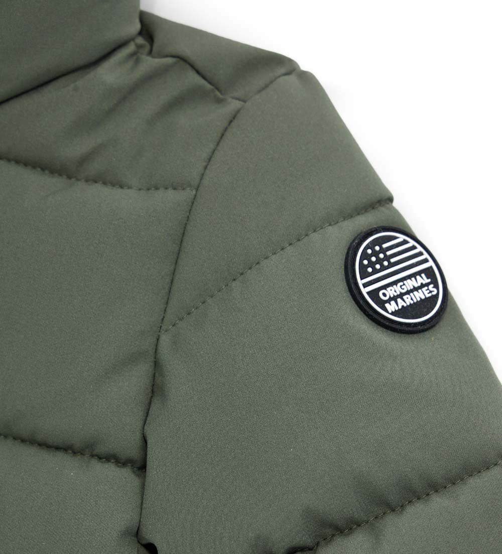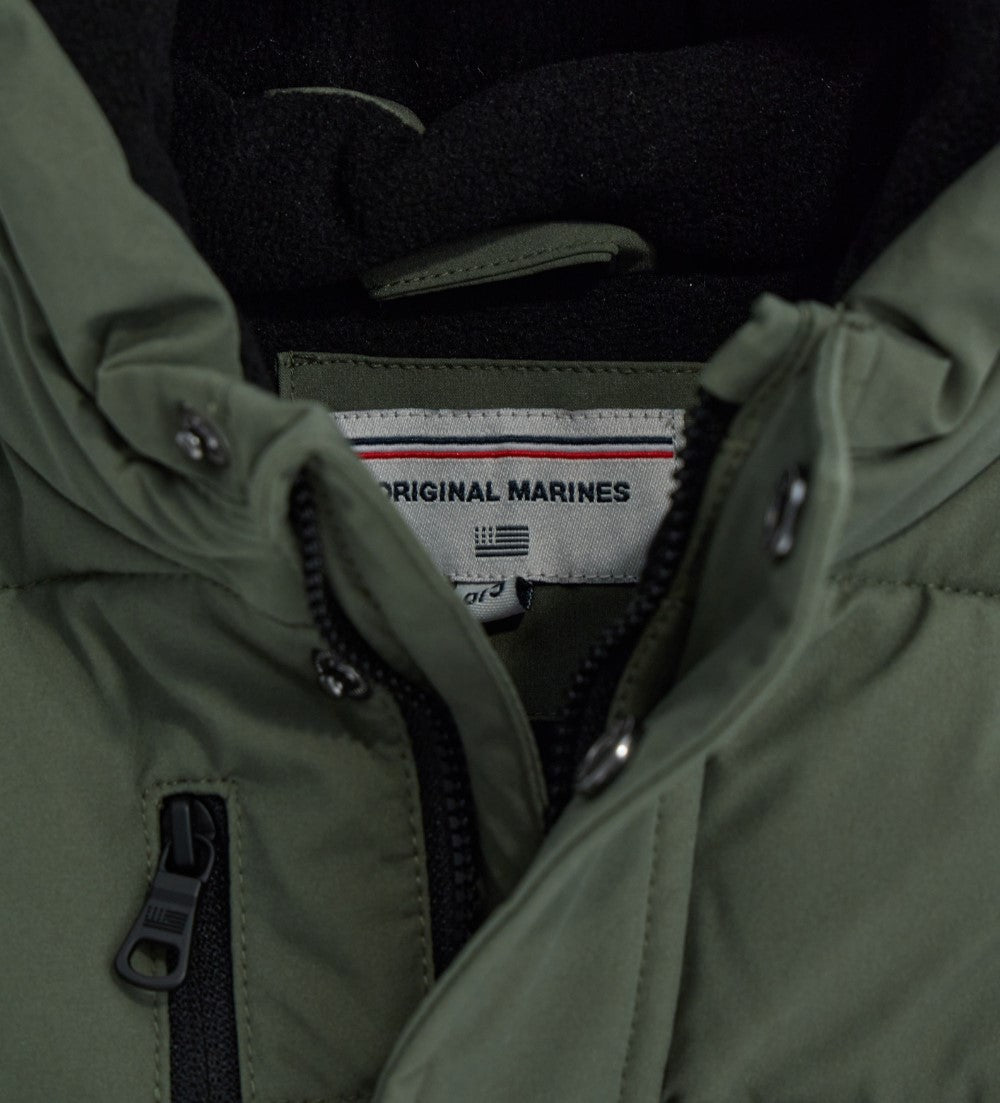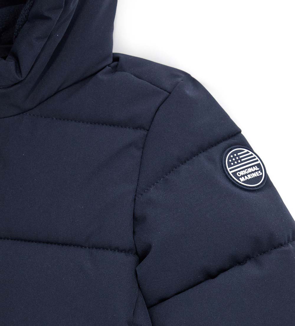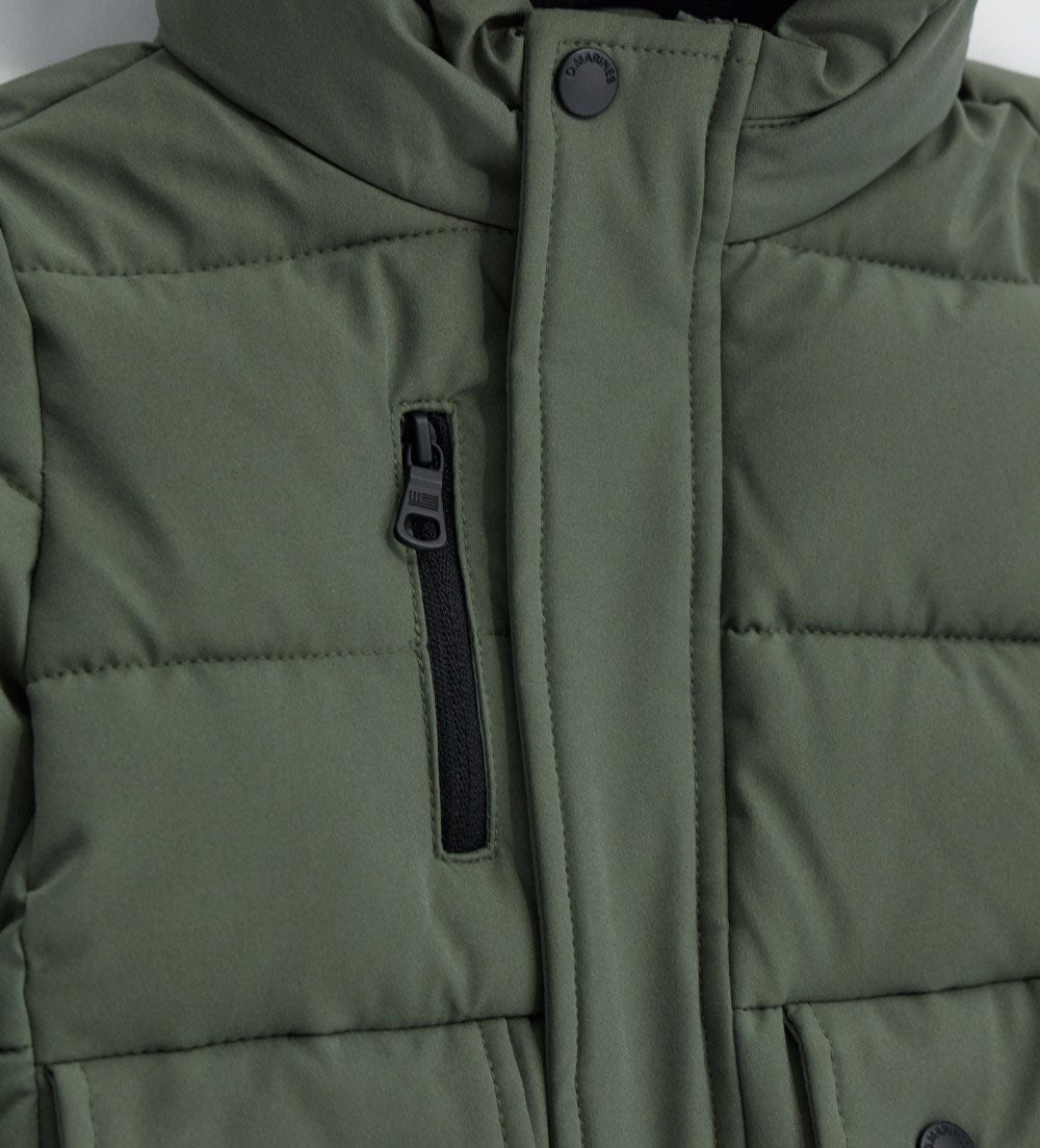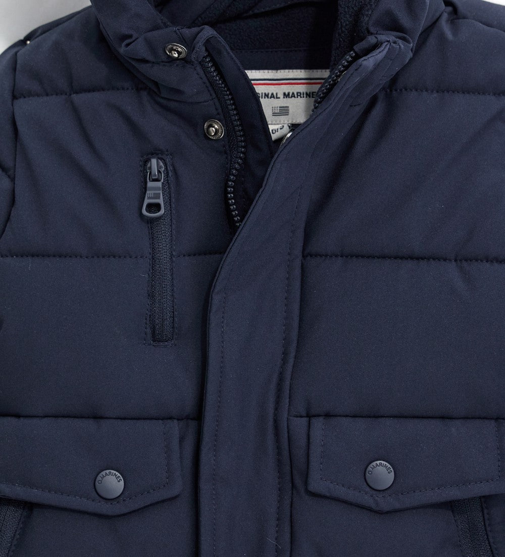 Parka en nylon rembourrée avec capuche, ouverture zippée et boutonnée, poignets côtelés, poches avant zippées et doublure polaire douce.