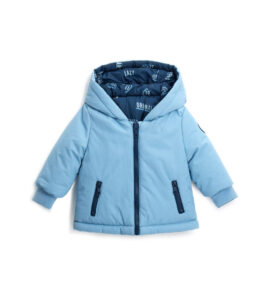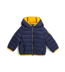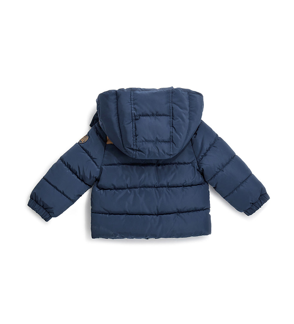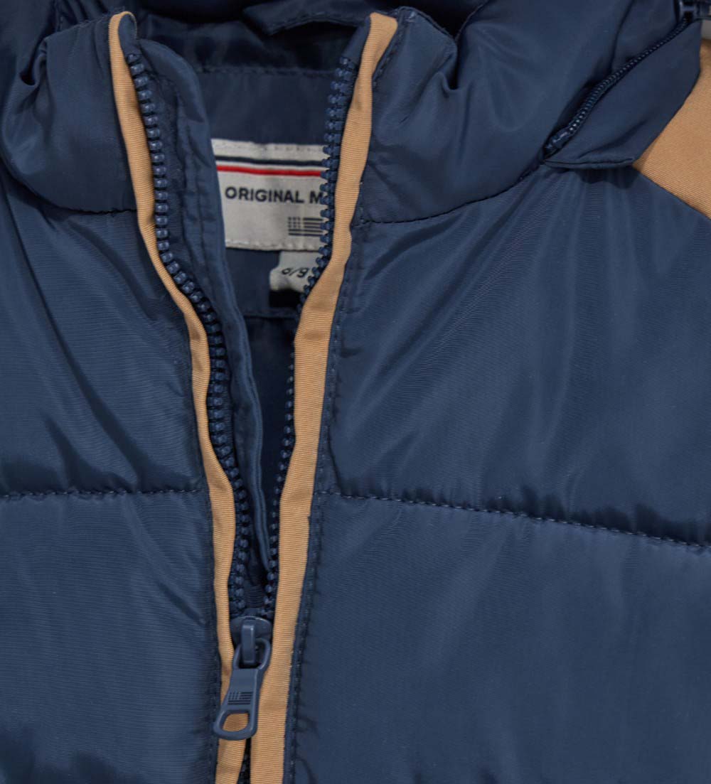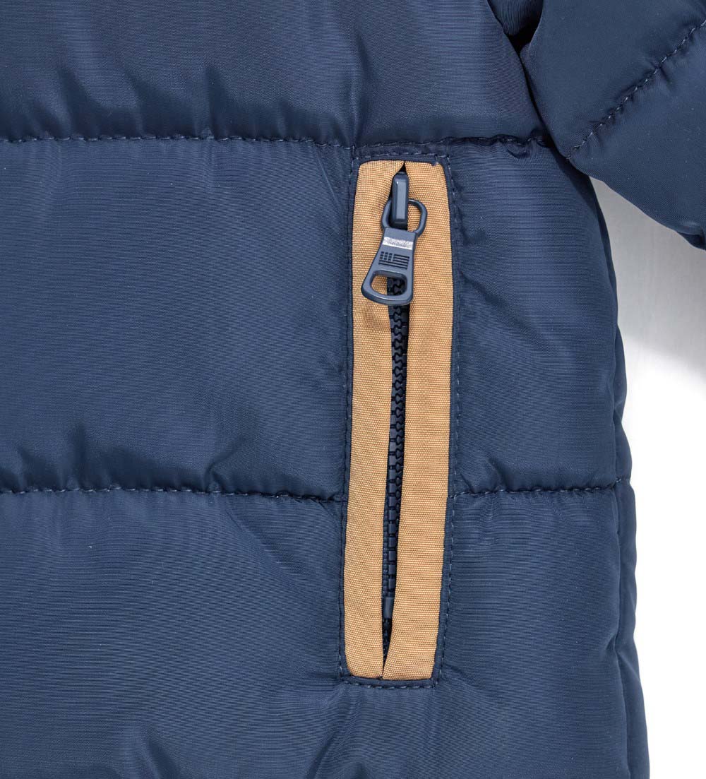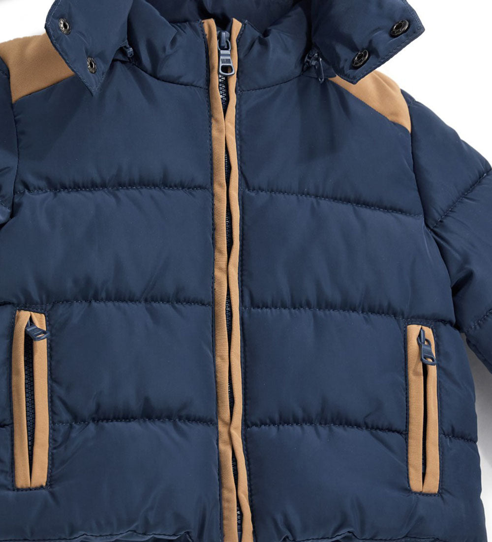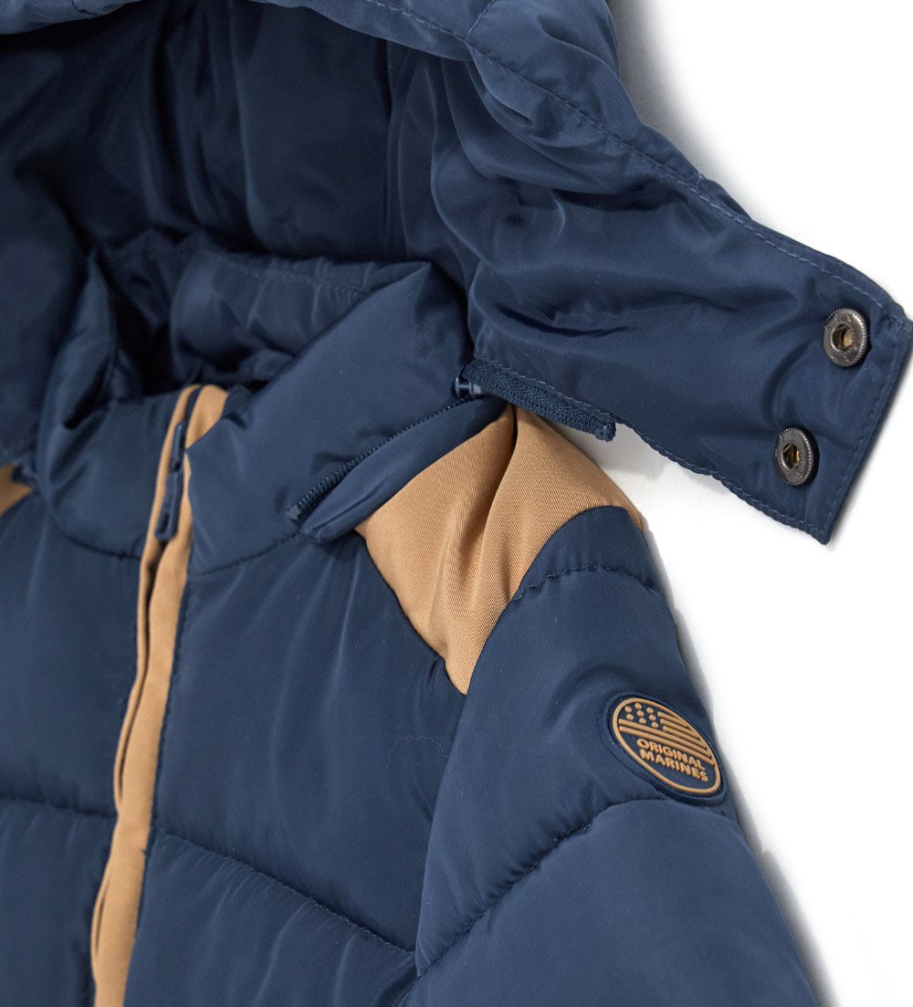 Veste en nylon matelassée avec capuche amovible, empiècements en tissu et couleurs contrastées, ouverture zippée, poches et patch en caoutchouc sur la manche.