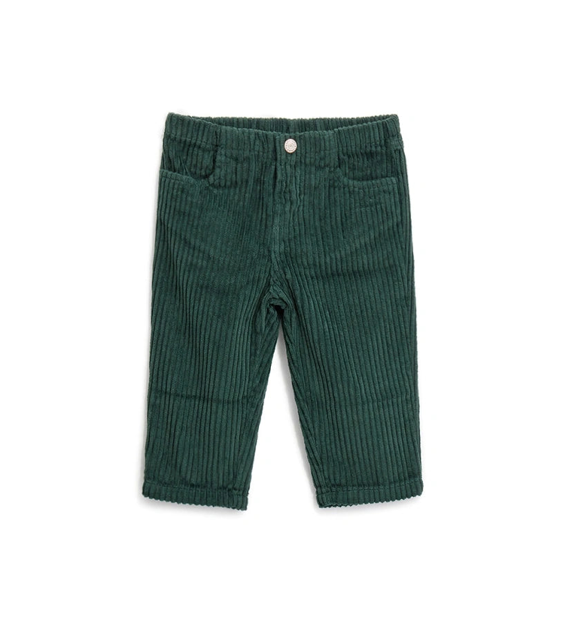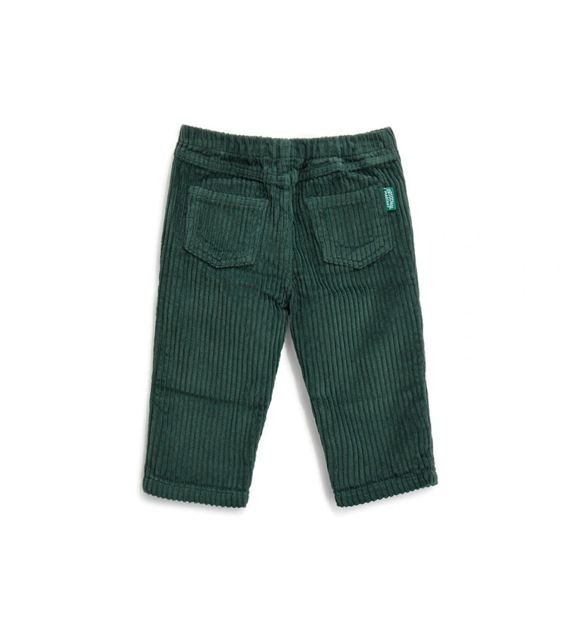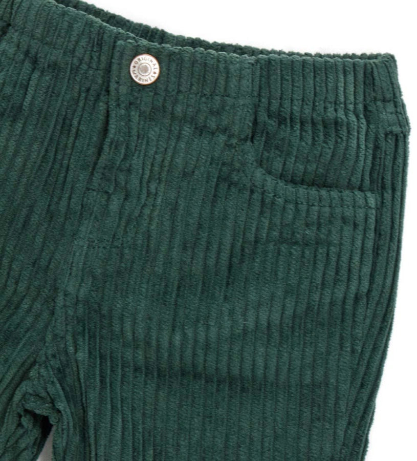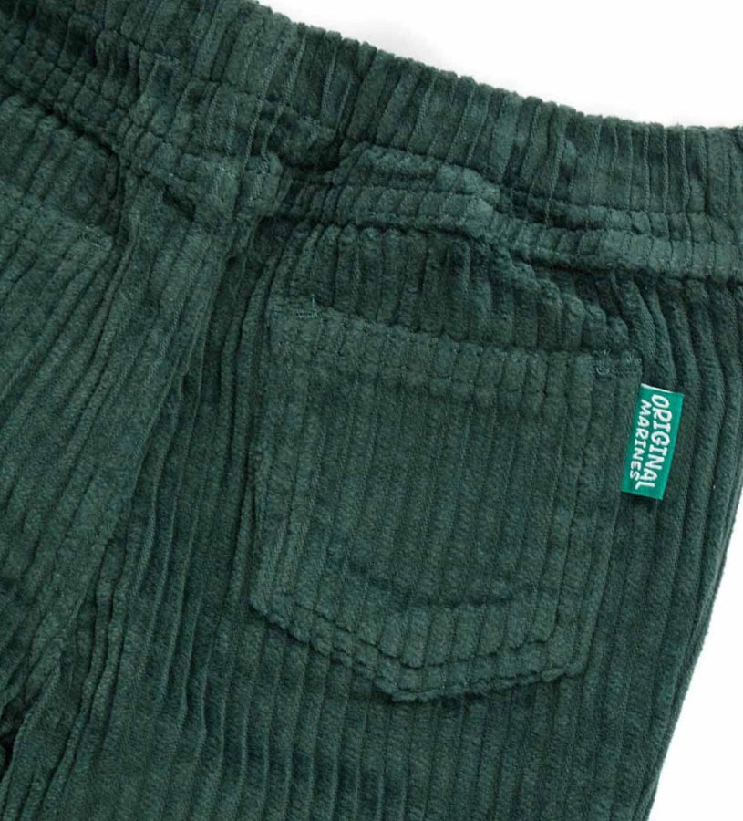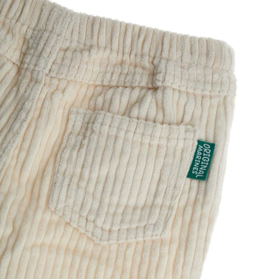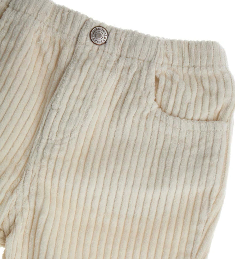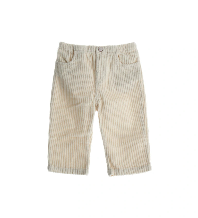 Pantalon en velours avec taille élastique, ouverture devant avec bouton pression, poches devant et poches plaquées au dos.
