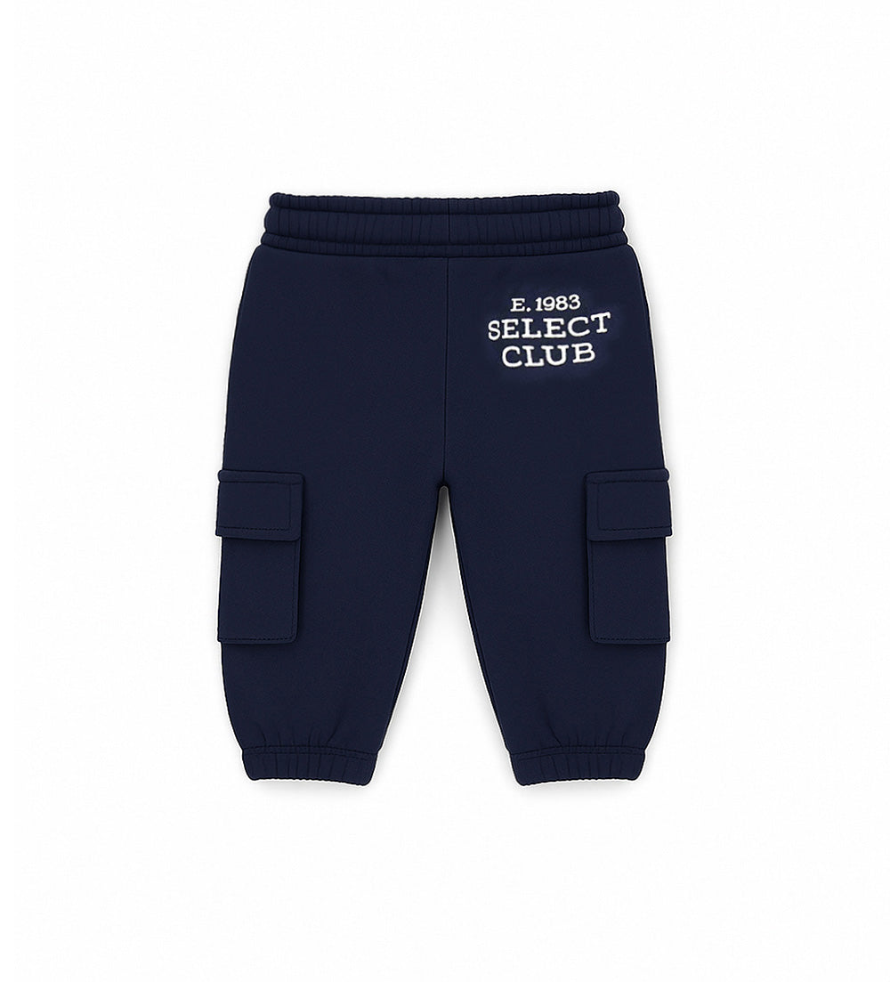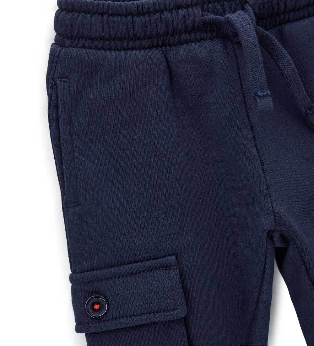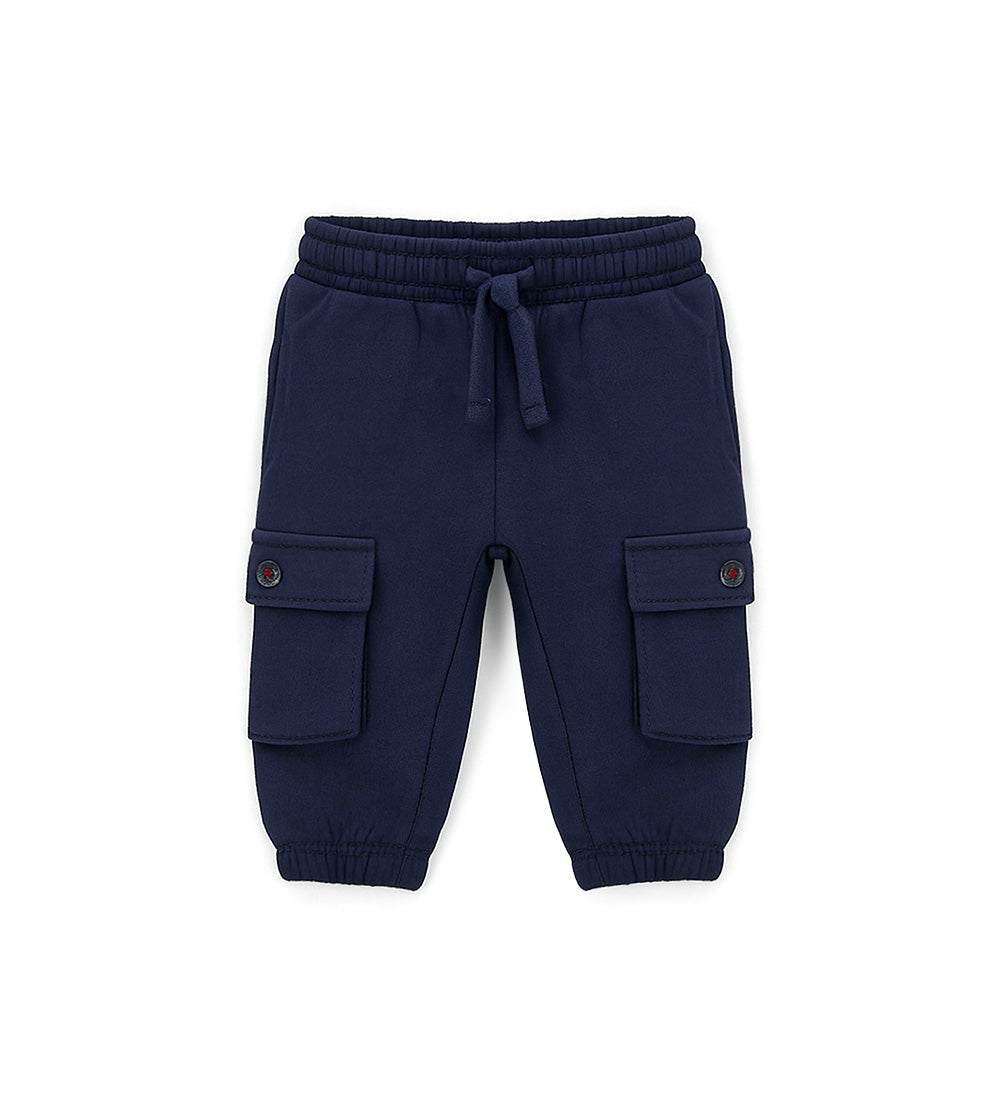 Pantalon en molleton de coton doux et chaud, avec taille élastiquée et cordon de serrage ajustable, poches passepoilées, grandes poches boutonnées et imprimé au dos.