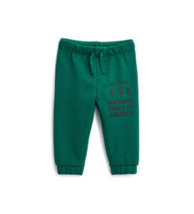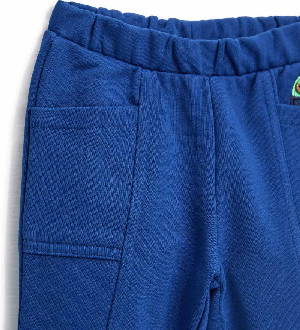 Pantalon baggy en molleton de coton avec découpes décoratives, poches avant, taille élastiquée, poches arrière, application de broderie sur le devant et broderie sur la poche arrière.