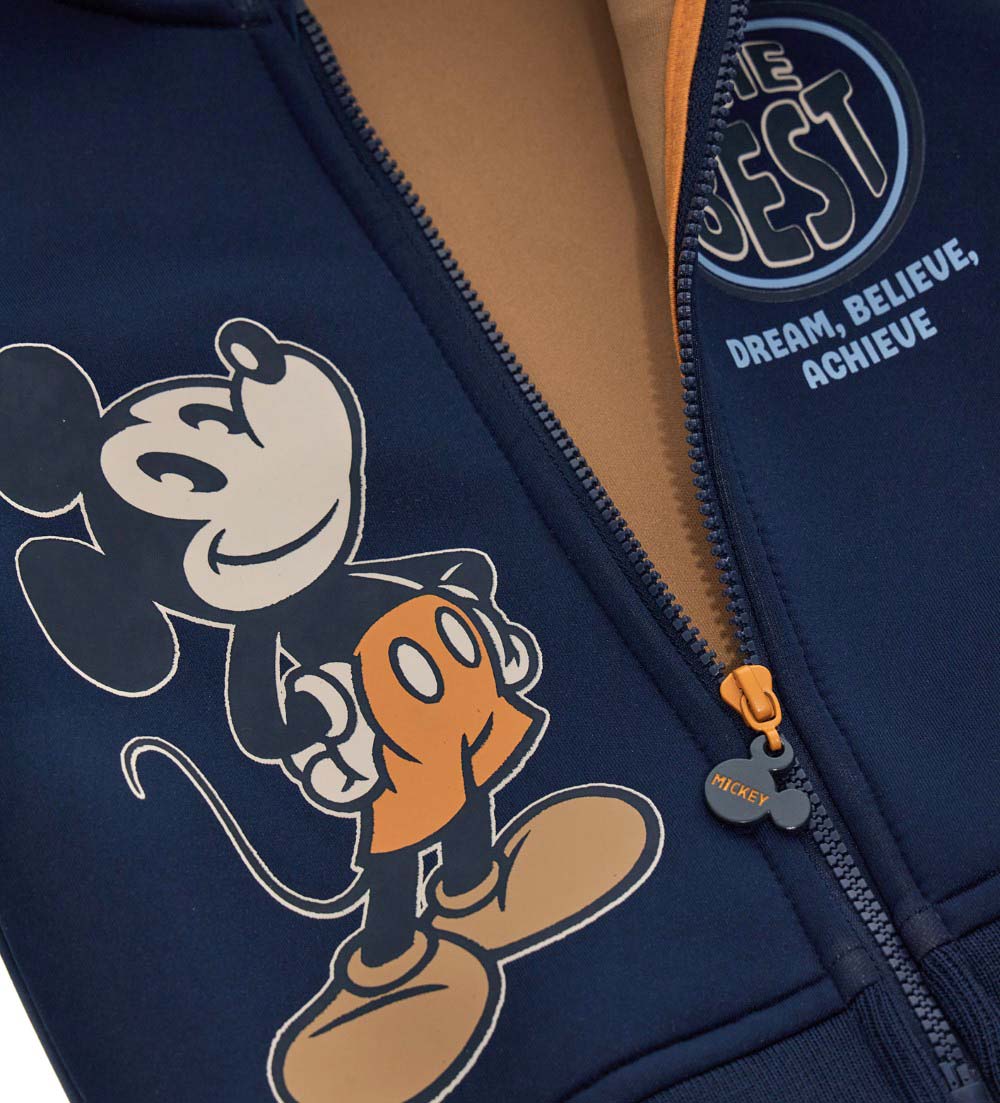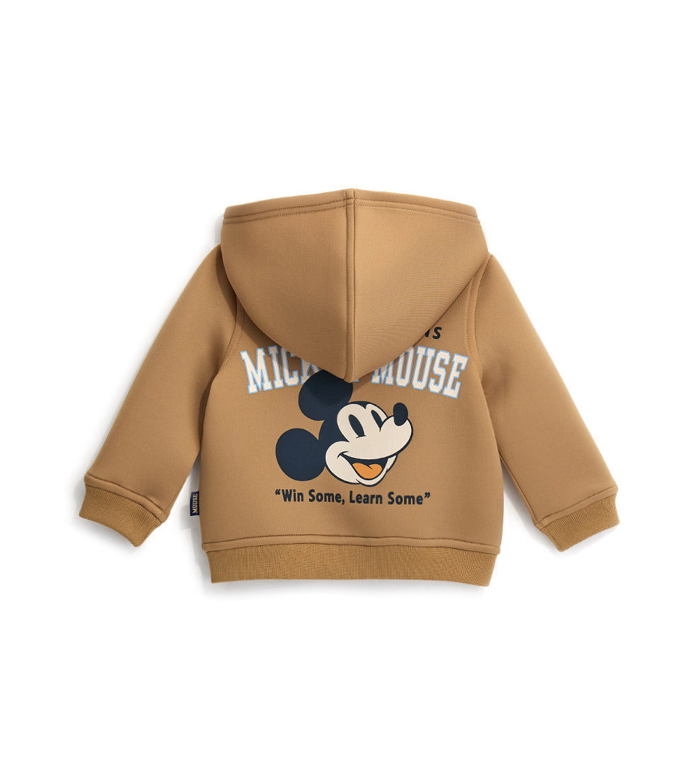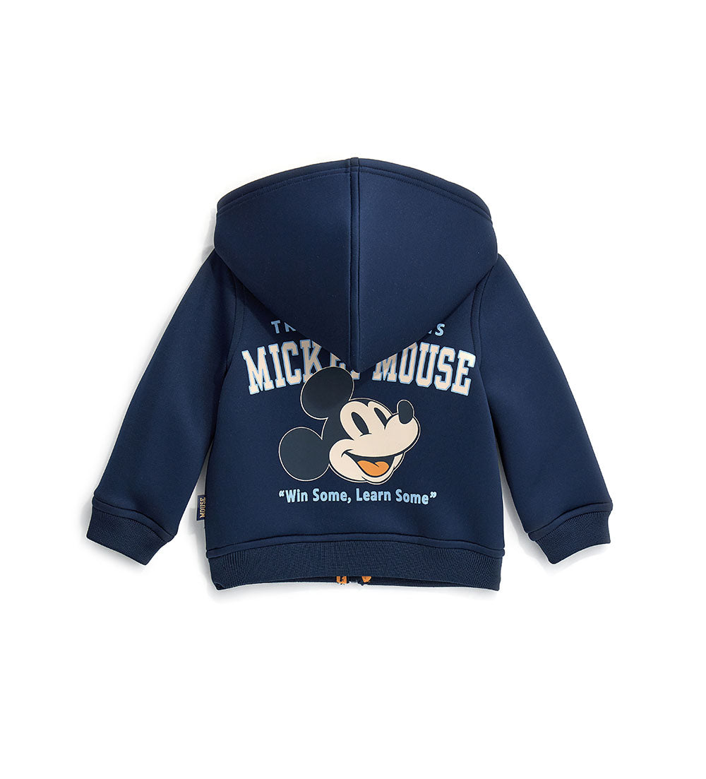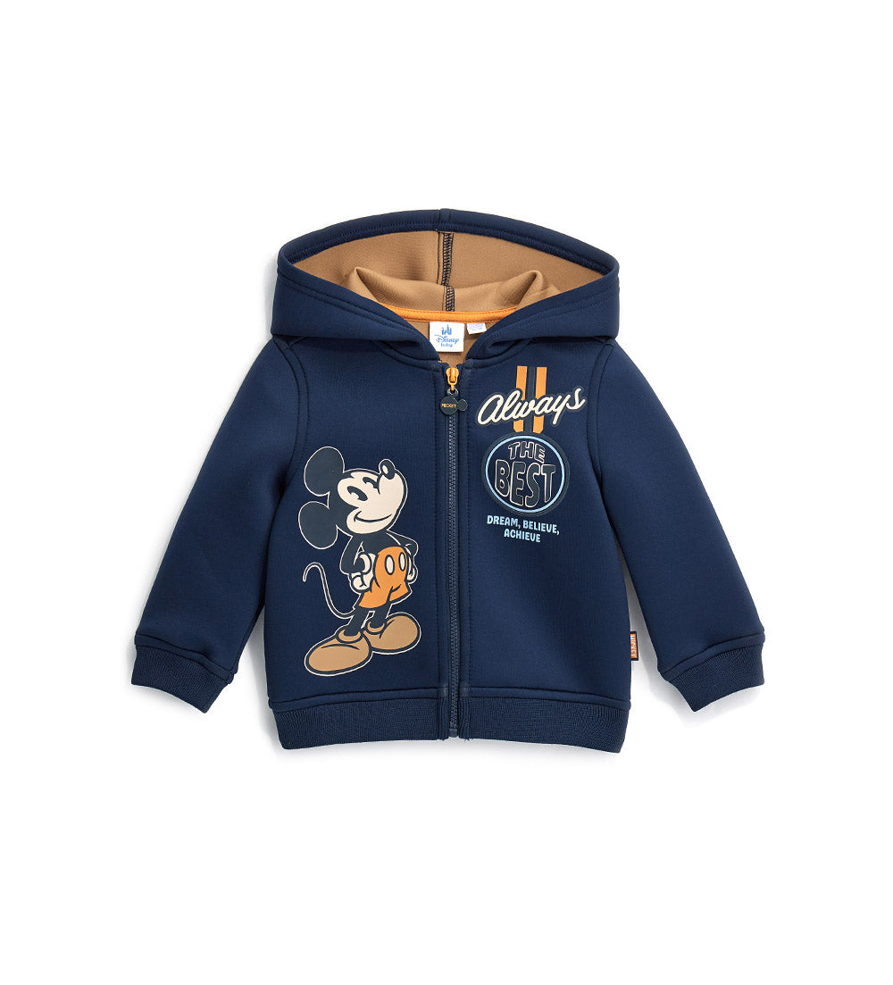 Sweat-shirt Disney en néoprène avec capuche, ouverture zippée devant, finitions côtelées, imprimés devant et dos et étiquette brodée sur le côté.