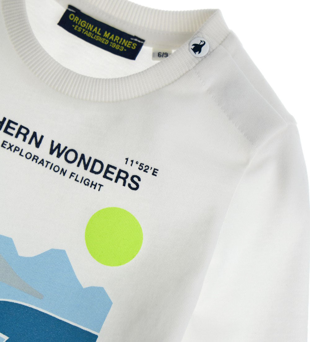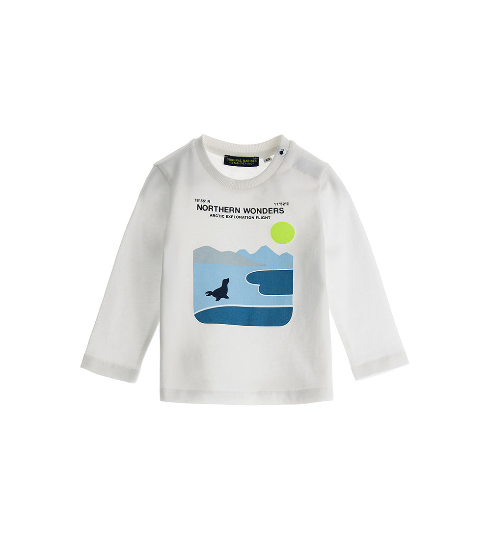 T-shirt ras du cou en coton à manches longues avec ouverture aux épaules par un bouton pression.