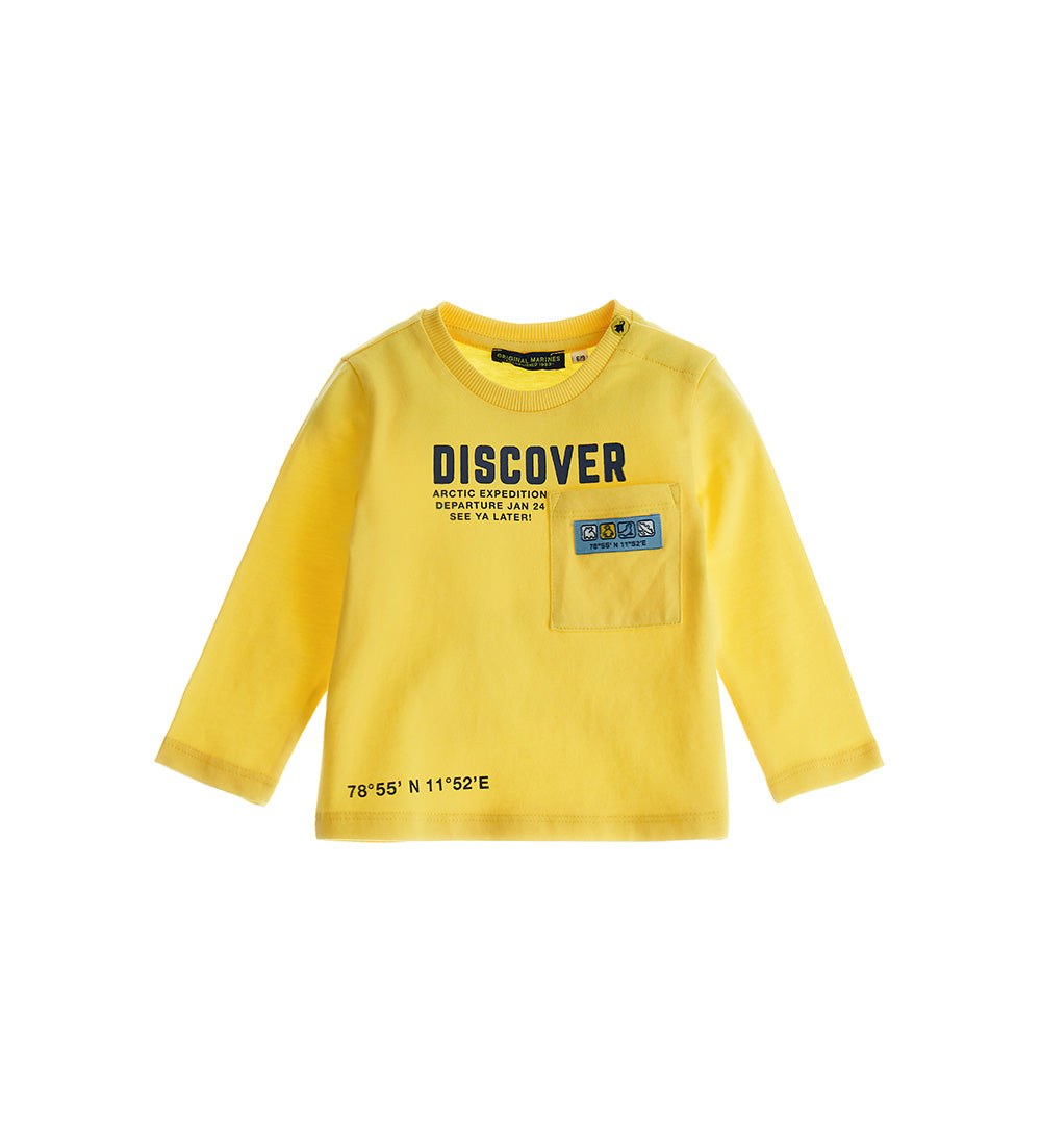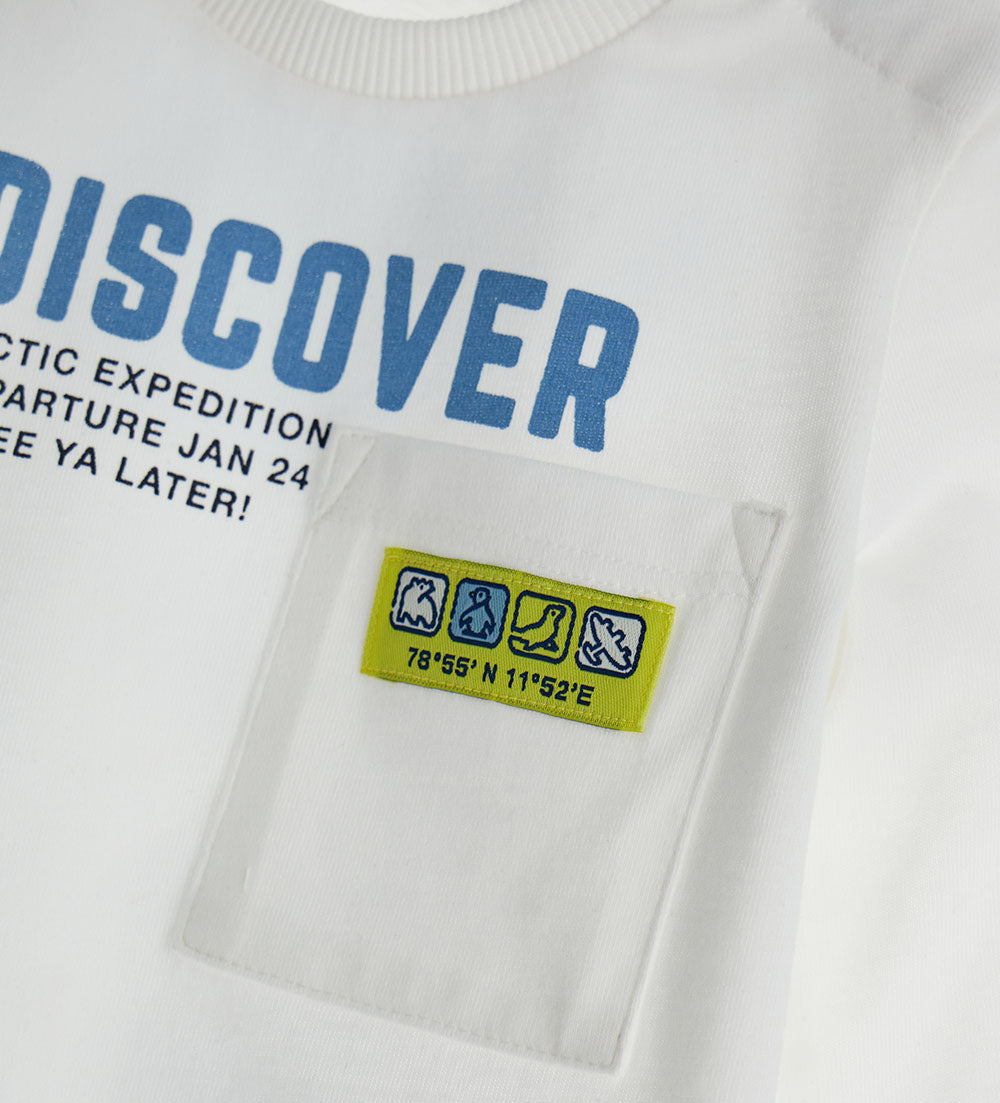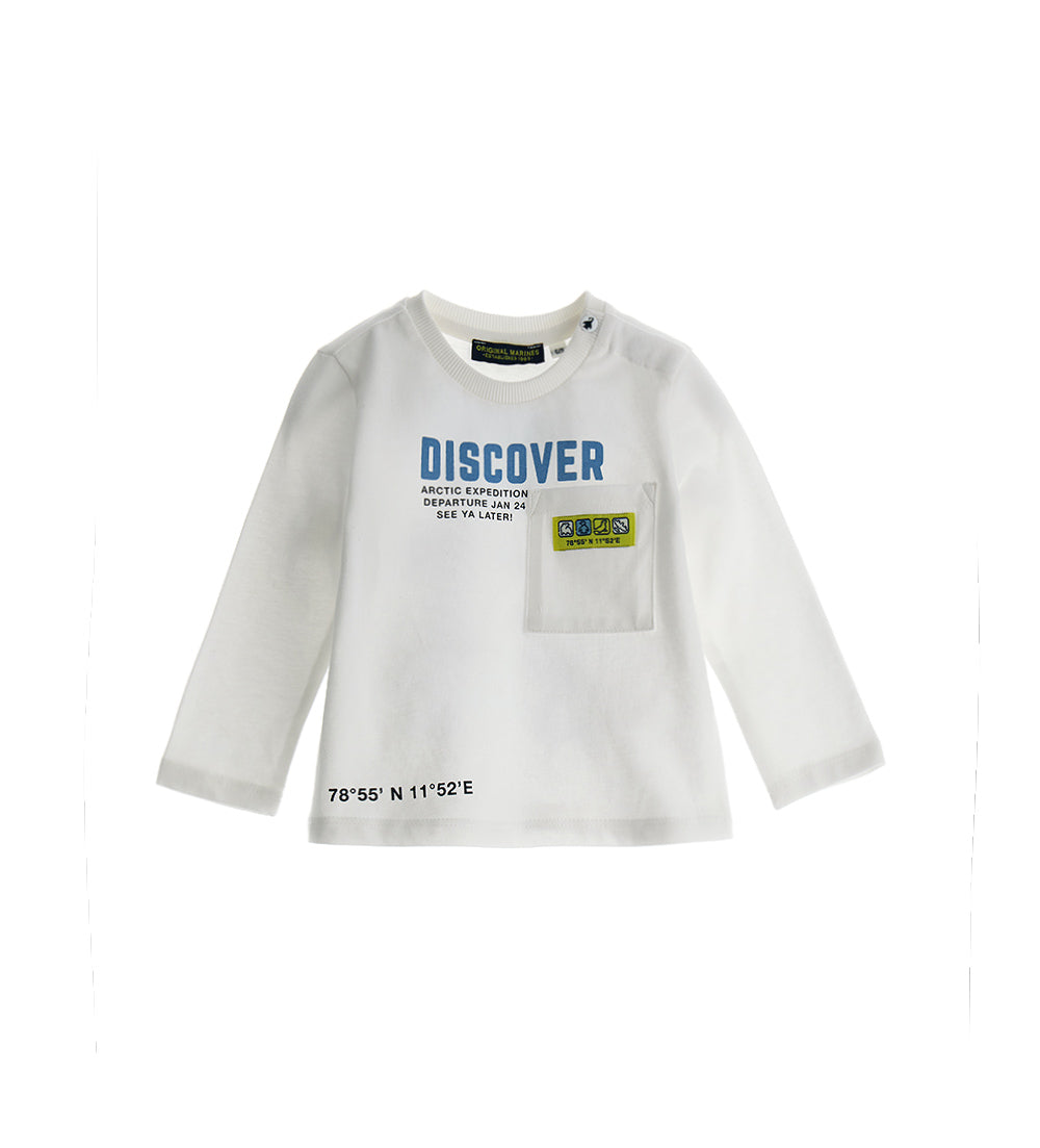 T-shirt ras du cou en coton à manches longues avec ouverture aux épaules par bouton-pression et poche avant.
