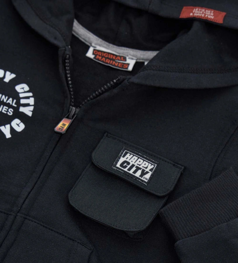 Sweat-shirt chaud en coton mélangé avec capuche, ouverture zippée, finitions côtelées, poche avant et patchs en nylon sur les manches.