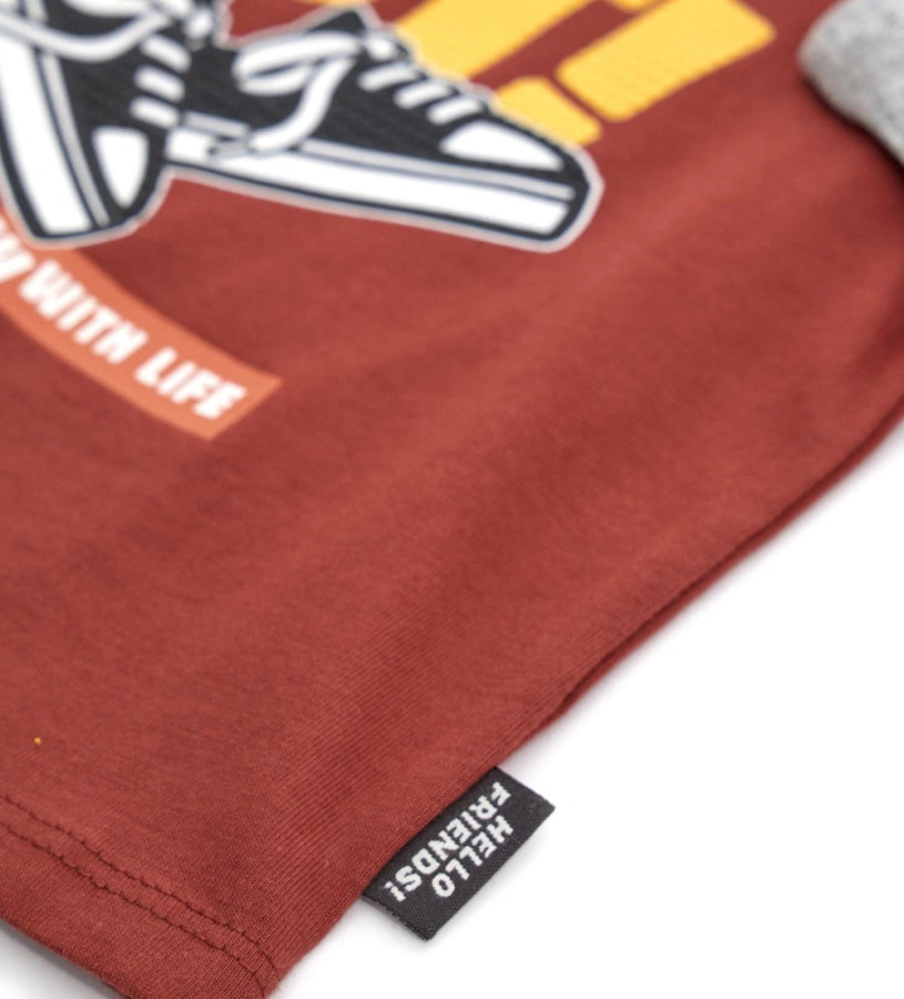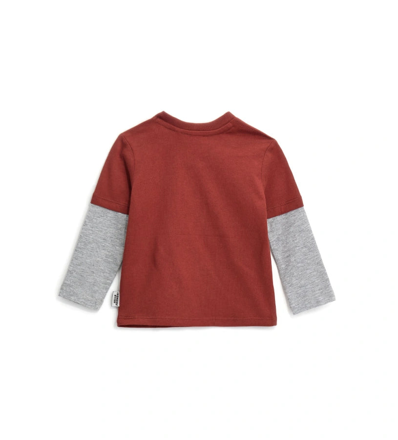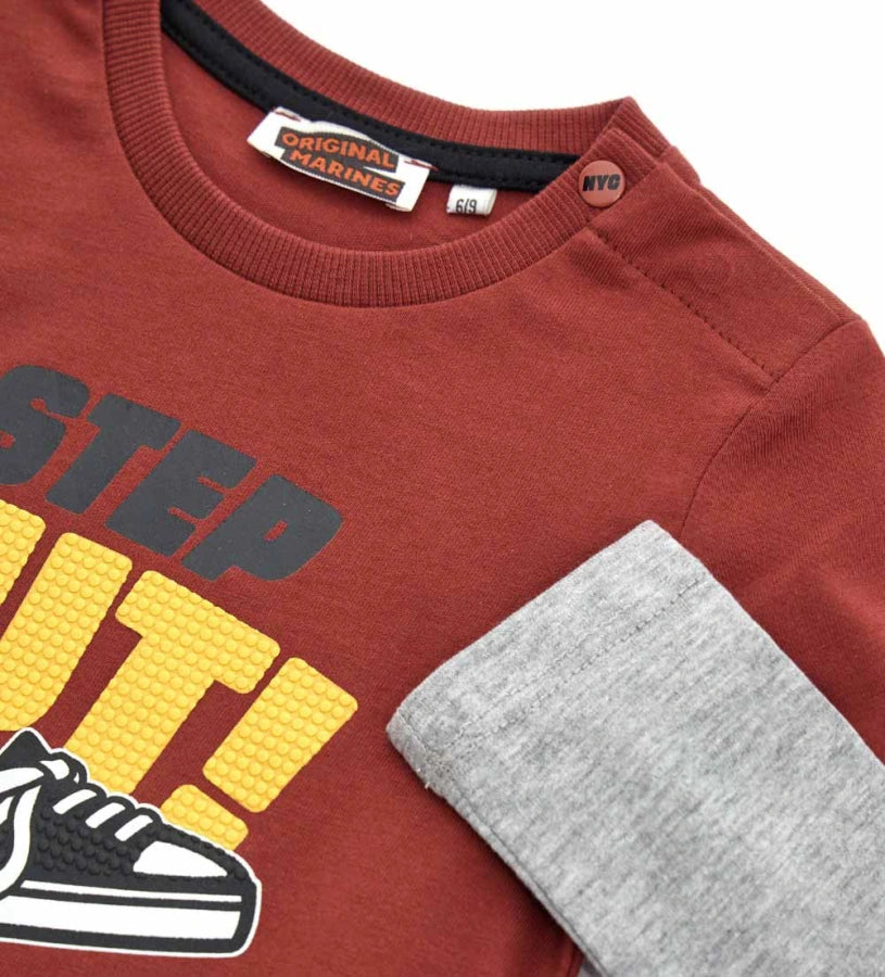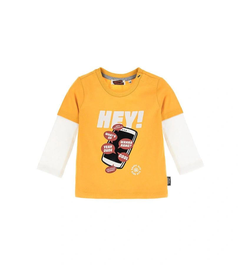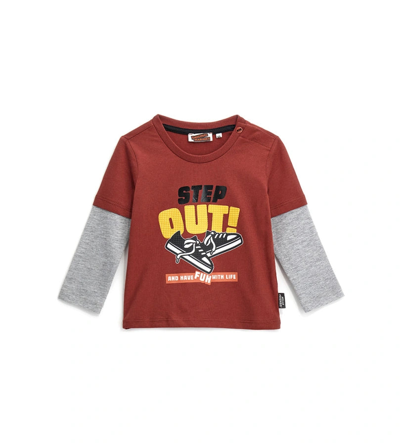 T-shirt ras du cou en coton chaud superposé avec ouverture sur l’épaule par boutons pression et imprimé sur le devant.