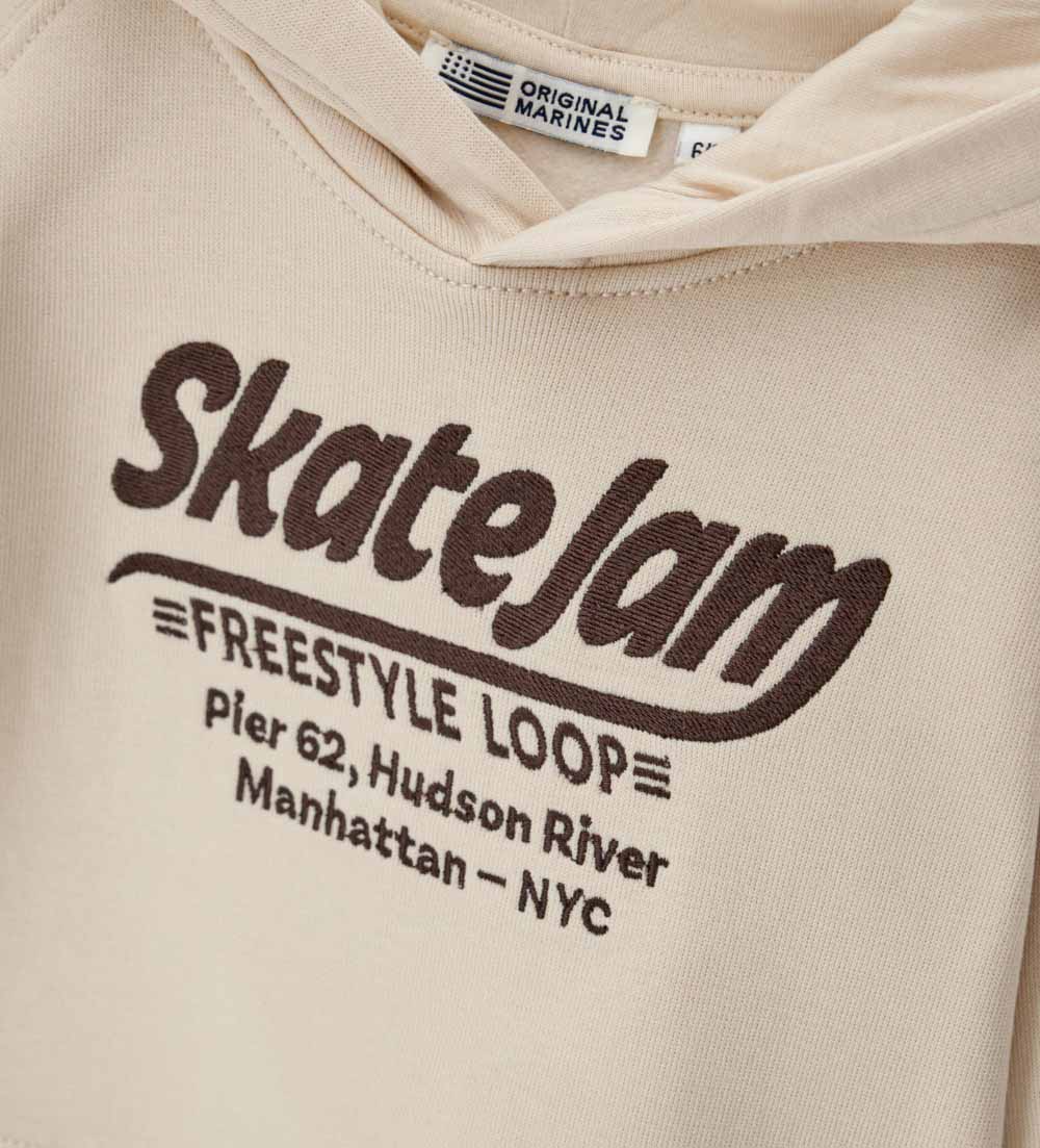 Sweat à capuche chaud en coton, idéal pour vos tenues de tous les jours. Broderie sur le devant, bords-côtes et empiècement contrastant en bas pour une touche d’originalité.