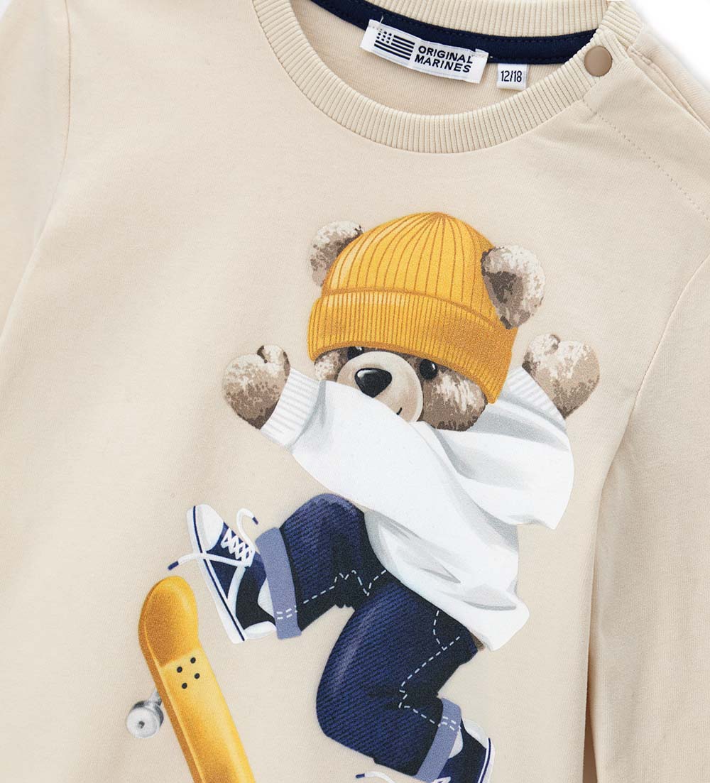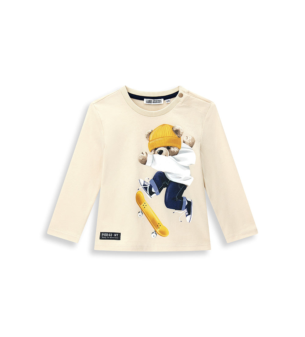 T-shirt à manches longues en coton chaud avec imprimé sur le devant, col rond et finitions côtelées. Jusqu’à 2-3 ans, ouverture pratique par boutons-pression.