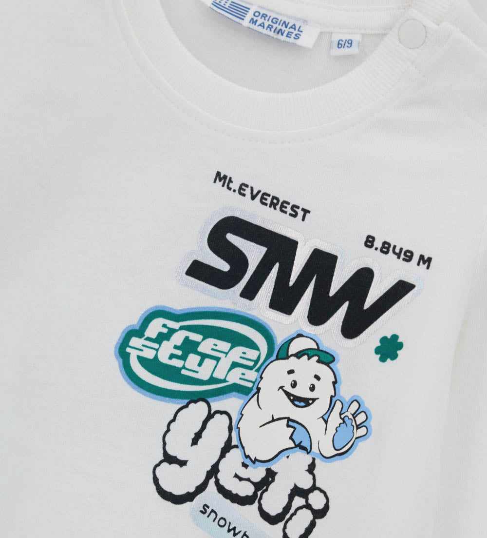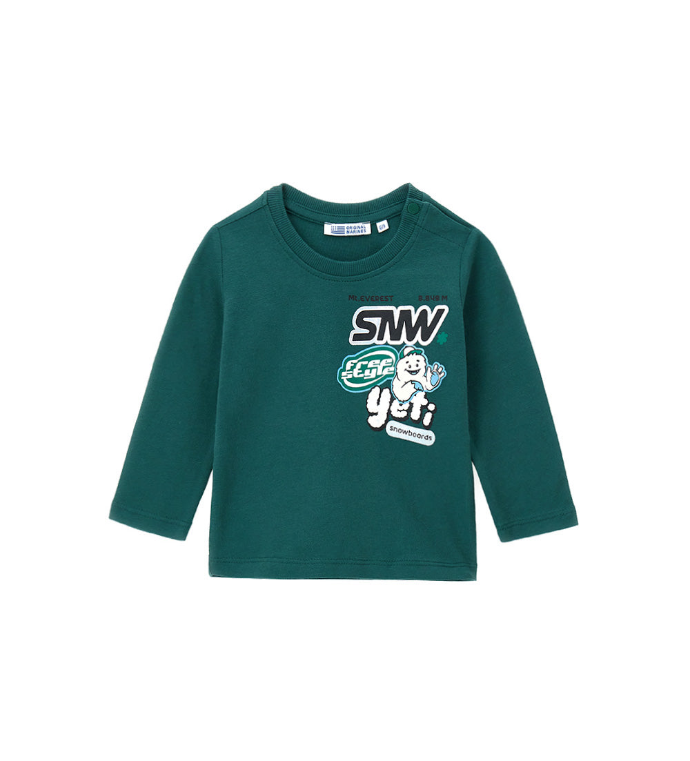 T-shirt à manches longues en coton chaud, col rond, imprimé devant et étiquette brodée au dos. Jusqu’à 2-3 ans, ouverture confortable par boutons-pression.