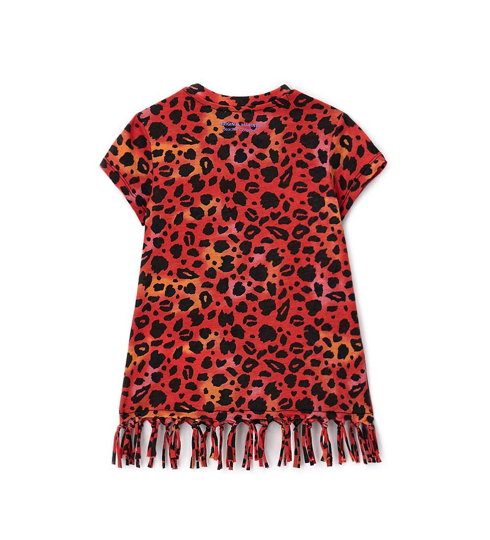 Veste de plage en coton avec imprimé animal, taille élastiquée et bordure à franges colorées.