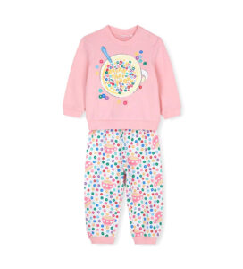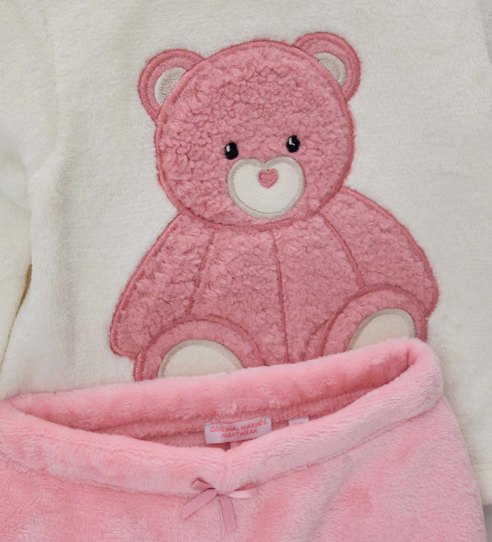 Pyjama en fourrure avec t-shirt col rond, appliqué décoratif, bord-côte et ouverture à l’épaule. Pantalon bord-côte avec nœud sur le devant.