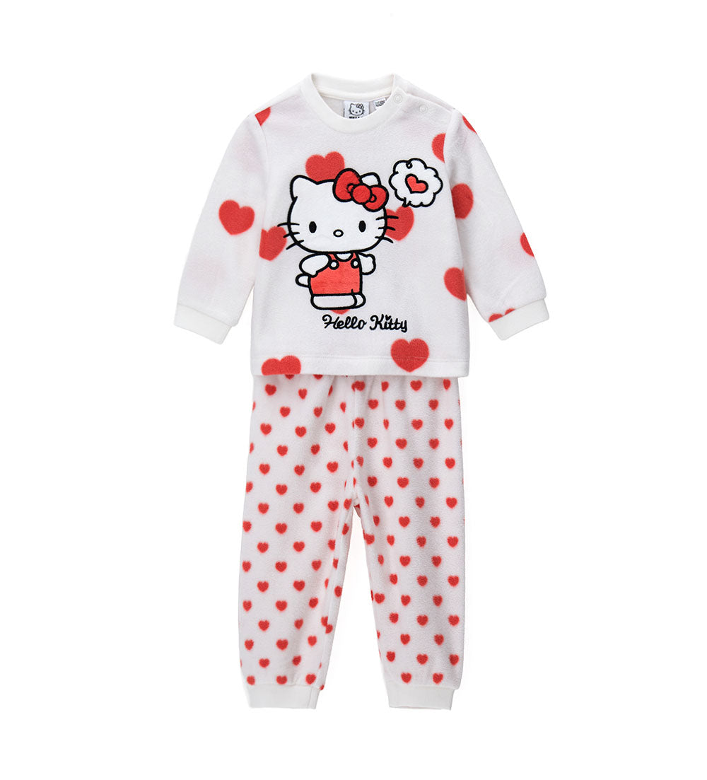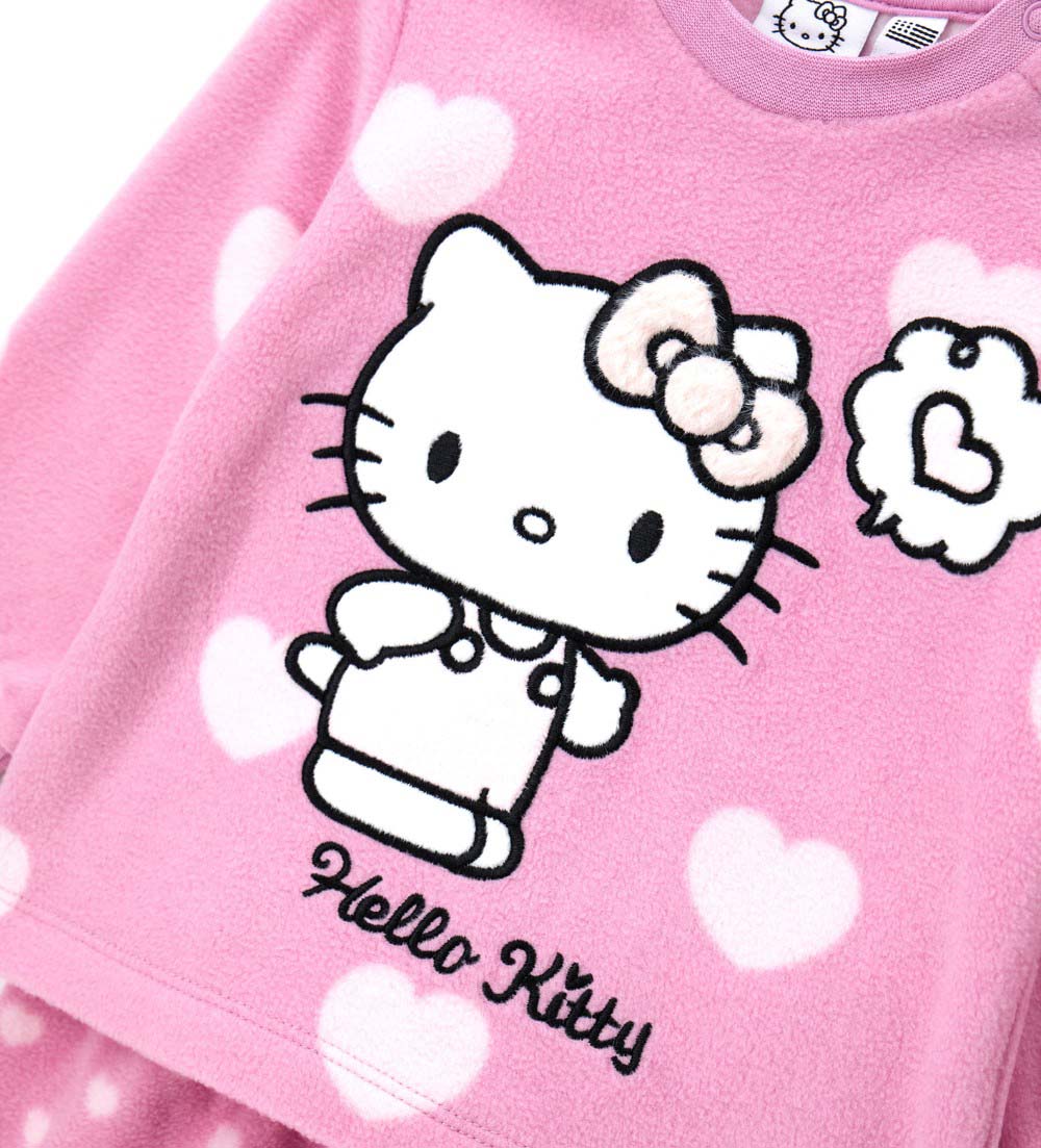 Pyjama Hello Kitty en polaire douce avec t-shirt à col rond, imprimé all-over, application sur le devant, ouverture aux épaules et finitions côtelées et pantalon assorti avec nœud et imprimé all-over.