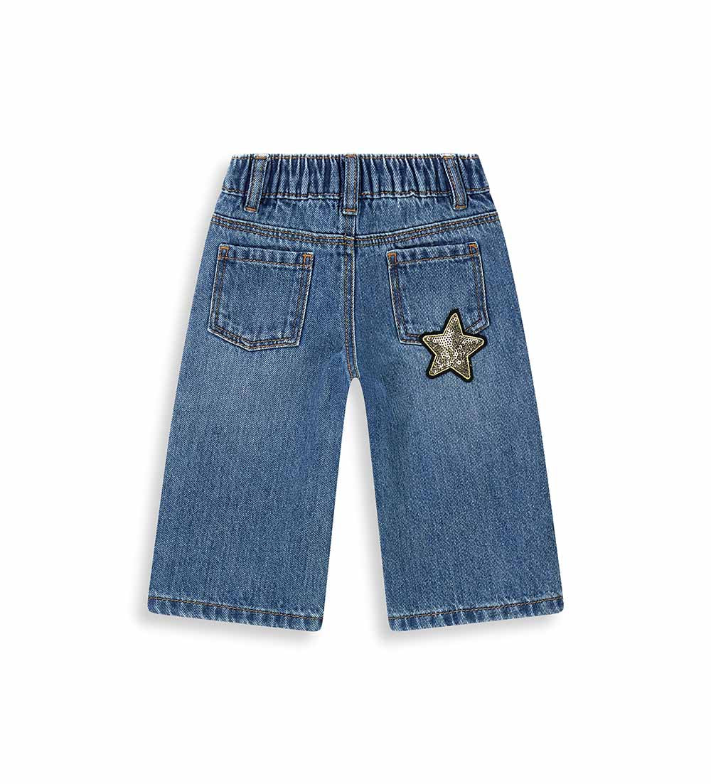 Jean large en denim de coton et lyocell, doux et résistant, avec taille élastiquée, déchirures sur le devant avec clous thermocollés, poche ourson et patch étoile pailleté au dos. Jusqu’à 2-3 ans, ouverture par bouton, et à partir de 3-4 ans, ouverture par zip.