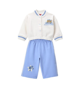 Ensemble de survêtement en molleton de coton doux composé d’un haut avec imprimé all-over, application sur le devant, bandes sur les manches et ouverture pratique à boutons-pression dans le dos et d’un pantalon style évasé avec bandes latérales.