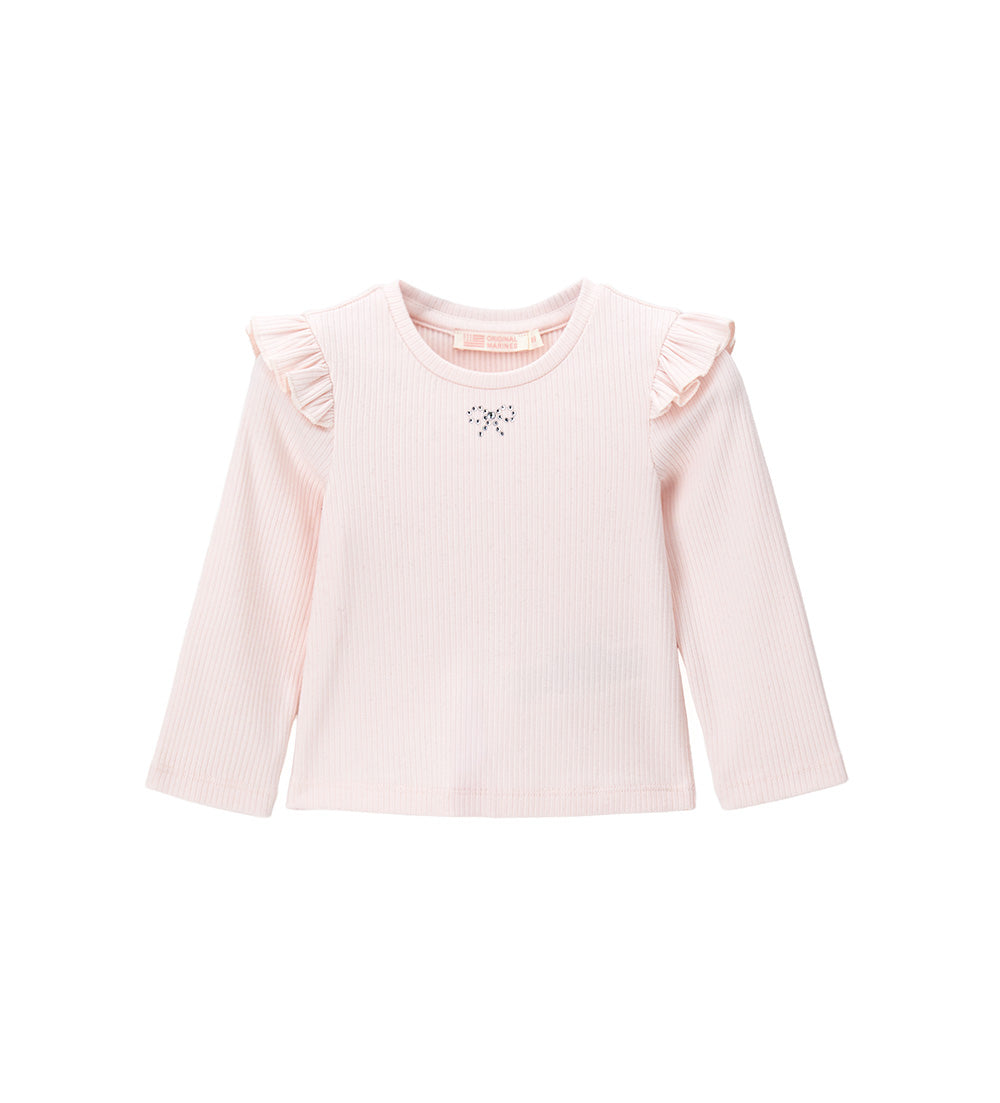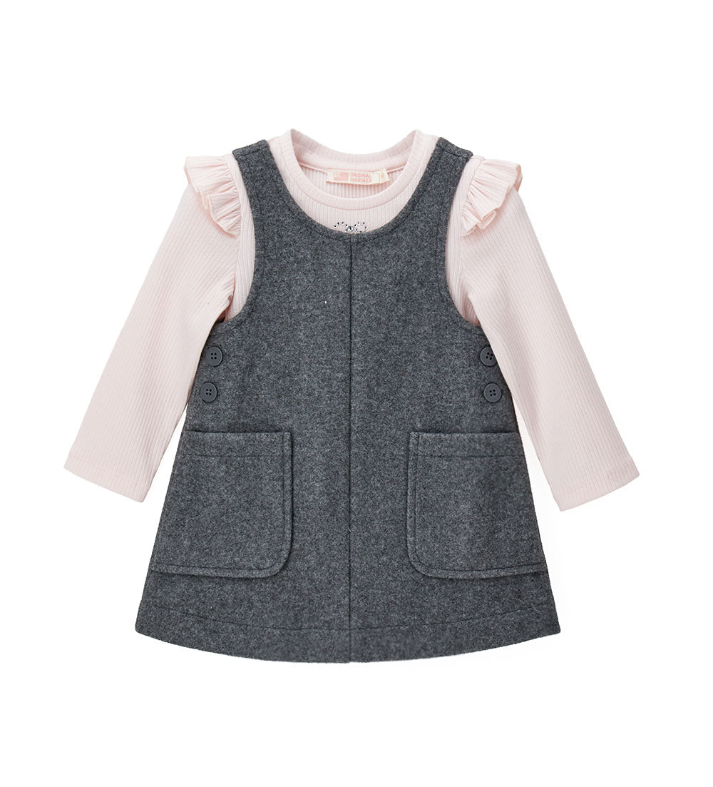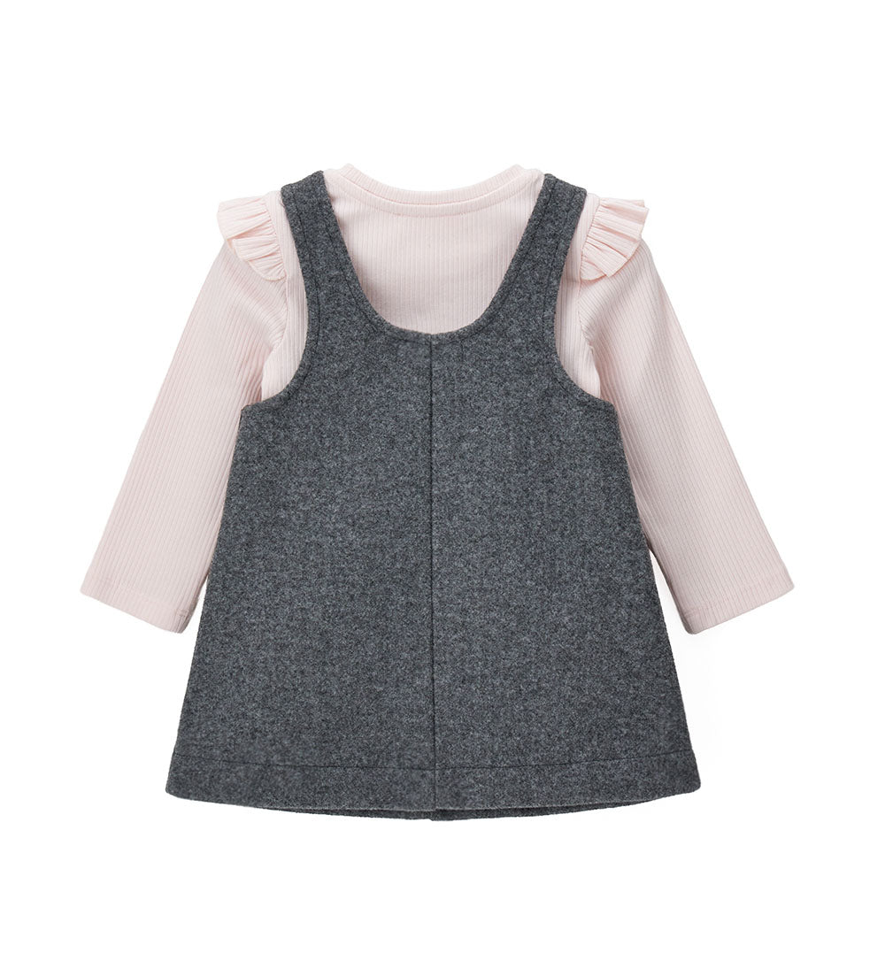 Ensemble composé d’une robe en tissu et d’un t-shirt côtelé à volants aux épaules. Détails en strass sur le devant du t-shirt et boutons latéraux sur la robe pour un look doux et raffiné.