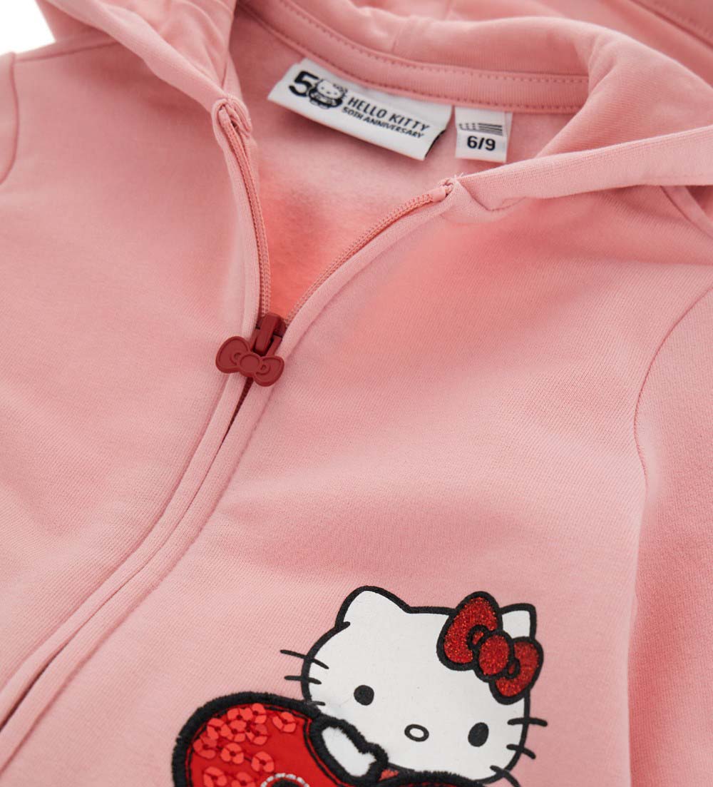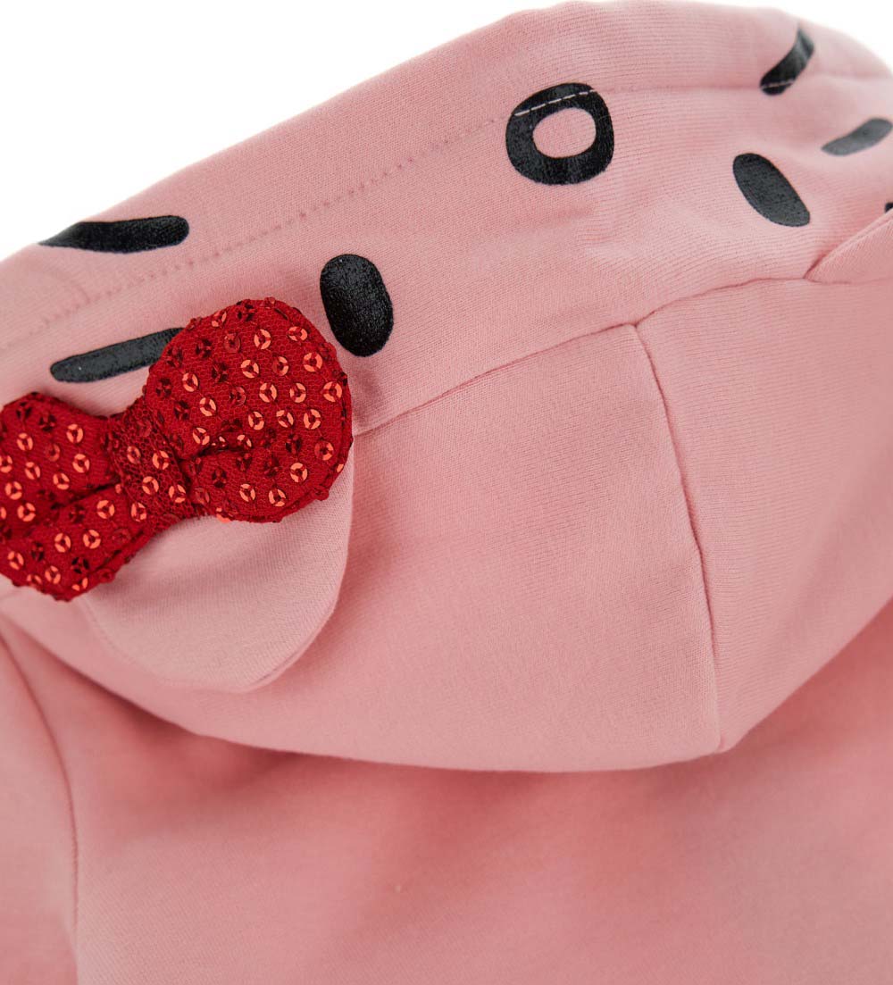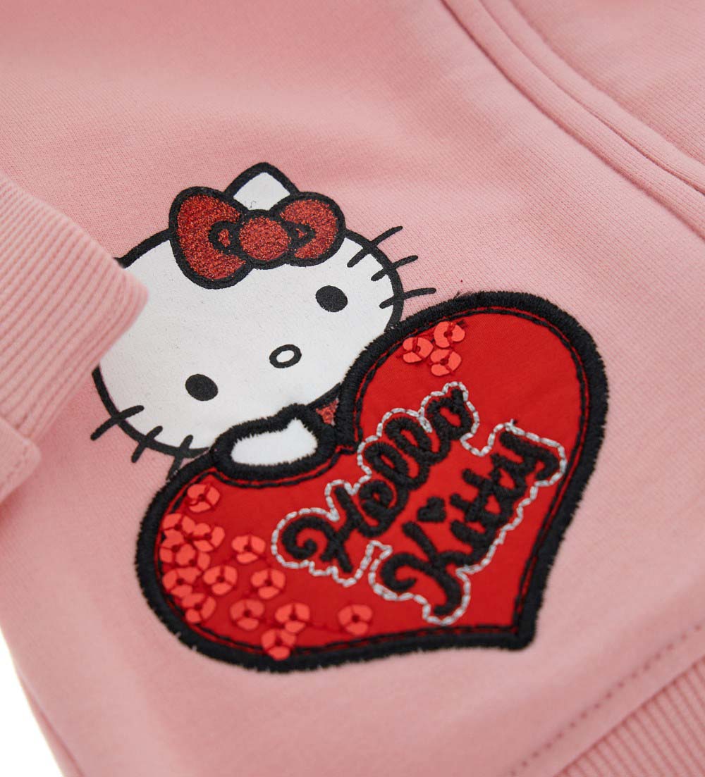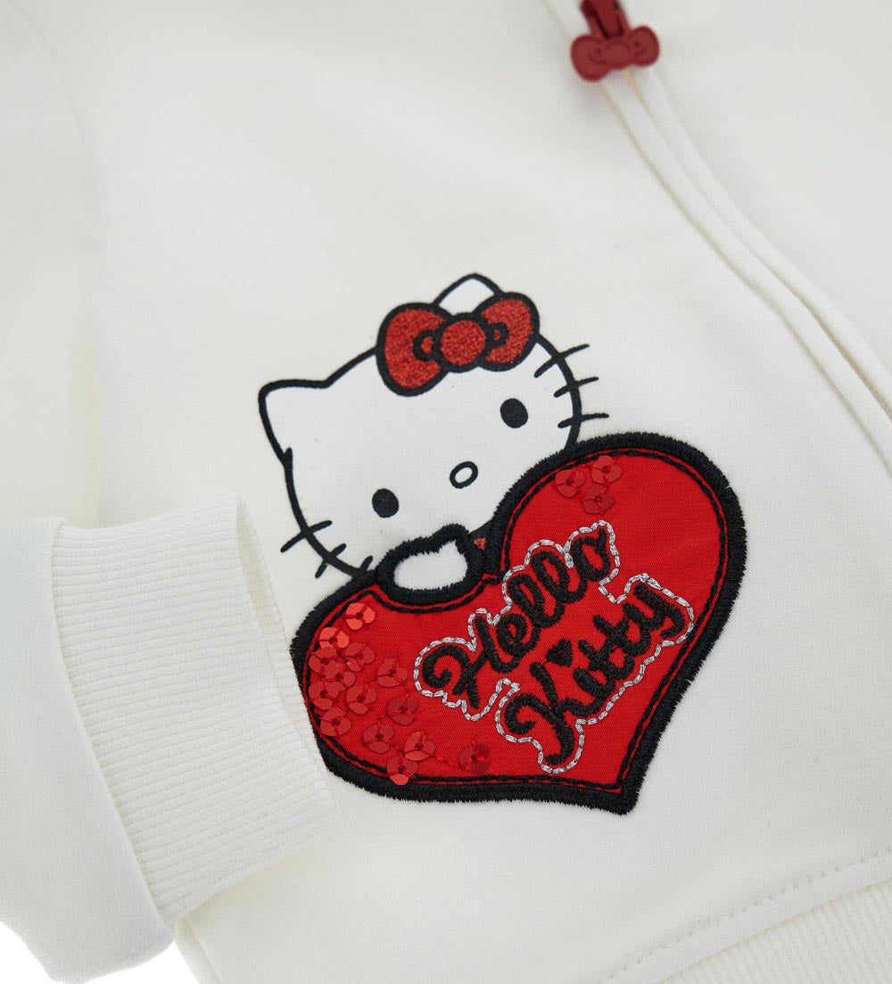 Sweat-shirt Hello Kitty en coton stretch chaud avec capuche doublée coton, manches longues avec finitions côtelées, ouverture zippée, oreilles, flocons et broderies pailletées appliquées sur la capuche.