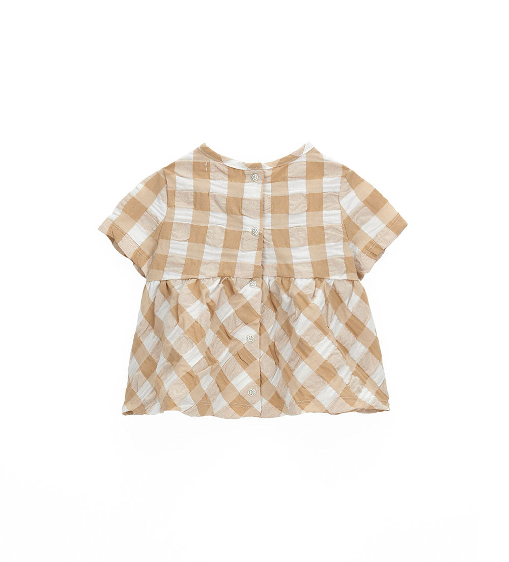 Chemise en seersucker de coton teint en fil avec col ras du cou, manches courtes, fermeture à boutons-pression dans le dos et broderie sur le devant.