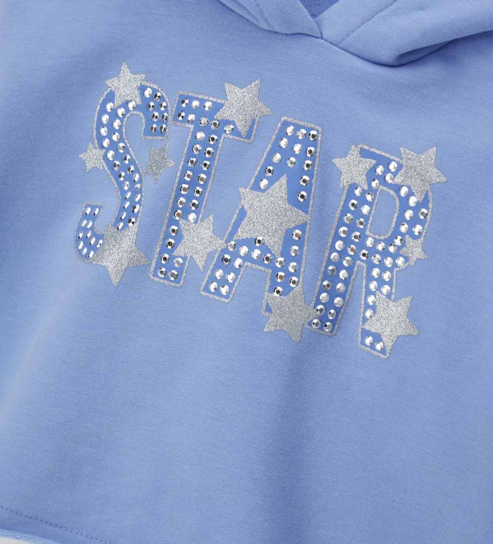 Sweat à capuche en molleton de coton doux avec manches longues, poignets côtelés, joli imprimé avec détails pailletés, clous thermosoudés et étiquette teinte en fil au dos.