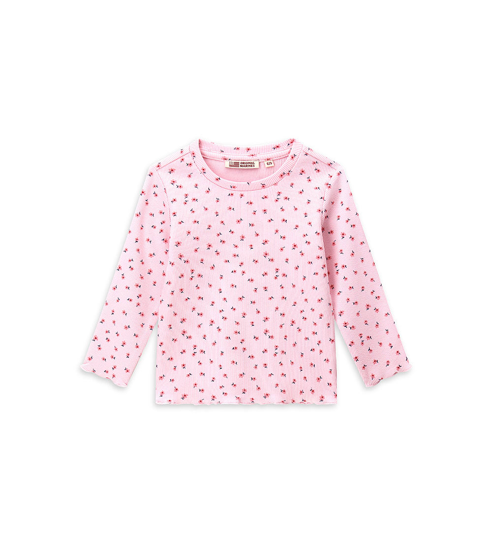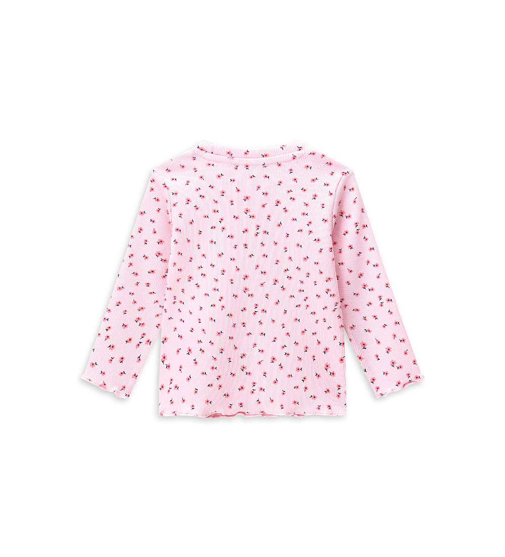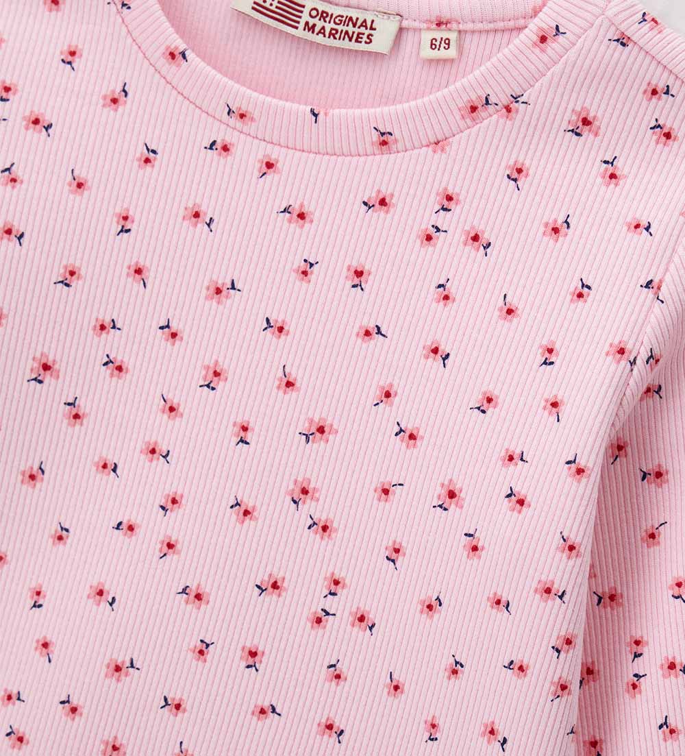 T-shirt en côtes douces, confortable et élastique, avec col rond, manches longues et délicat imprimé all-over de micro-fleurs. Jusqu’à 2-3 ans, ouverture boutonnée confortable.