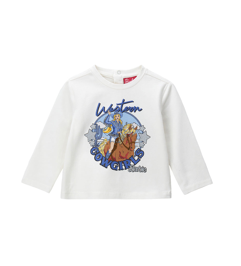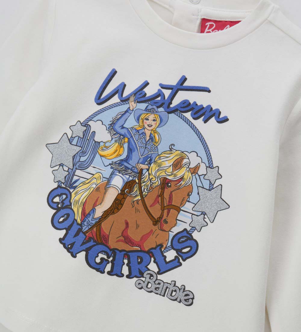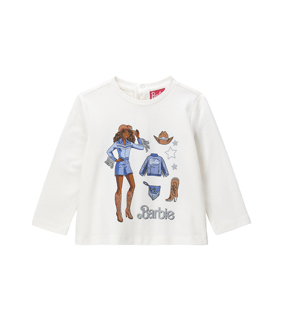 T-shirt Barbie en coton extensible, col rond, manches longues et imprimé Barbie avec détails pailletés. Jusqu’à 2-3 ans, ouverture confortable avec boutons.