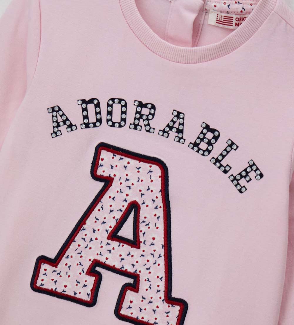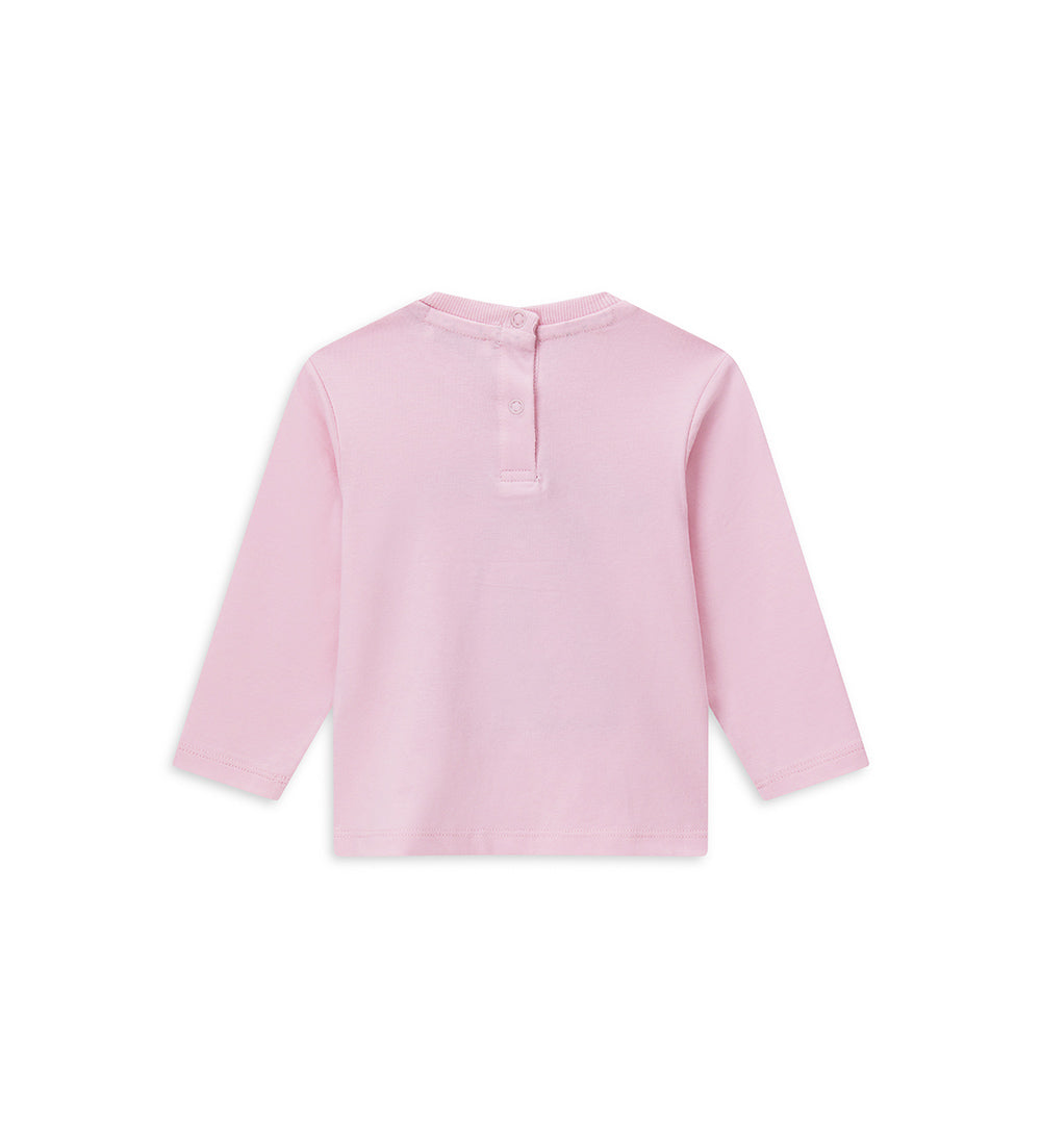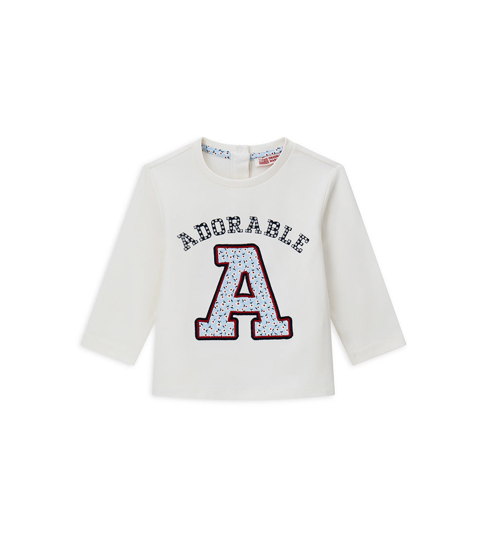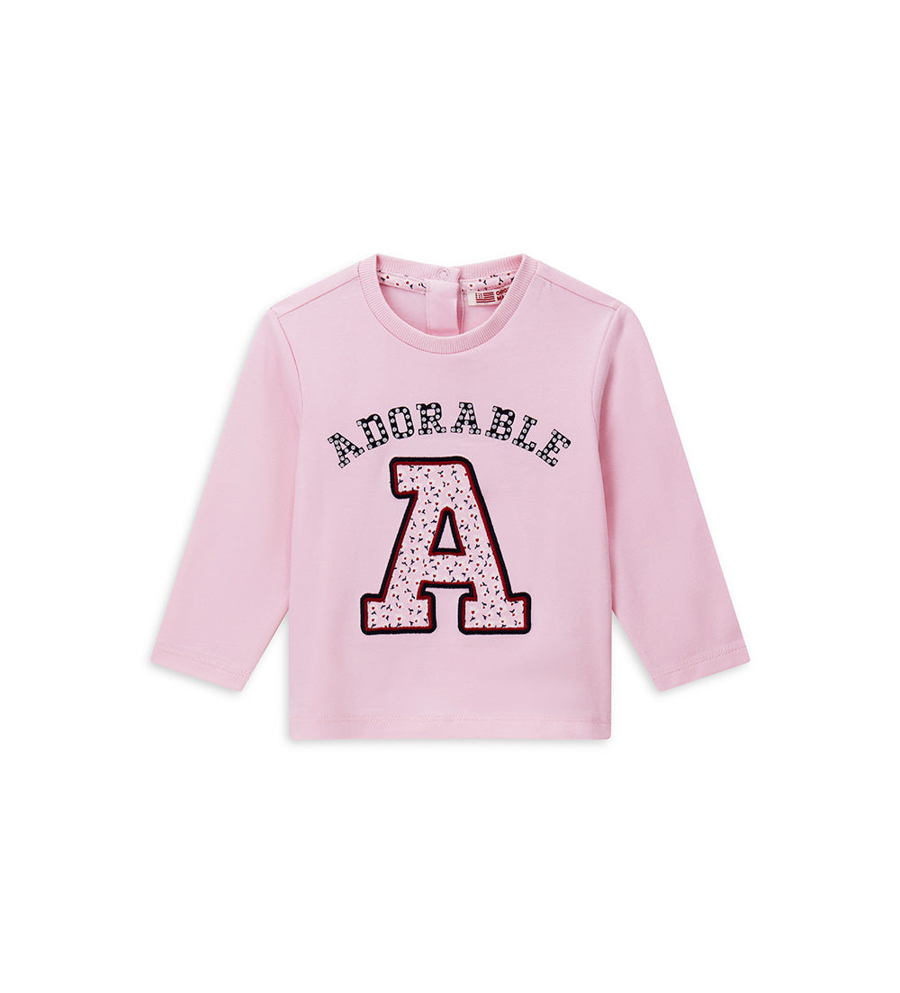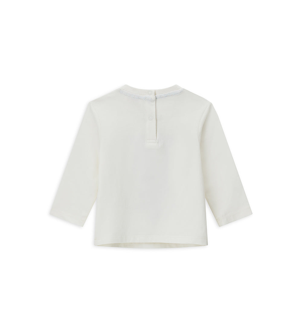 T-shirt en coton stretch doux, col rond, manches longues et imprimé décoratif avec applications pailletées et sequins éclatants. Disponible jusqu’à 2-3 ans, il est doté d’une ouverture boutonnée confortable.