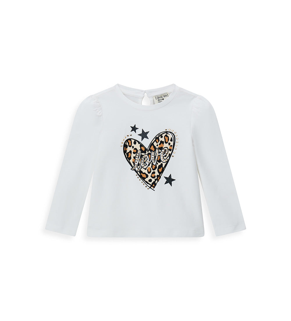 T-shirt en coton extensible, doux et confortable. Col rond, manches longues froncées et ouverture goutte d’eau au dos. Cœur imprimé à pois, paillettes et clous thermocollés.