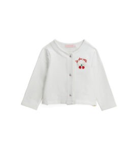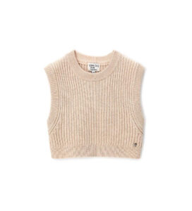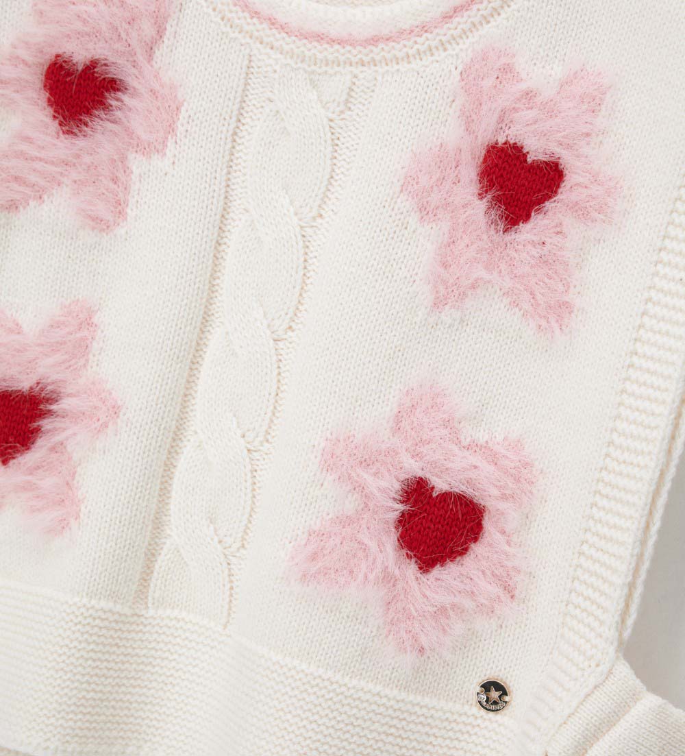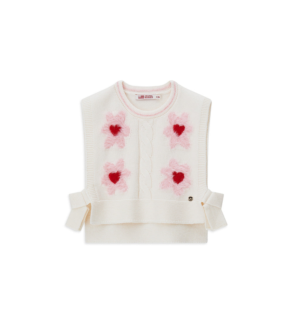 Gilet en laine mélangée tricotée à col rond, orné de fleurs jacquard et de nœuds sur les côtés. Doux et raffiné, idéal pour une touche de douceur supplémentaire.