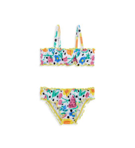 Bikini de bain en lycra à motifs tropicaux avec haut à bretelles réglables et ouverture à crochet transparent et slip avec nœuds latéraux et doublure intérieure.