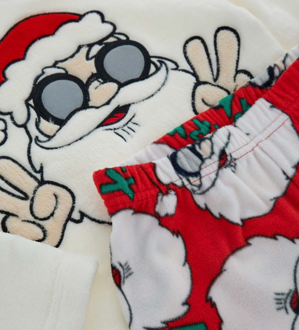 Pyjama à manches longues avec t-shirt en polaire effet fourrure, col ras du cou côtelé et patch sur le devant. Pantalon long à imprimé all-over et finitions côtelées.