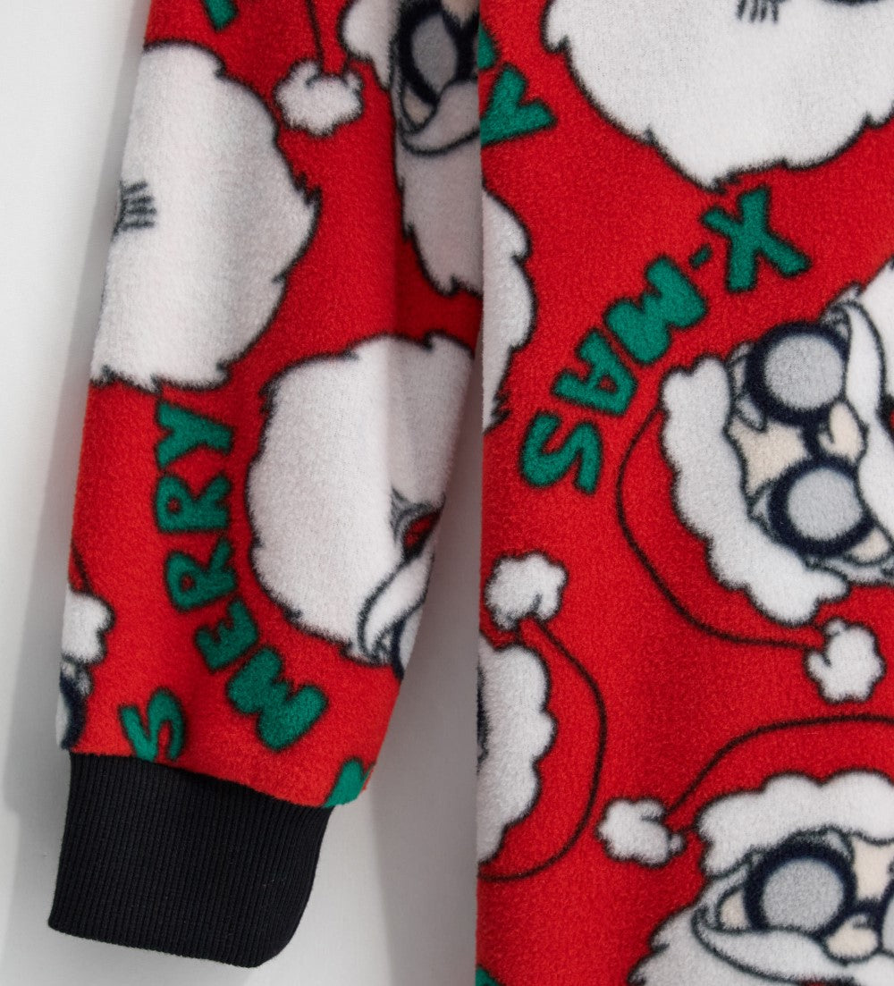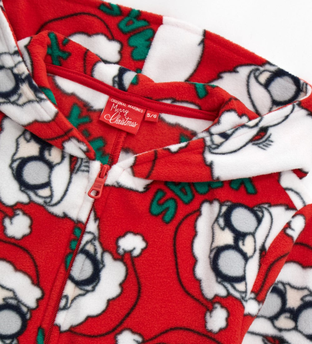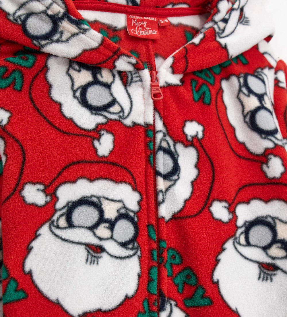 Pyjama une pièce en polaire avec imprimé all-over, capuche, manches longues, ouverture zippée sur le devant et finitions côtelées.