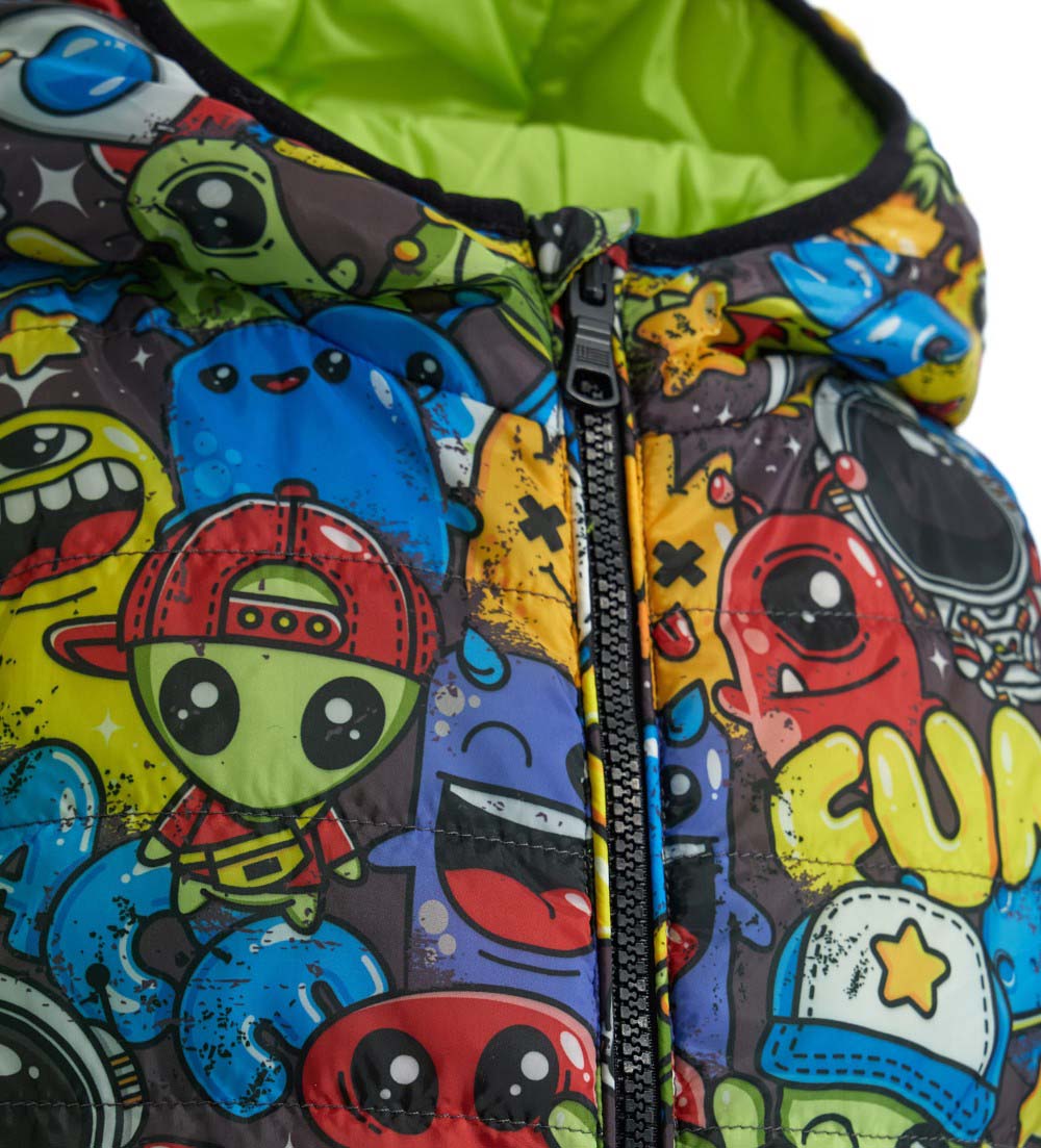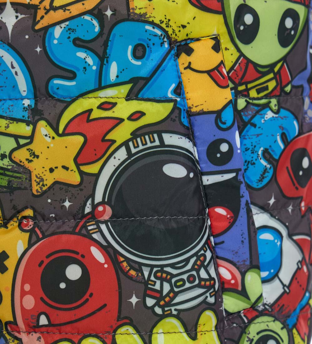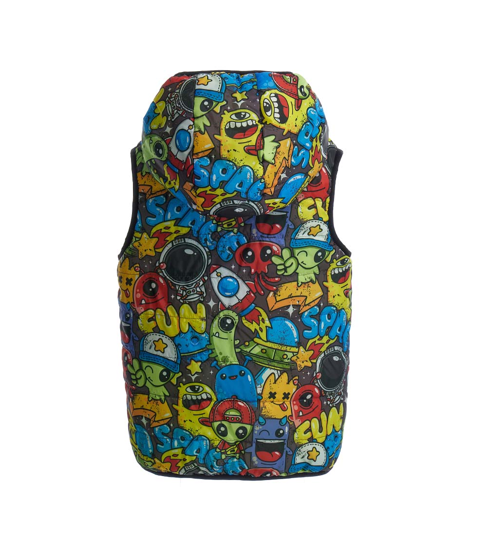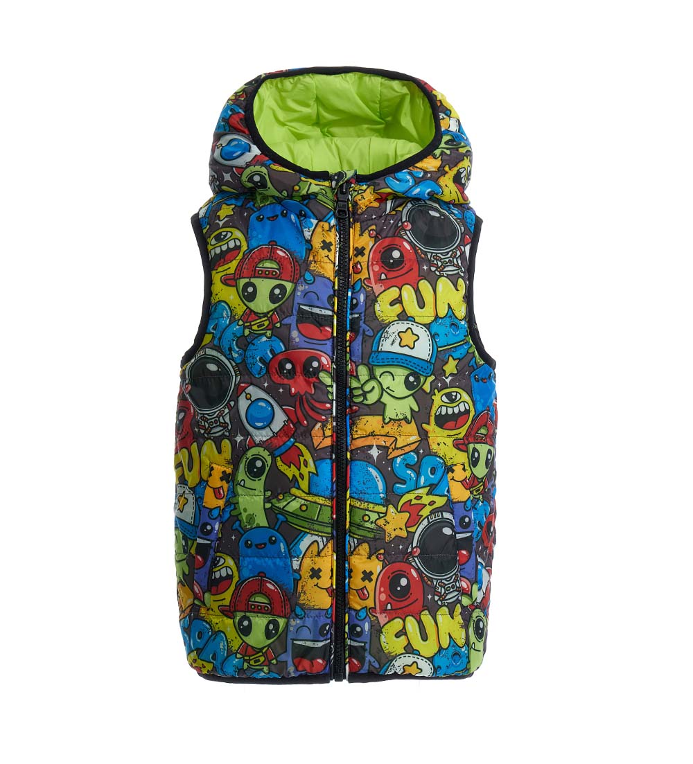 Veste sans manches réversible en nylon matelassé avec imprimé intégral côté A et côté B de couleur unie.
