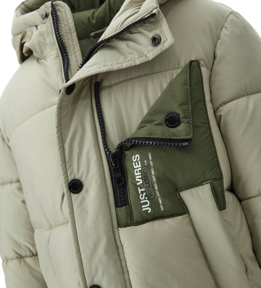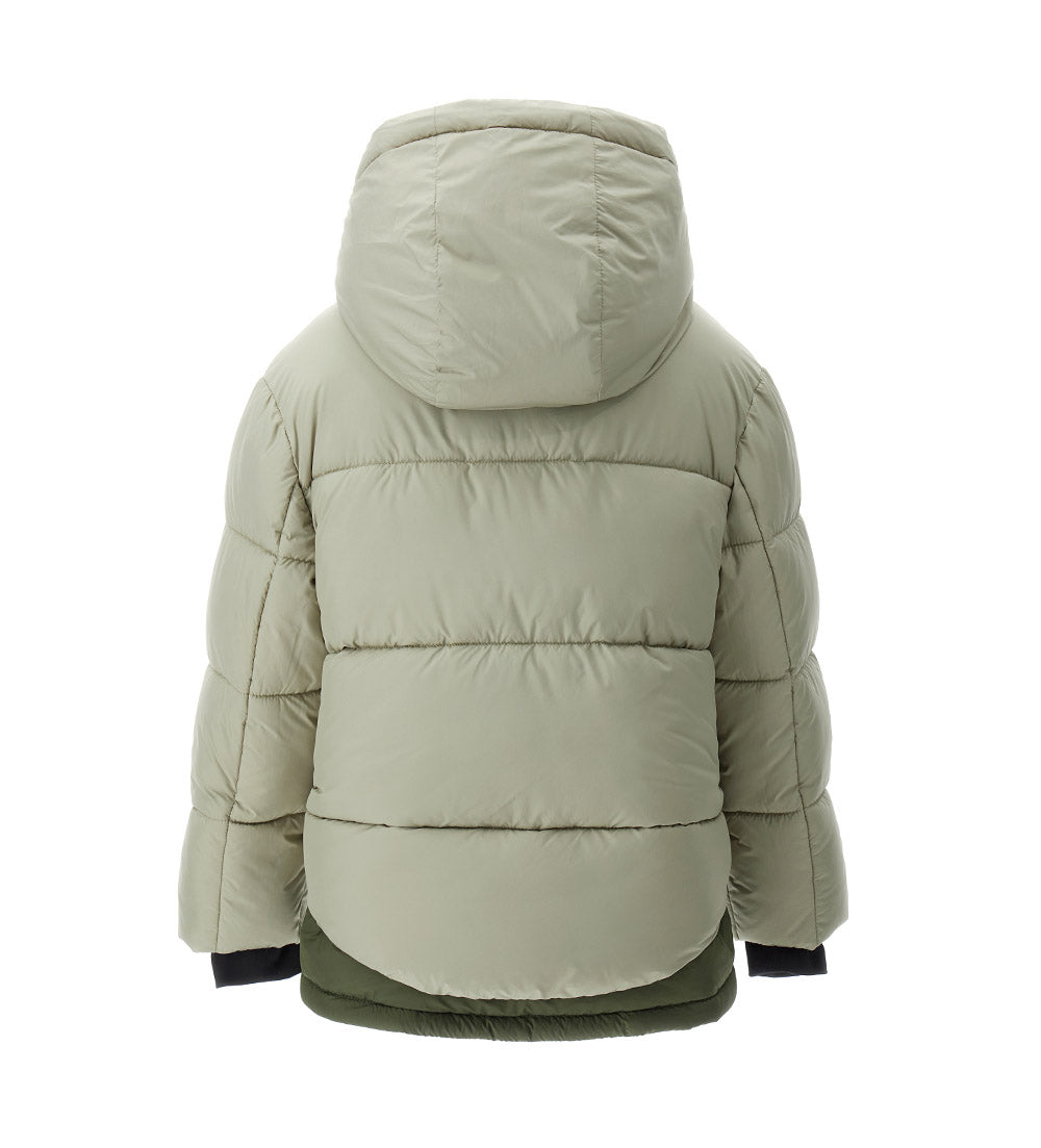Doudoune matelassée à capuche en nylon, empiècements contrastants et poche avant imprimée. Fermeture zippée et à boutons-pression, poignets côtelés.
