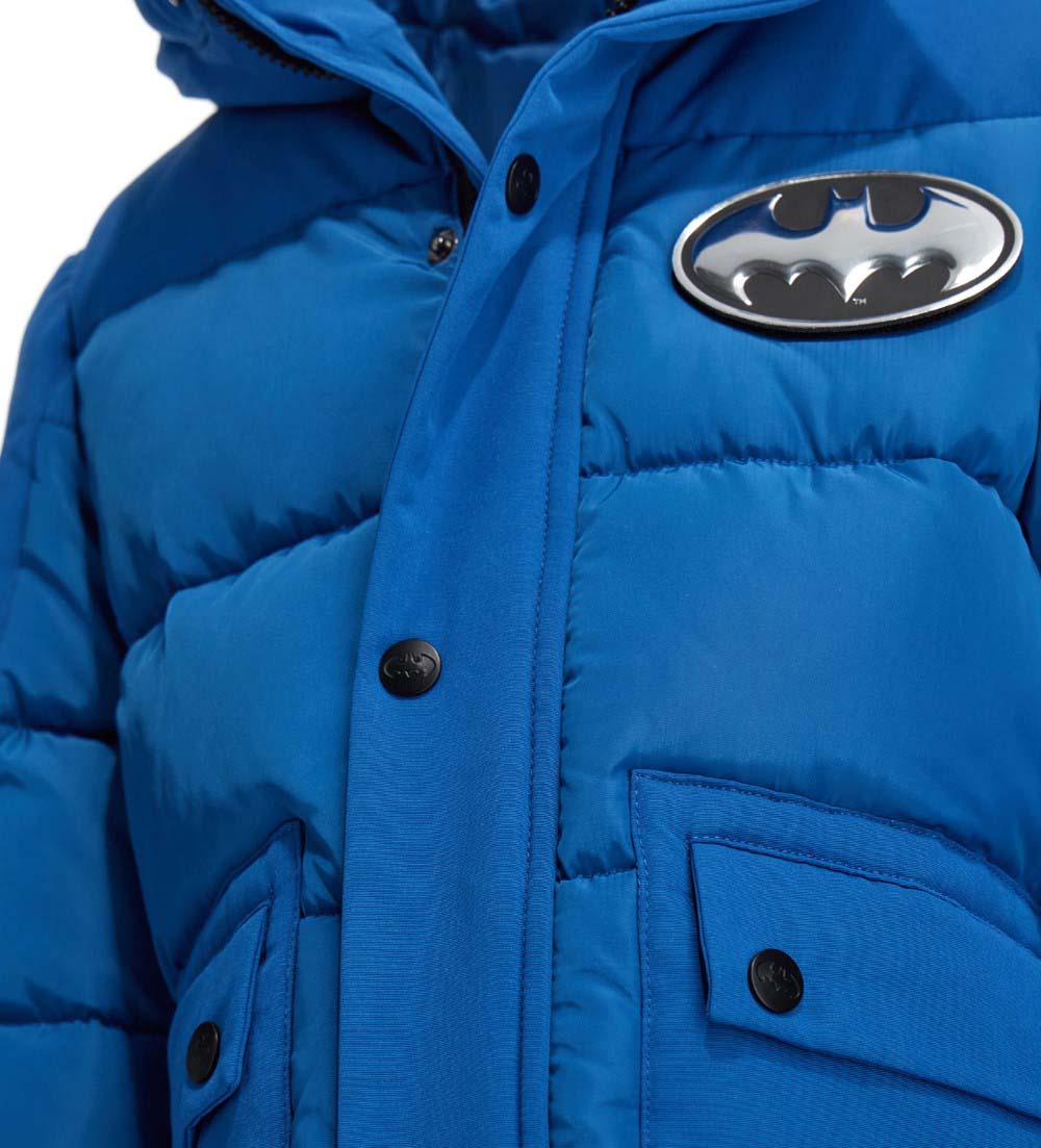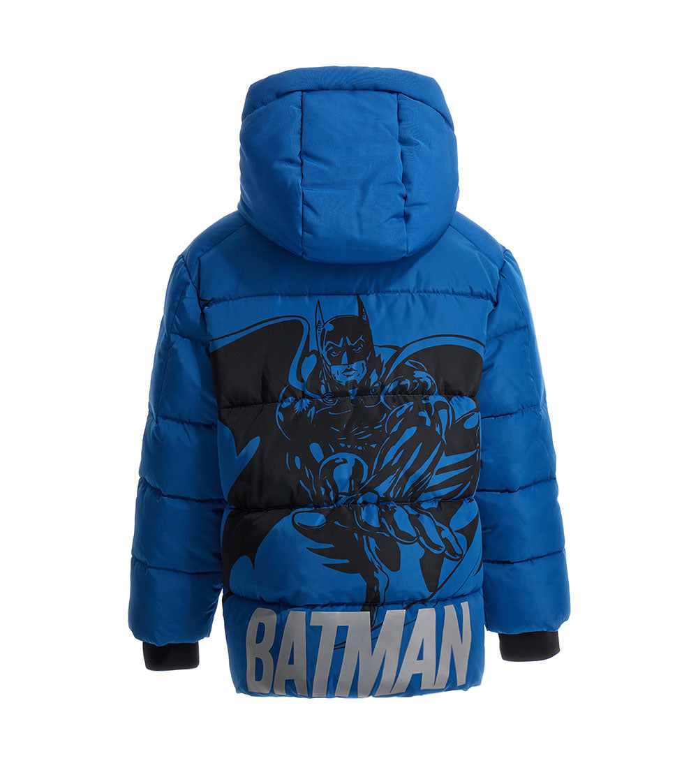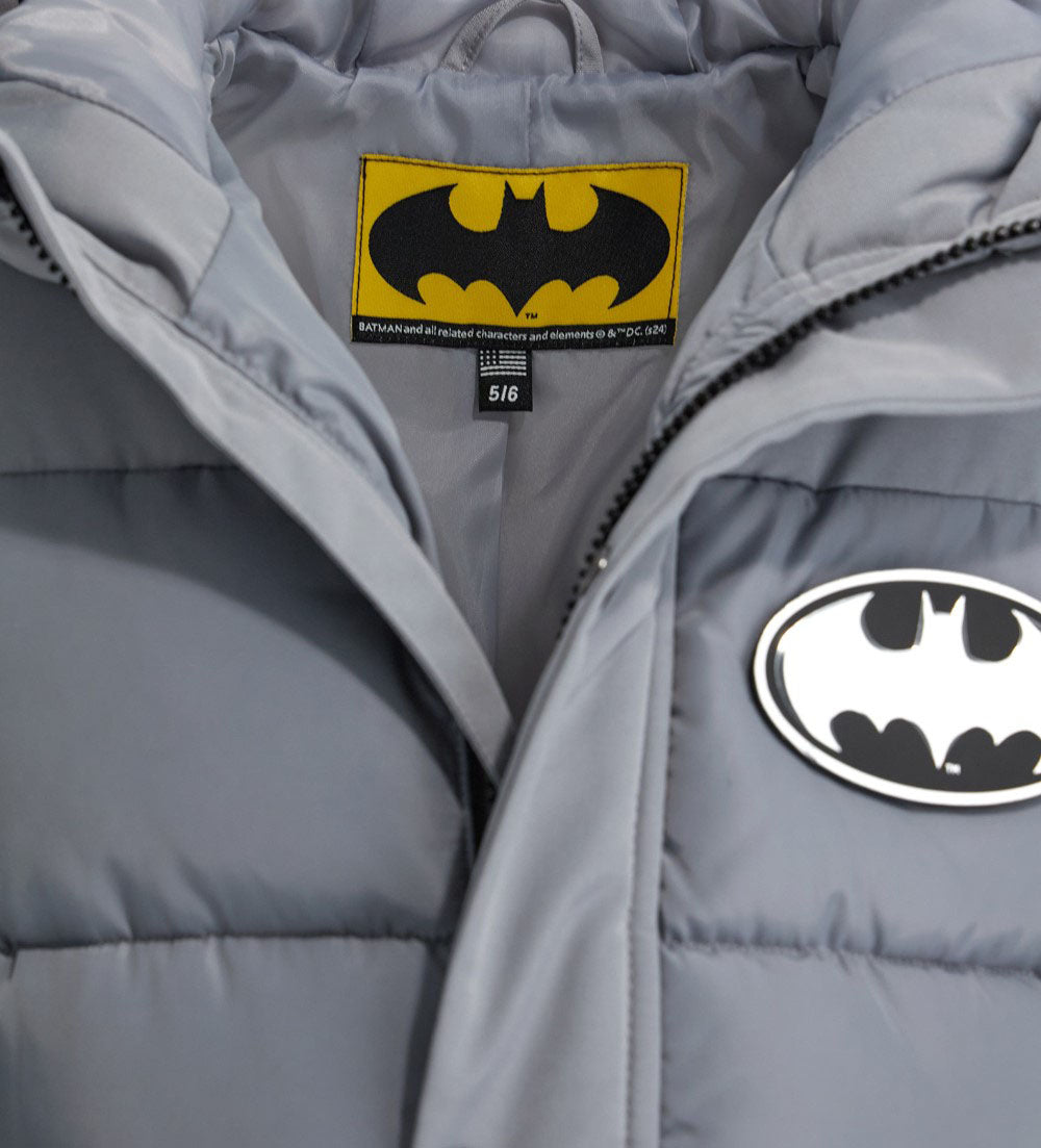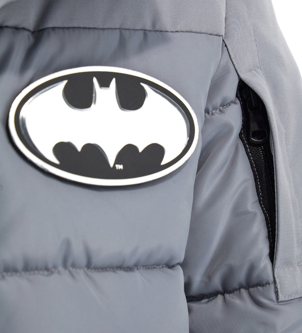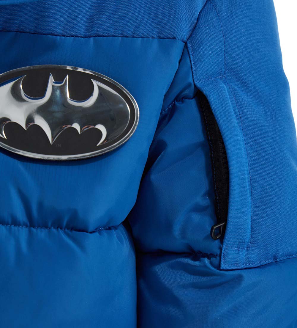 Veste Batman en nylon matelassé avec empiècements en tissu contrasté, ouverture zippée et boutonnée, patch logo Batman sur le devant et imprimé Batman dans le dos.