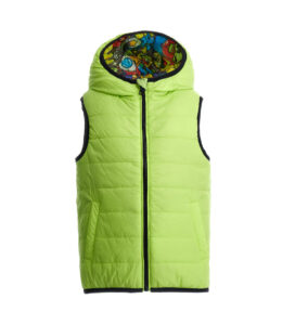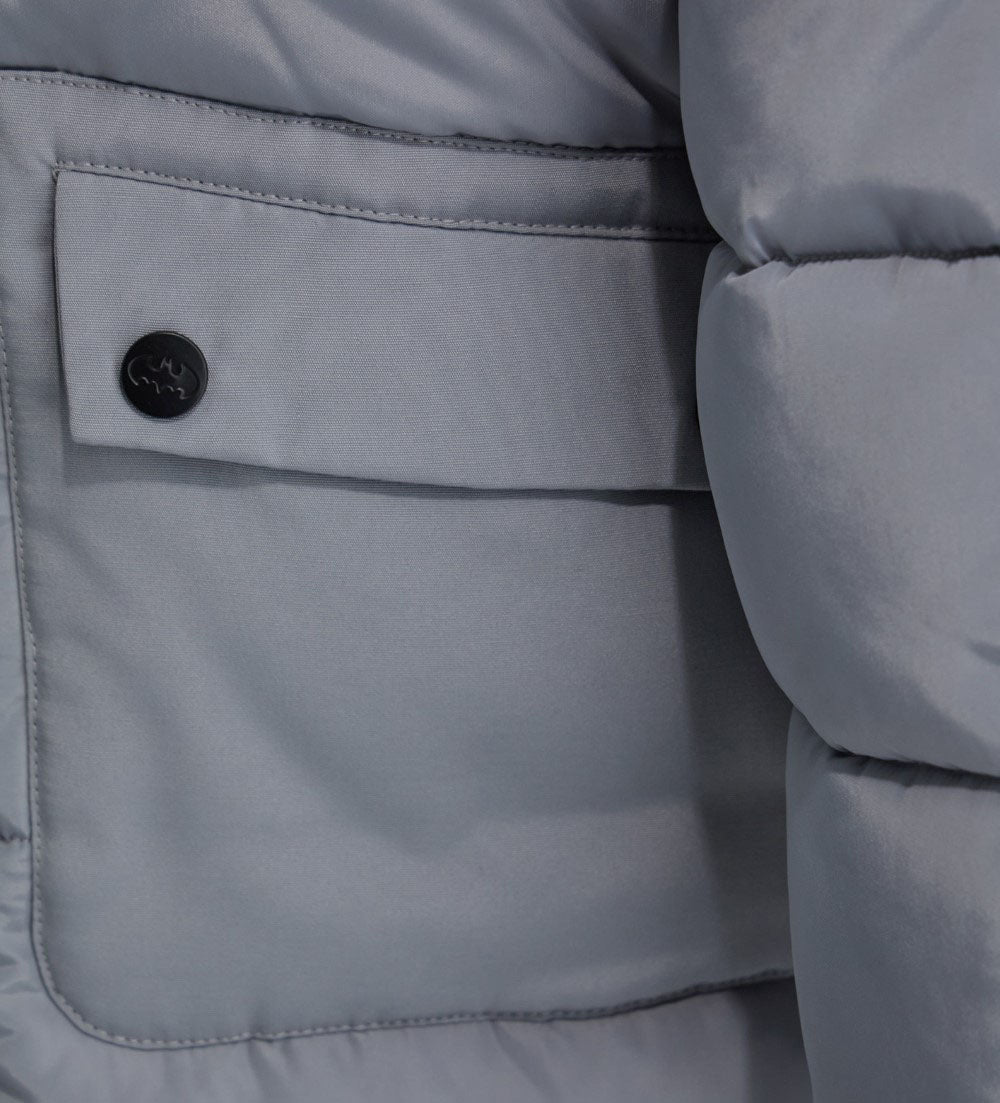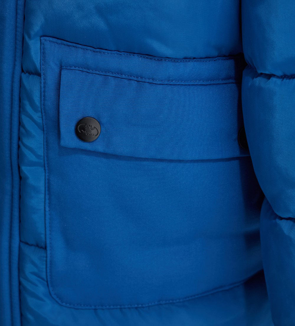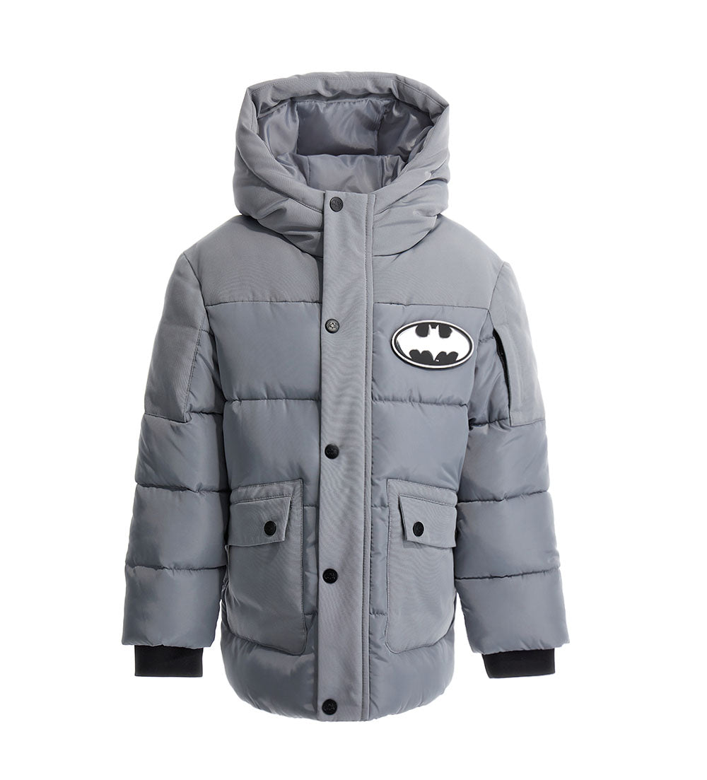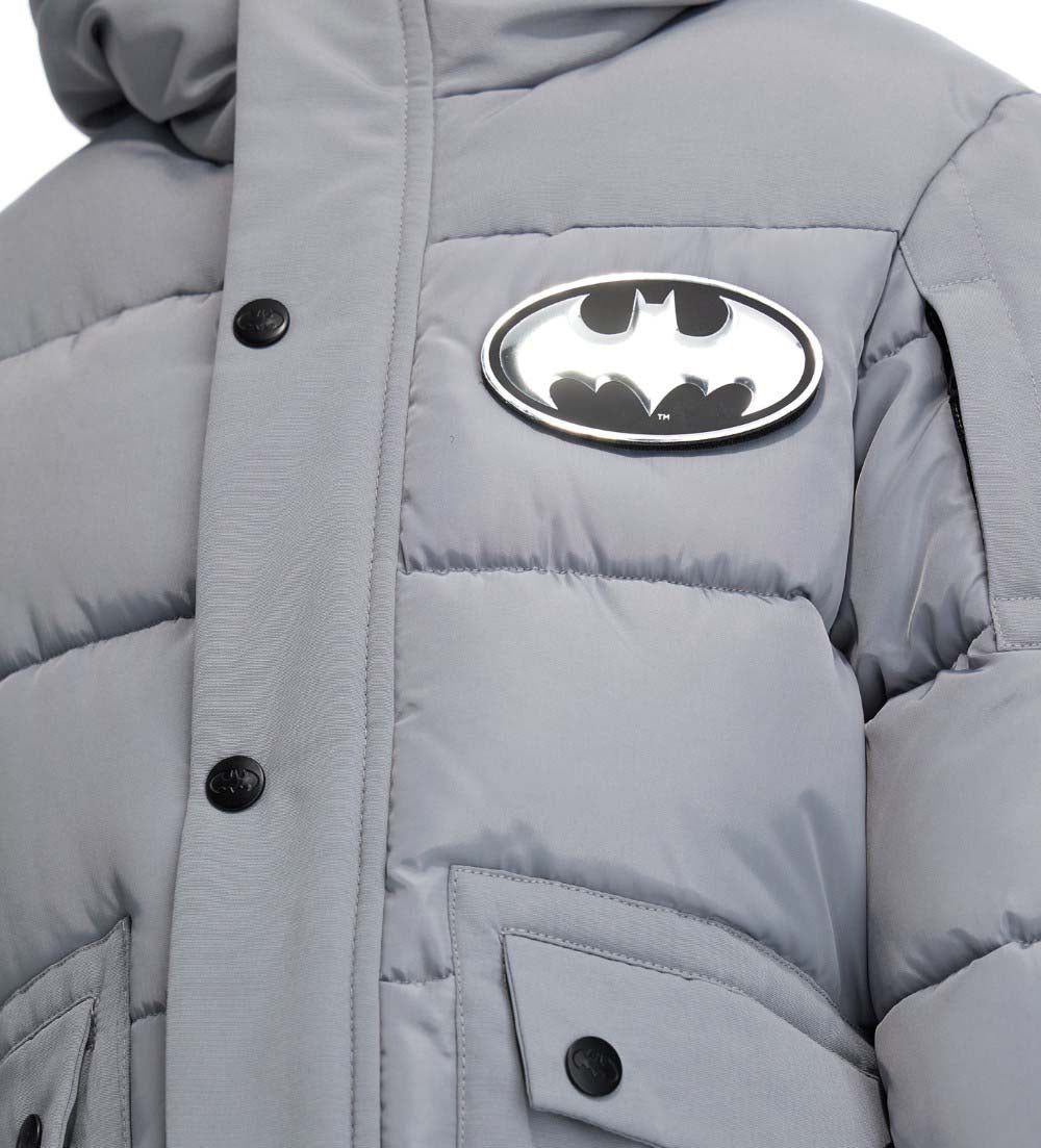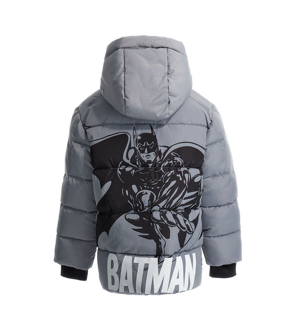 Veste Batman en nylon matelassé avec empiècements en tissu contrasté, ouverture zippée et boutonnée, patch logo Batman sur le devant et imprimé Batman dans le dos.