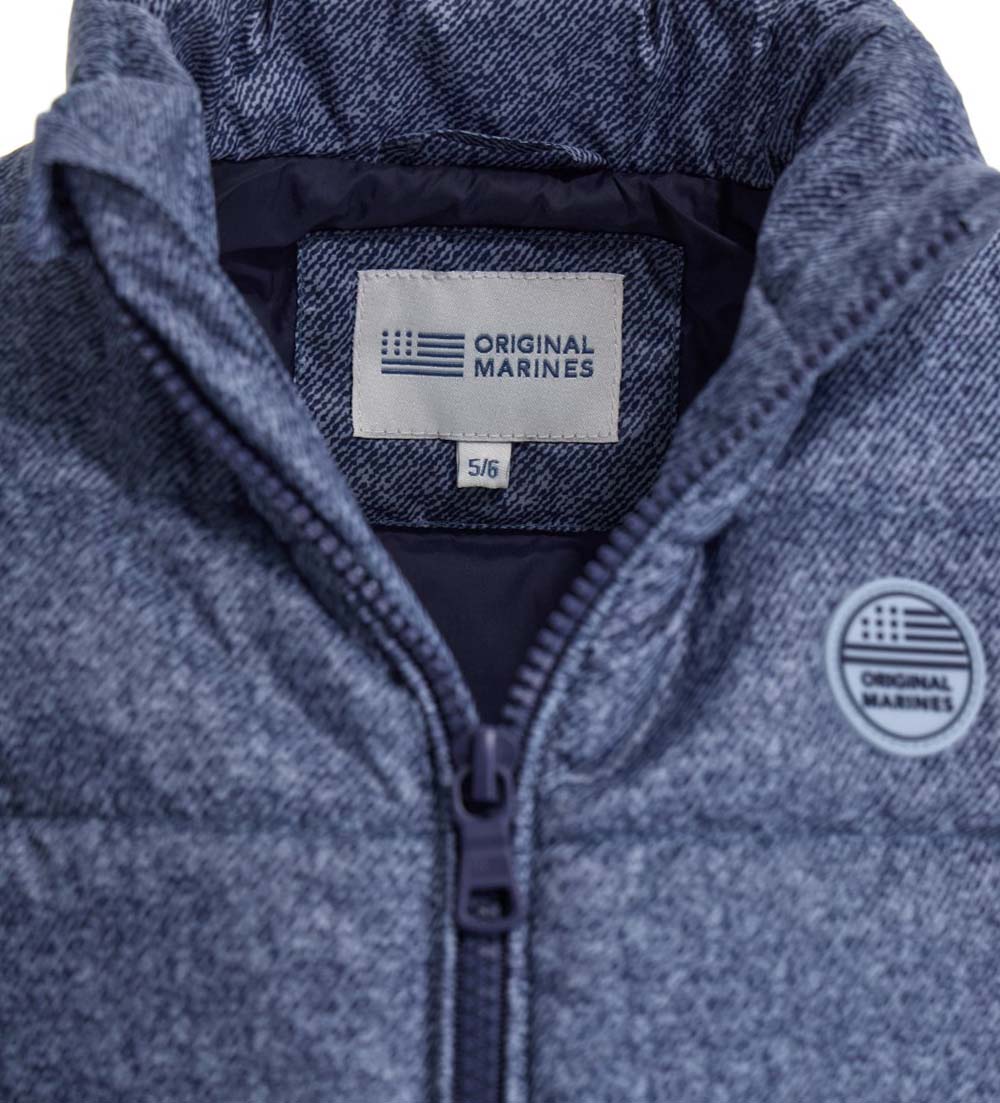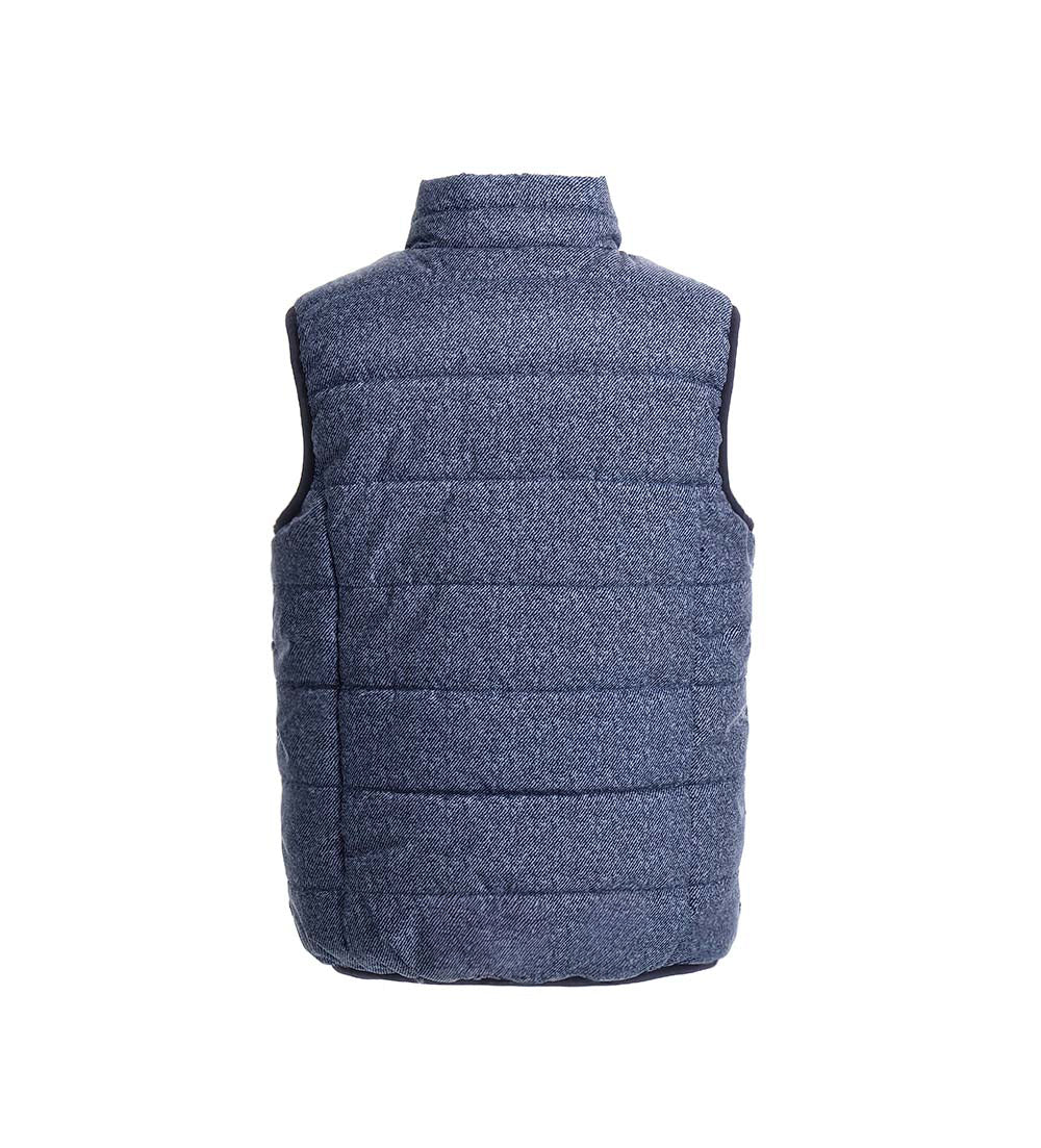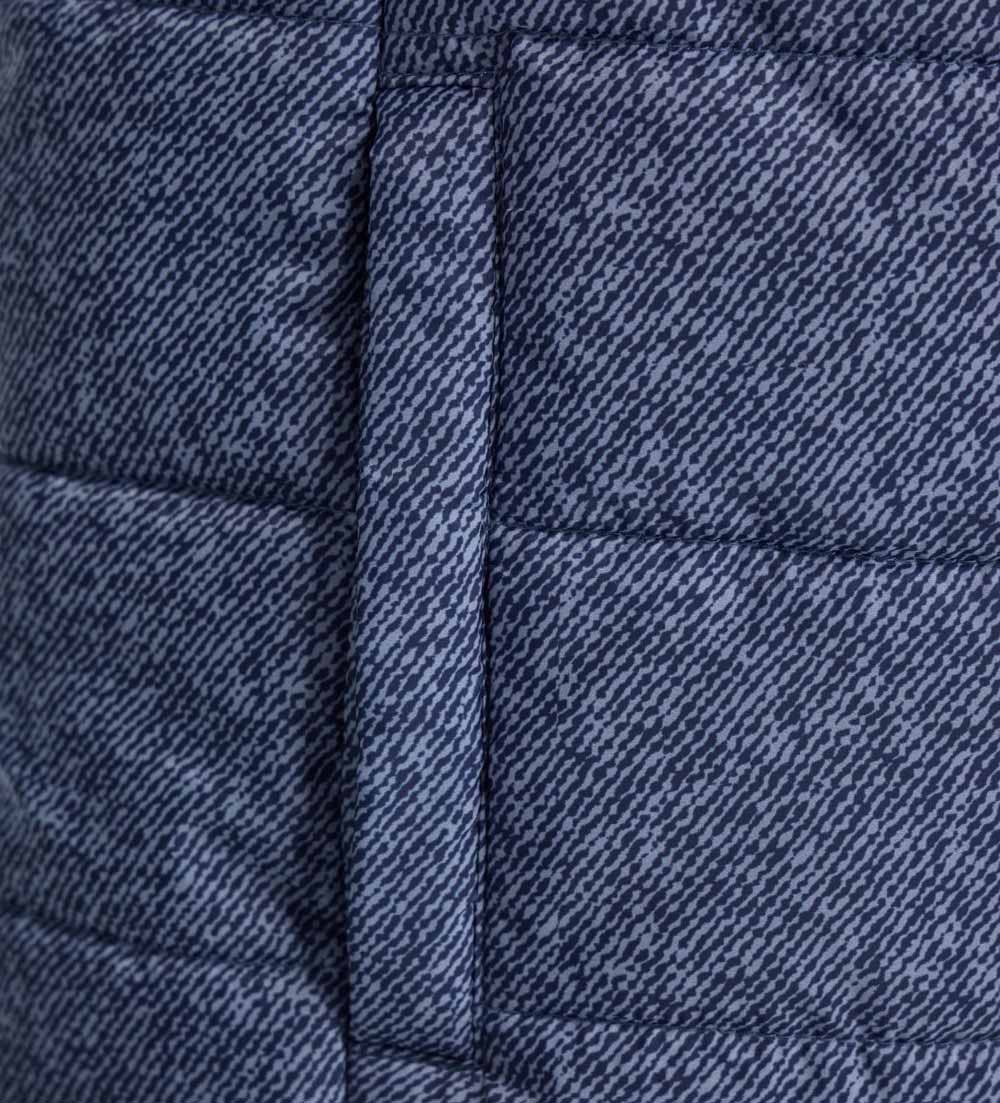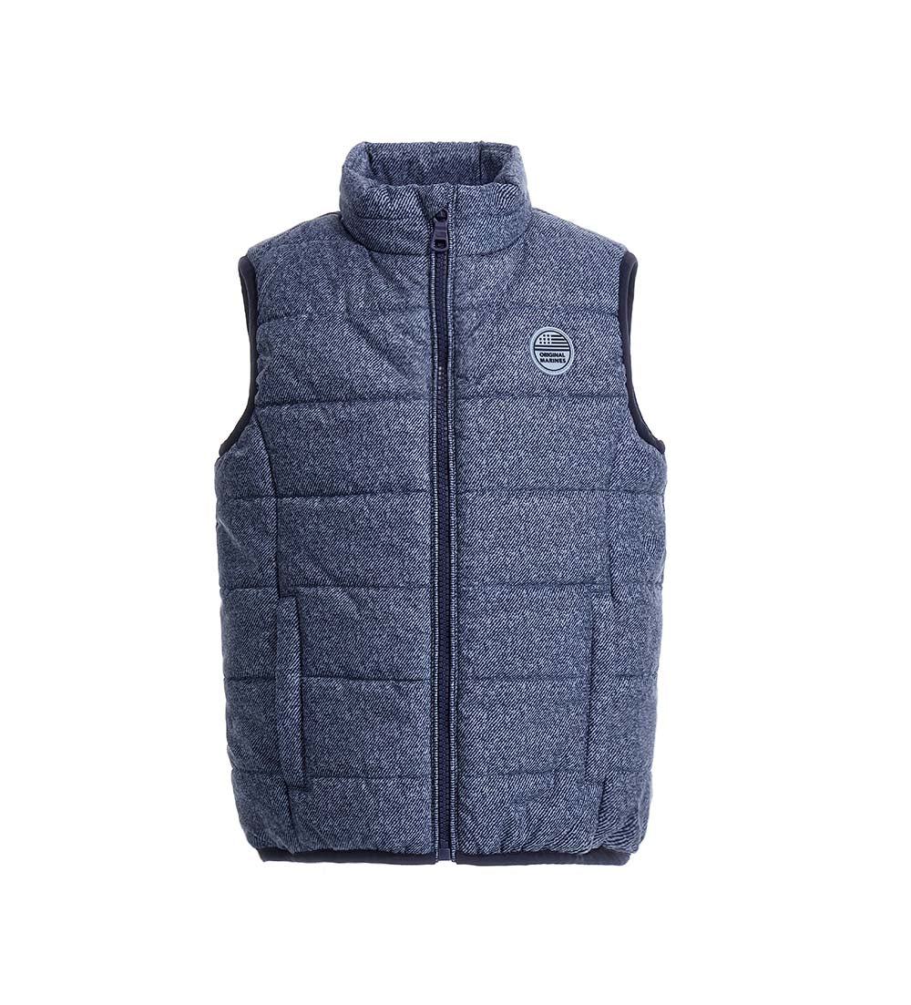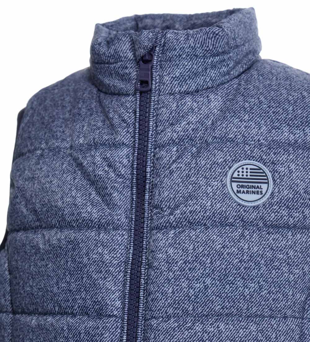 Veste sans manches en nylon rembourré avec poches, fermeture éclair sur le devant et imprimé effet denim sur toute la surface.