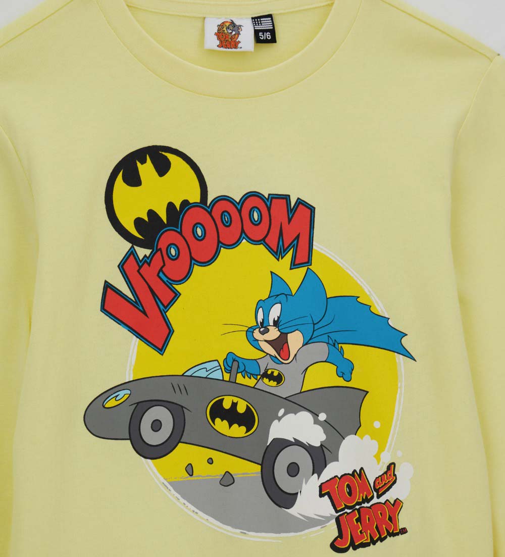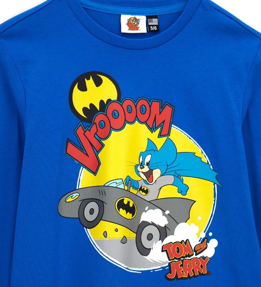 Pyjama long en coton WB Tom & Jerry avec t-shirt à manches longues et col rond avec bordures côtelées et imprimé sur le devant et pantalon avec bordures côtelées et imprimé all-over.