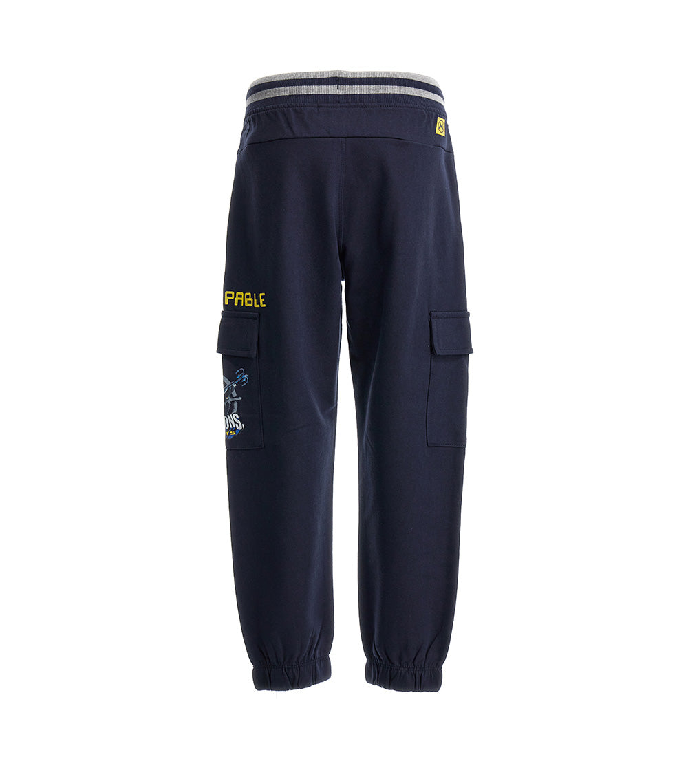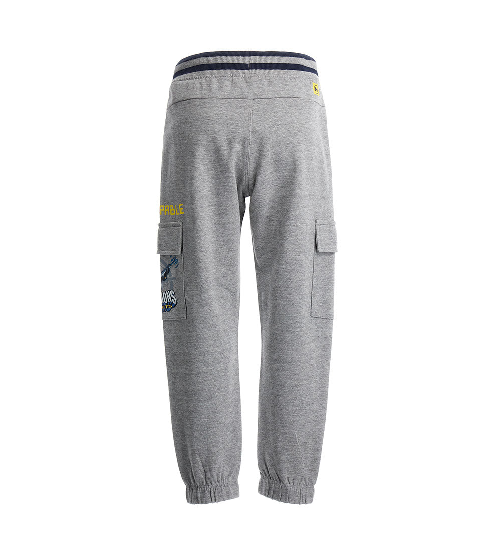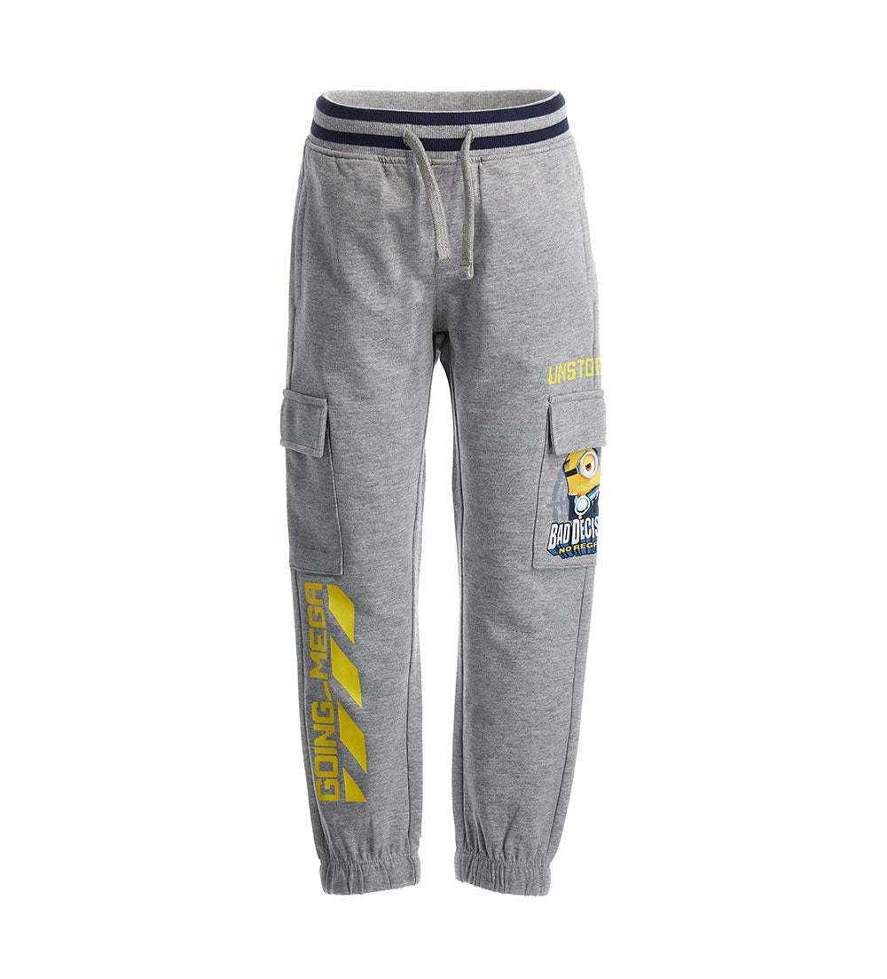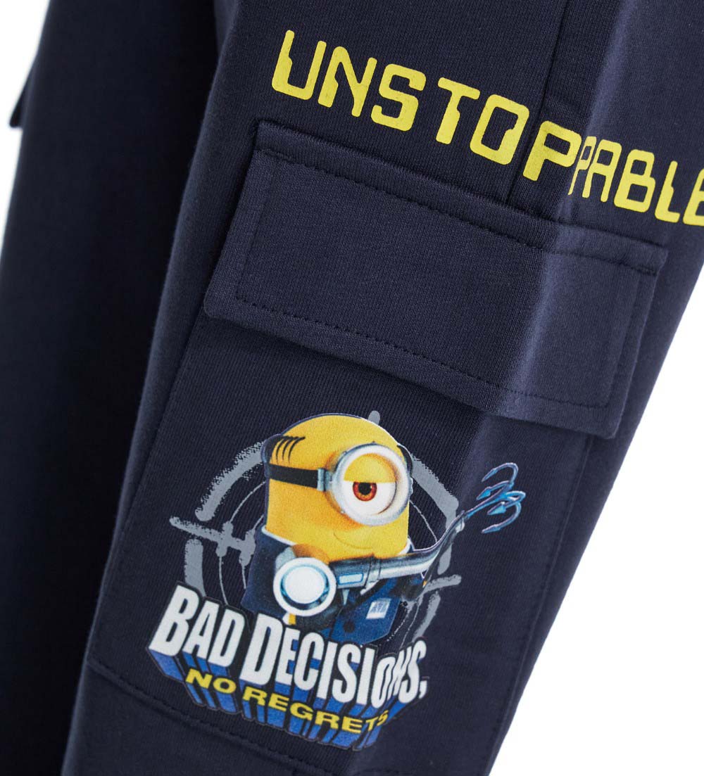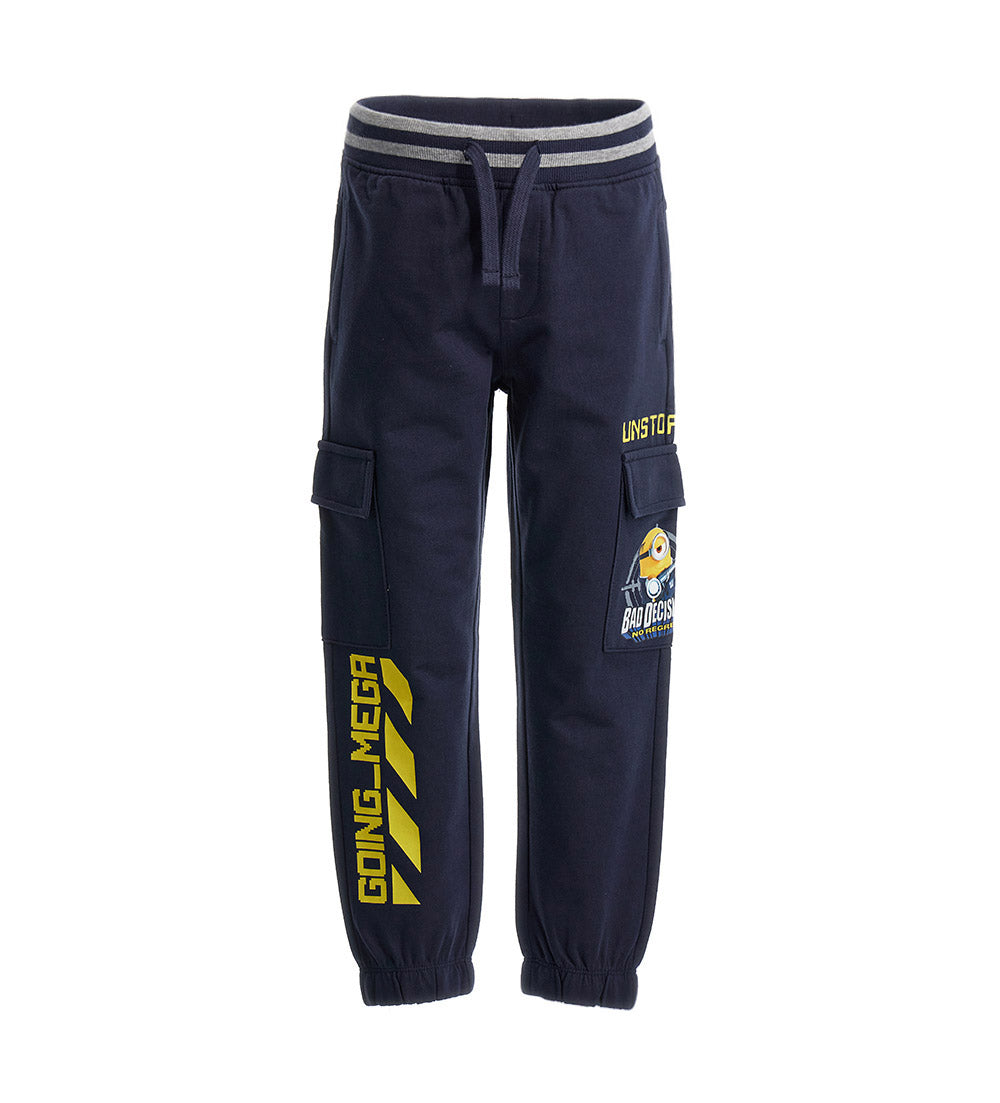Pantalon en coton Minions avec grandes poches latérales, lacets réglables ton sur ton, élastique sur le bas, finitions côtelées teintes en fil et imprimés.
