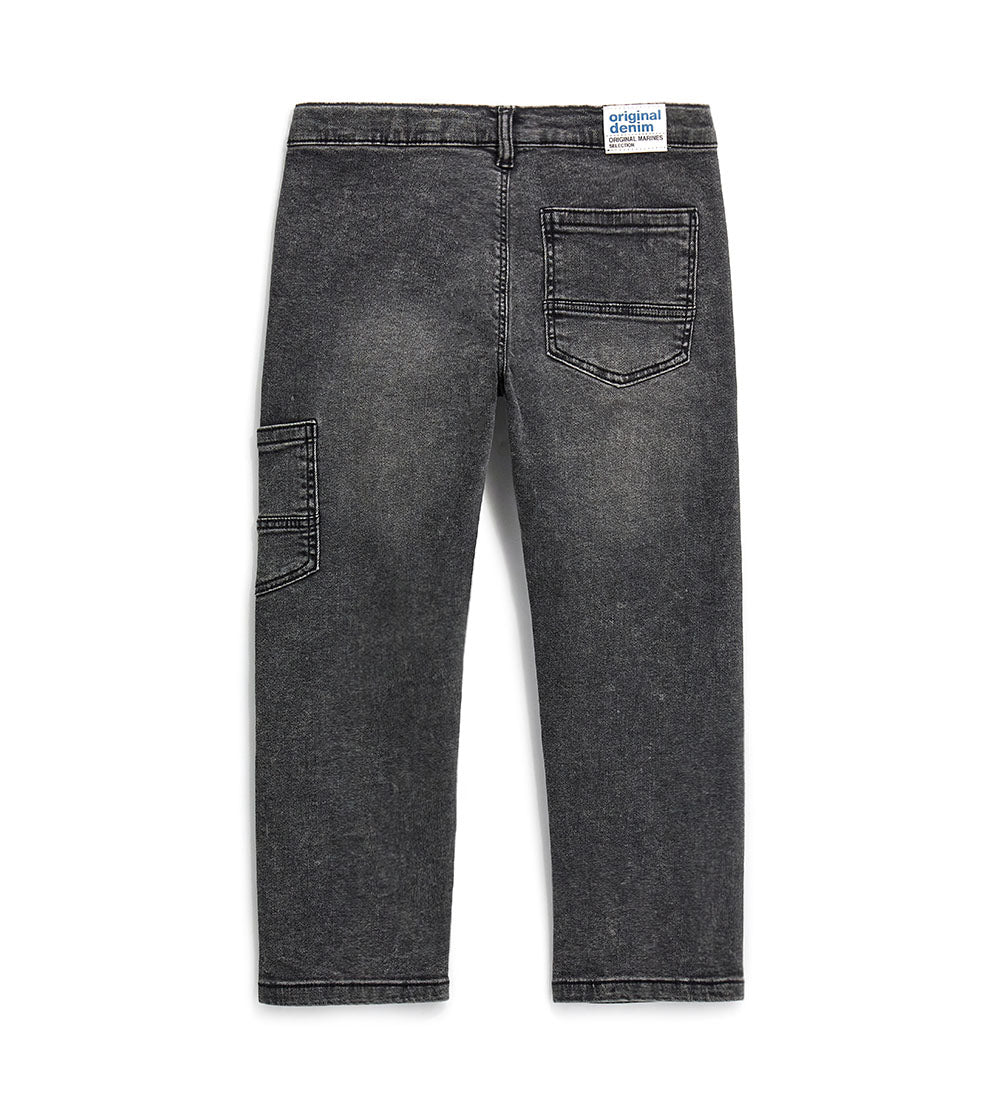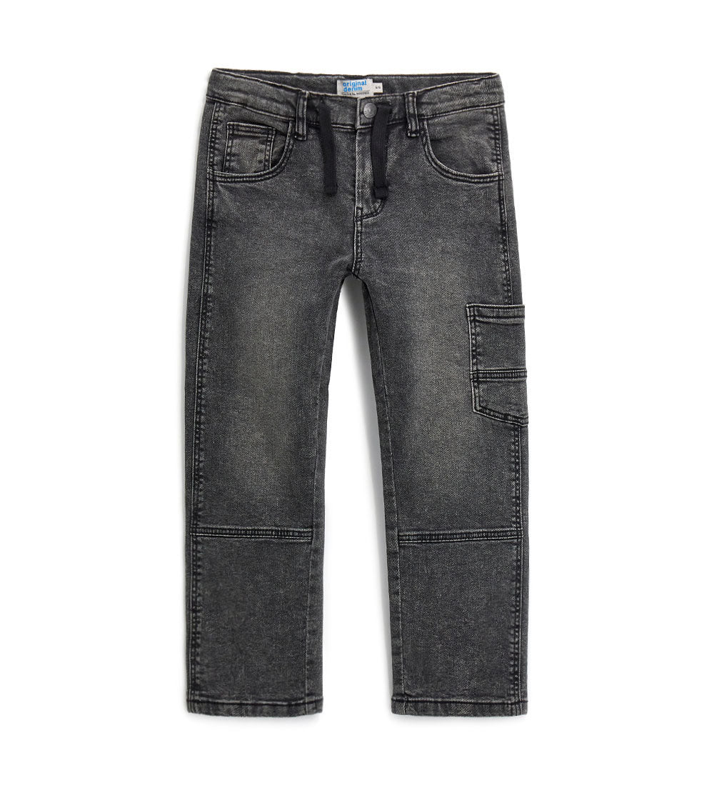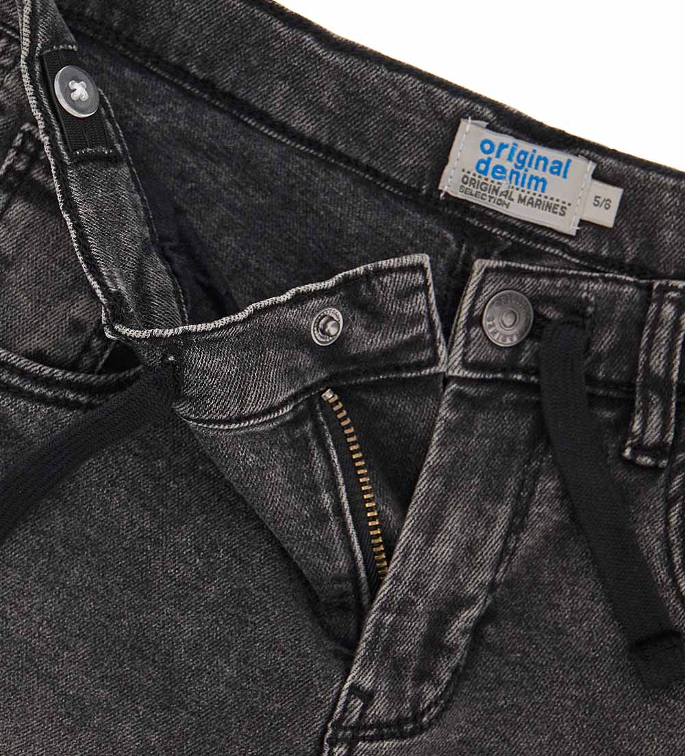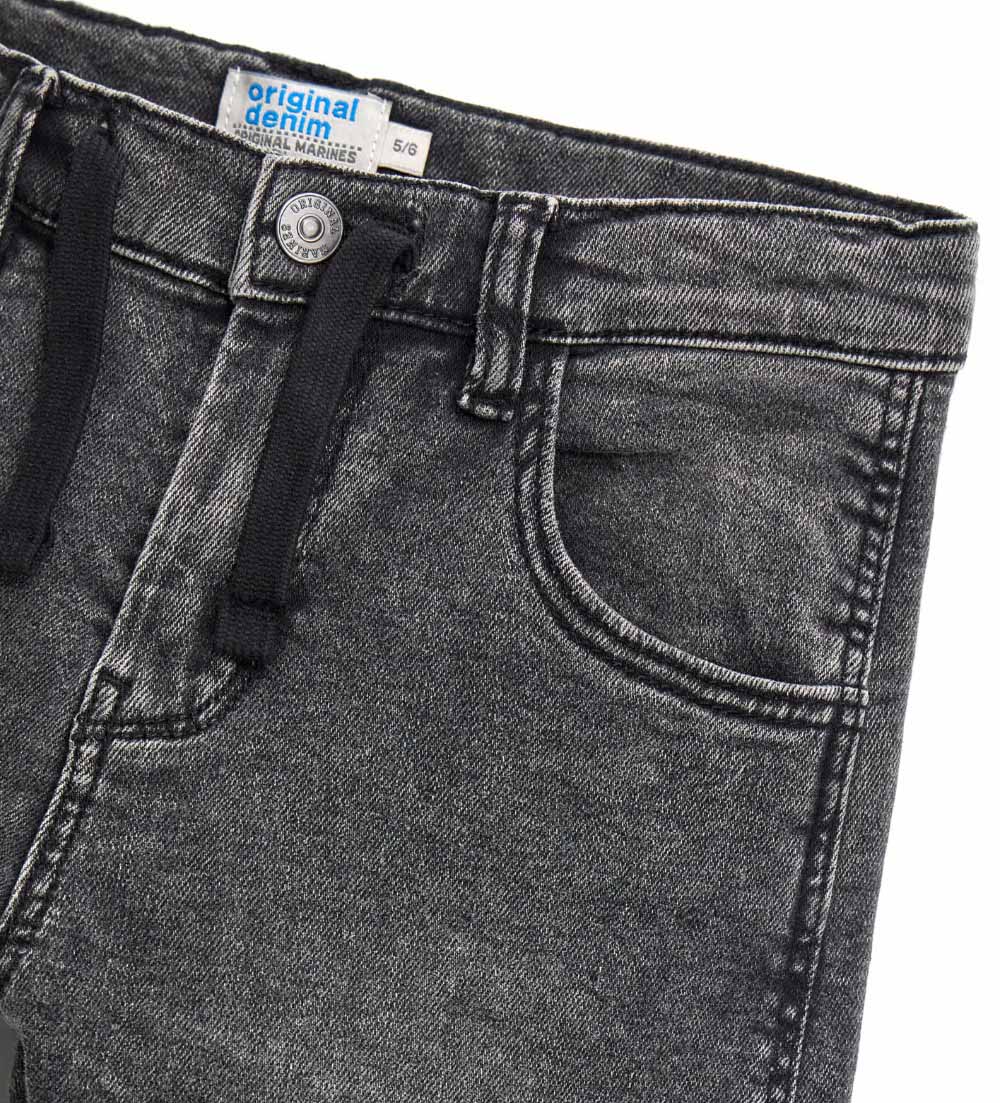 Jean en coton 5 poches avec taille élastique, cordon de serrage réglable et poche latérale.