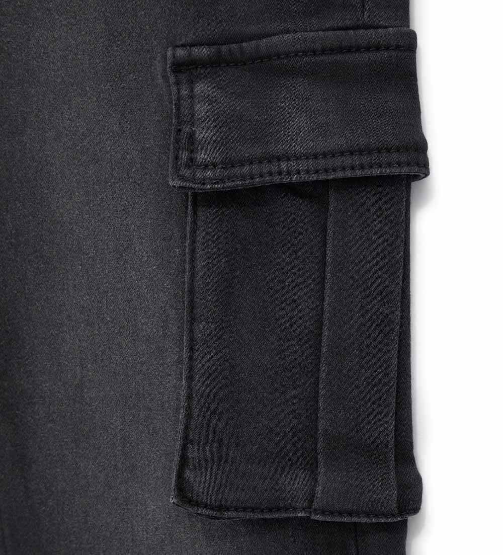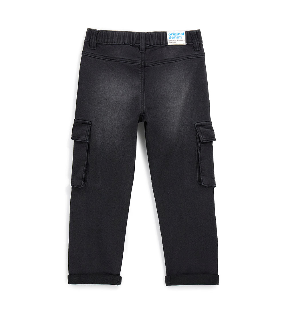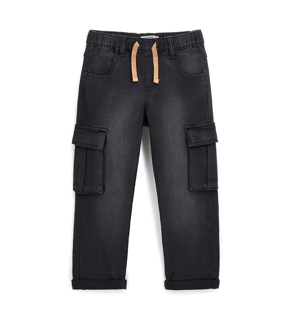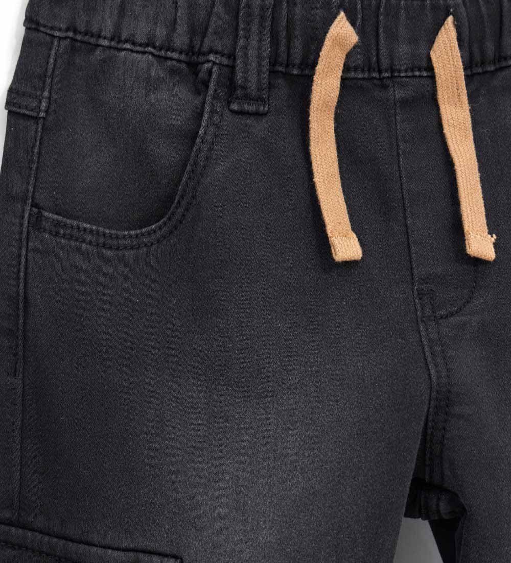 Jean 5 poches avec taille élastique, cordon de serrage réglable et poche latérale.