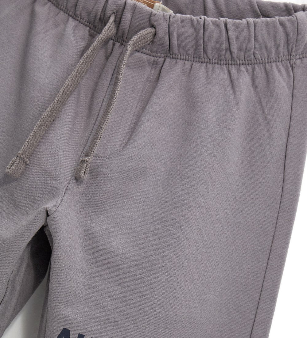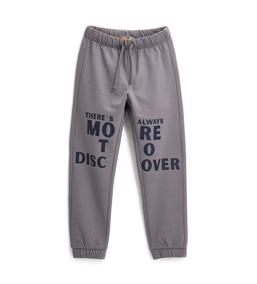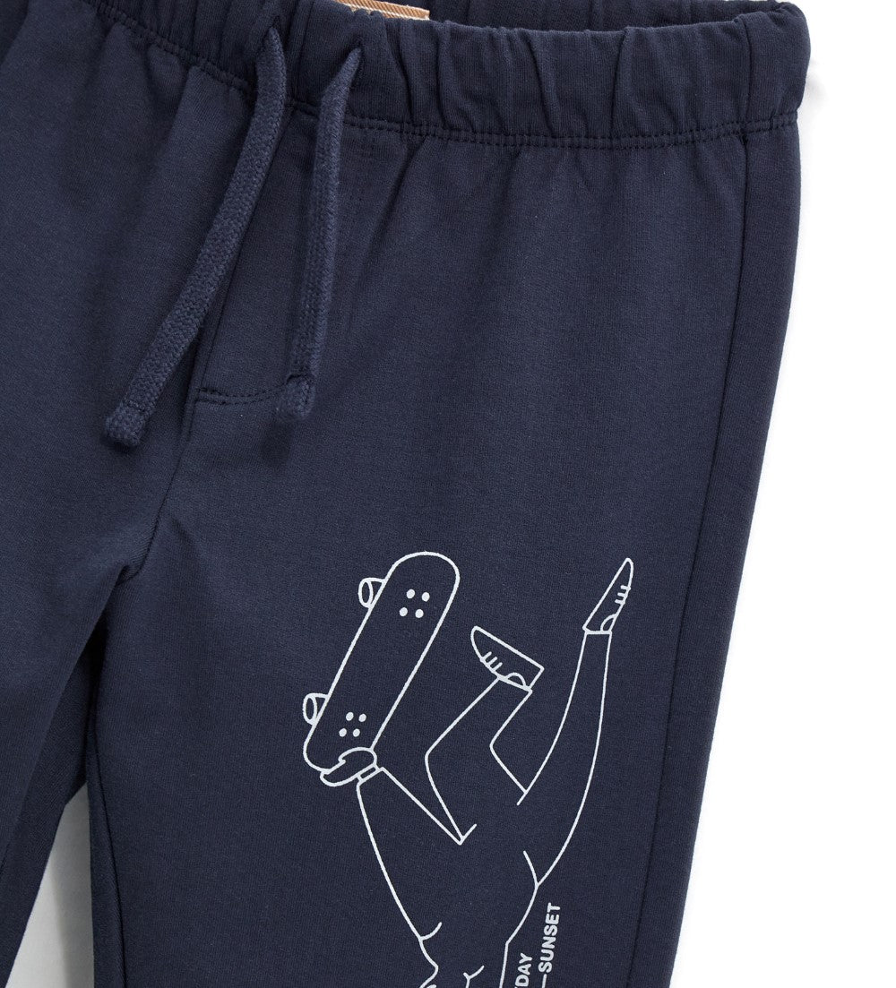 Pantalon en coton molletonné extensible avec taille ajustable par cordon de serrage, finitions côtelées, poches avant et imprimé.