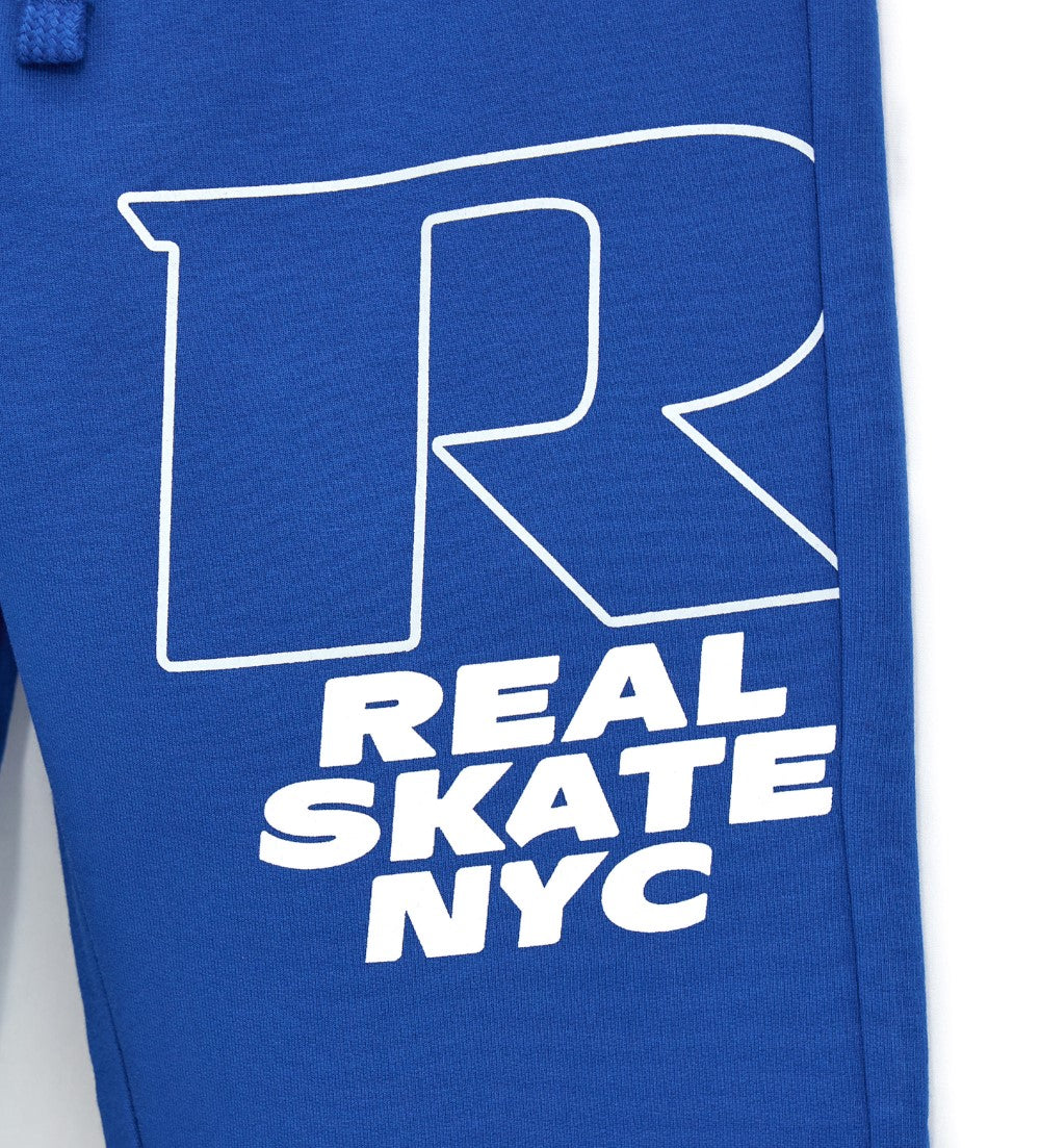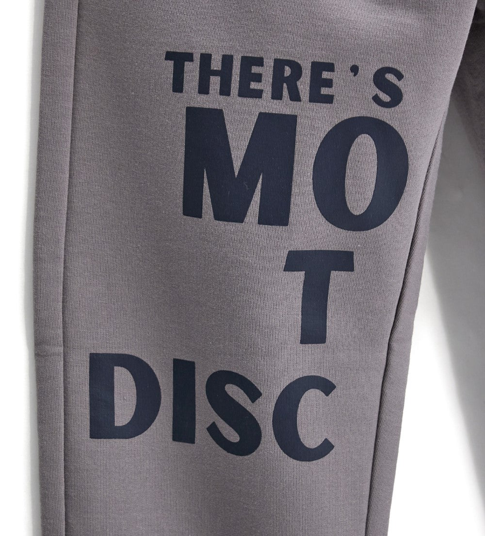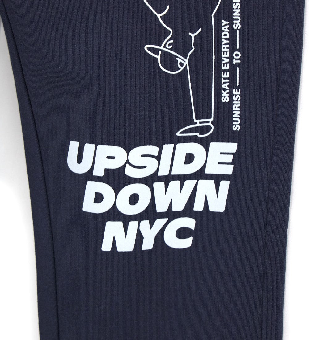 Pantalon en coton molletonné extensible avec taille ajustable par cordon de serrage, finitions côtelées, poches avant et imprimé.