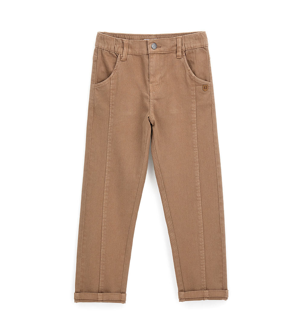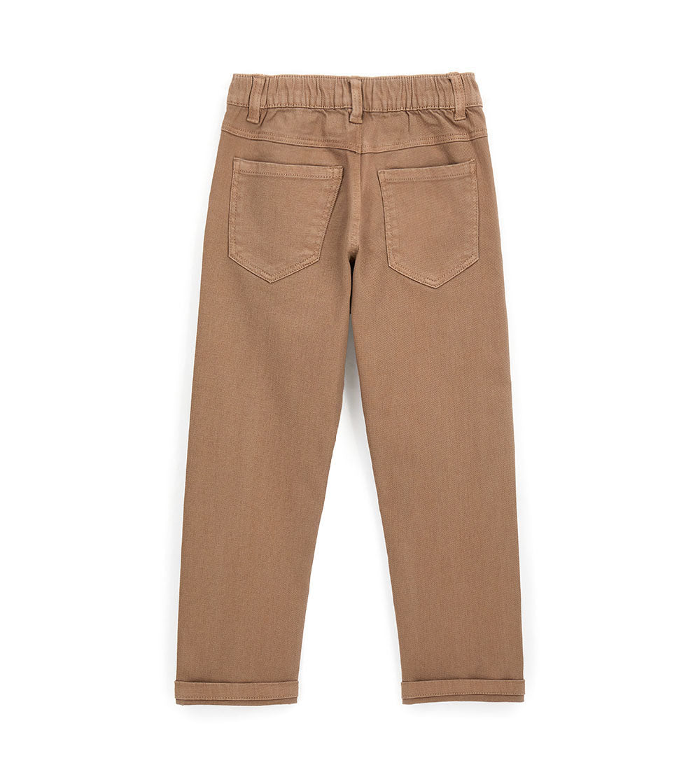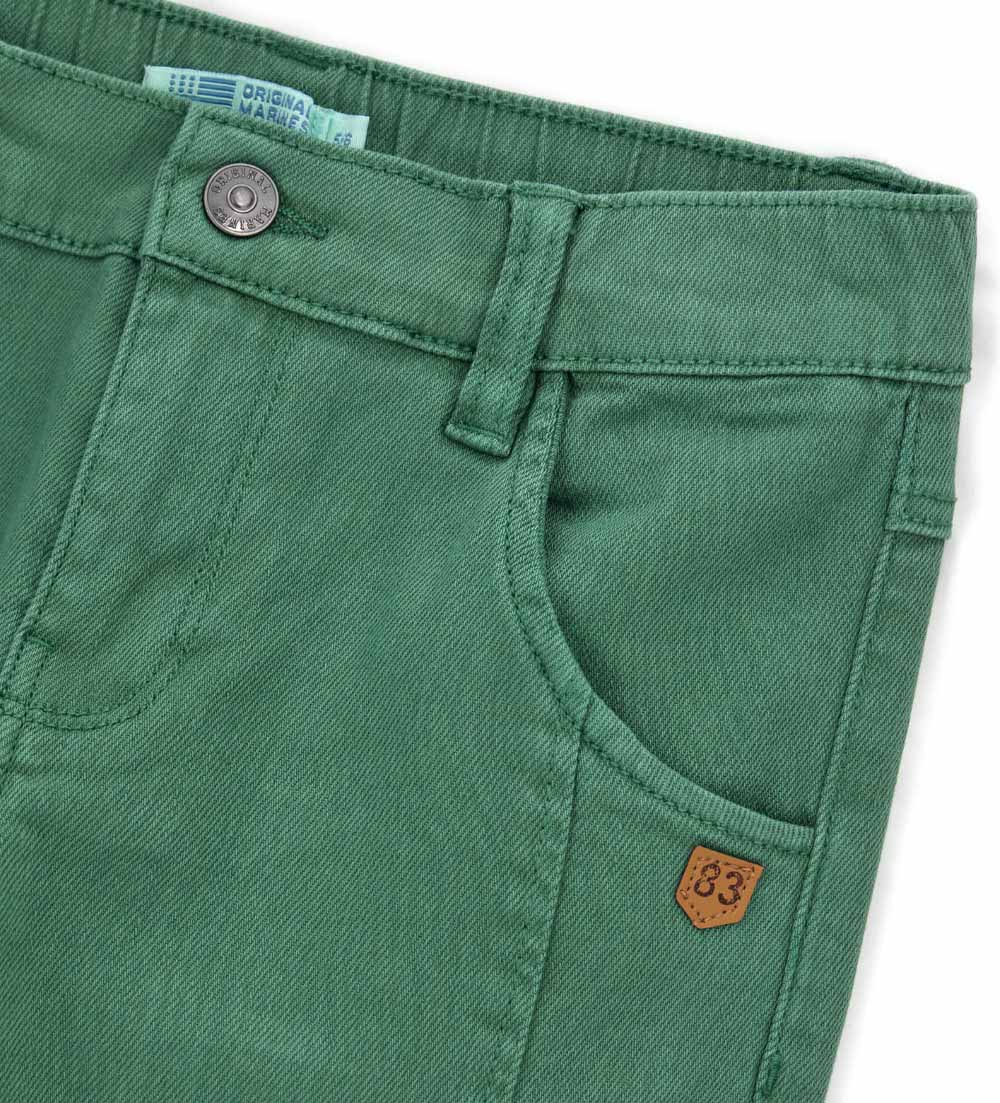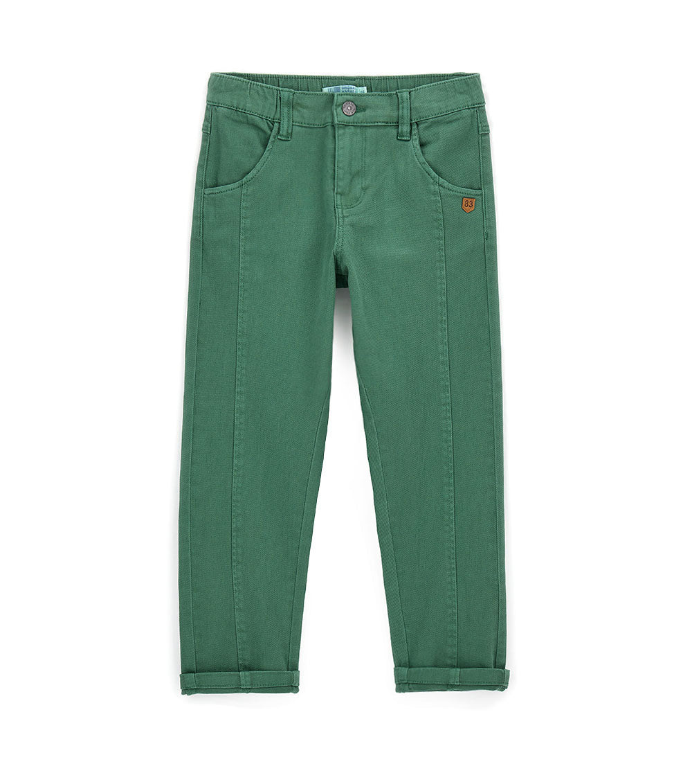 Pantalon en sergé de coton extensible teint en pièce avec taille élastiquée, ouverture boutonnée et zippée, poches avant, poches plaquées au dos et étiquette en similicuir sur le devant.