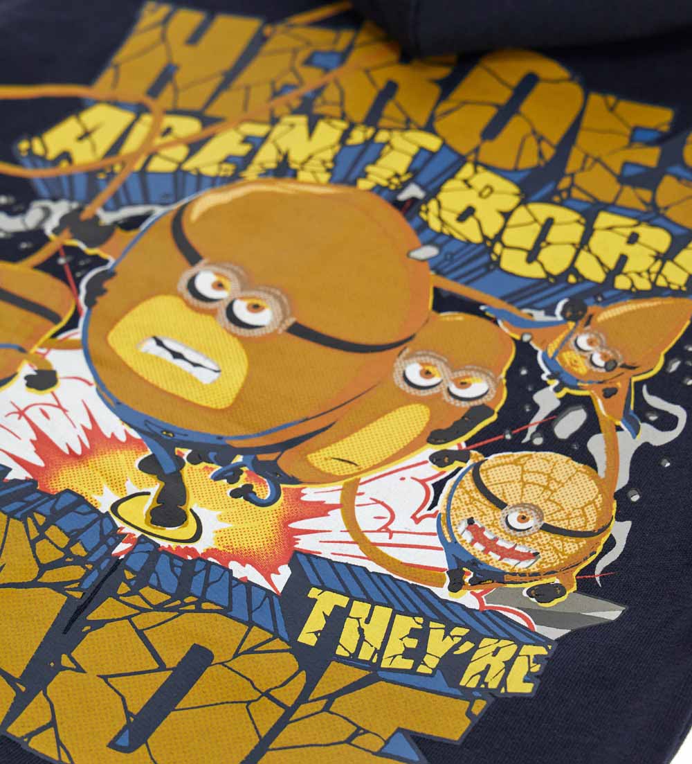 Survêtement Minions à manches longues en coton molletonné avec capuche doublée de coton, fermeture zippée dissimulée, poche kangourou et finitions côtelées. Pantalon en coton molletonné imprimé, cordon de serrage réglable et ourlet élastiqué.