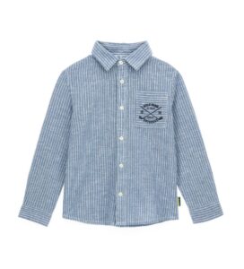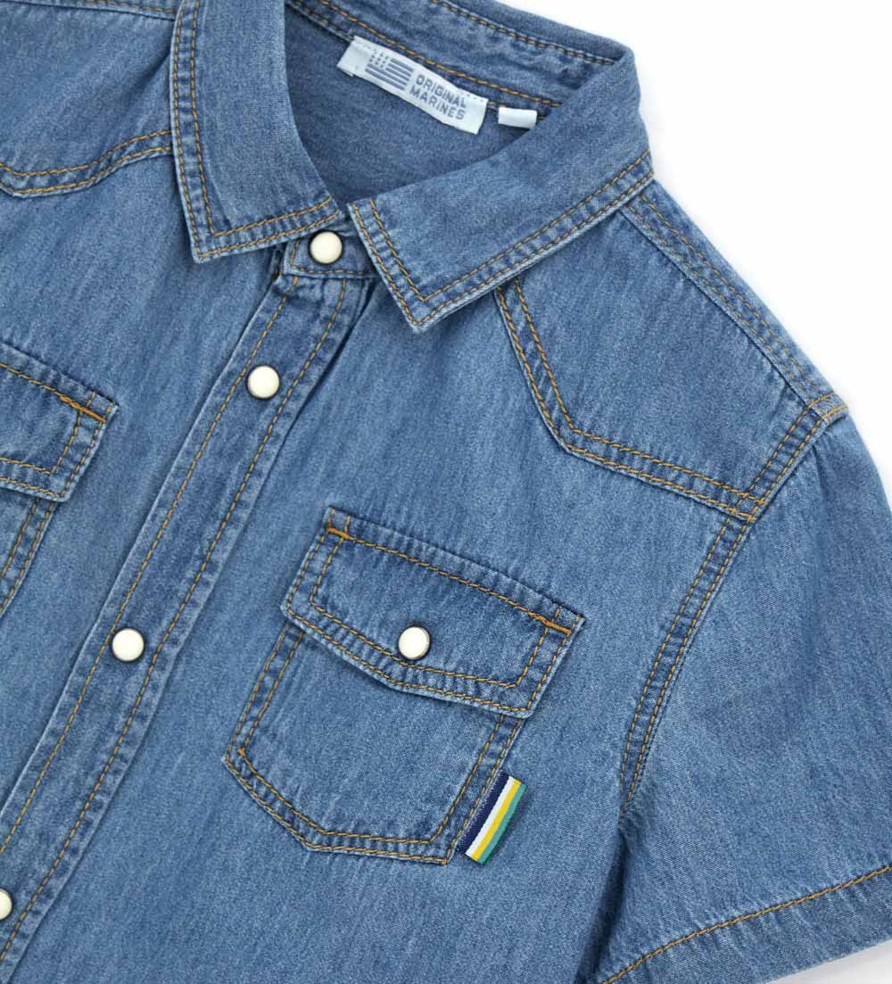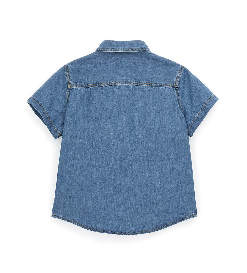 Chemise en jean délavé moyen à manches courtes, ouverture devant par bouton-pression, poches plaquées à rabat sur le devant et étiquette brodée sur la poche.