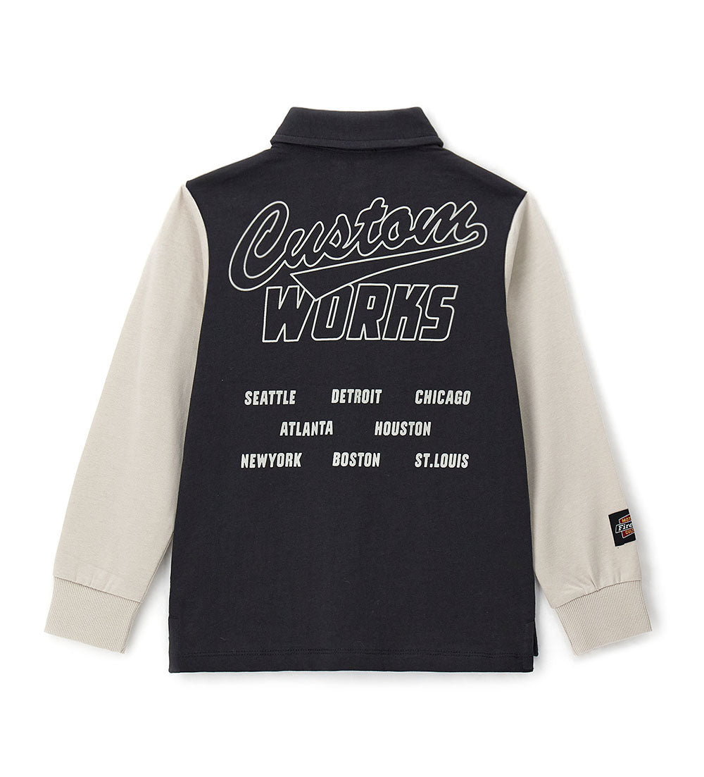 Polo à manches longues en jersey de coton avec manches contrastées, poignets côtelés, broderie et application sur le devant et imprimé au dos.