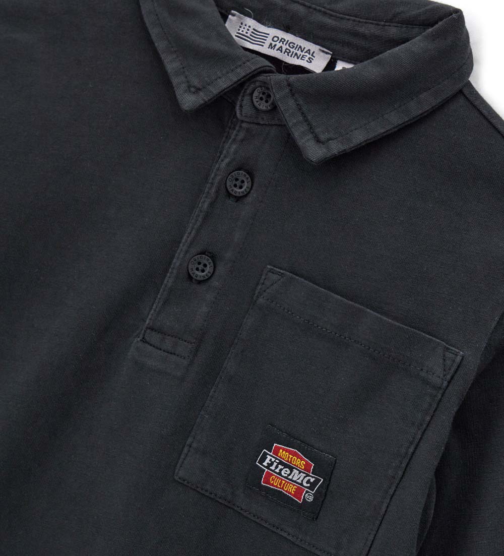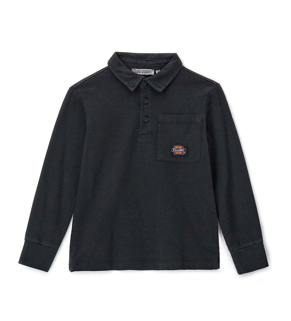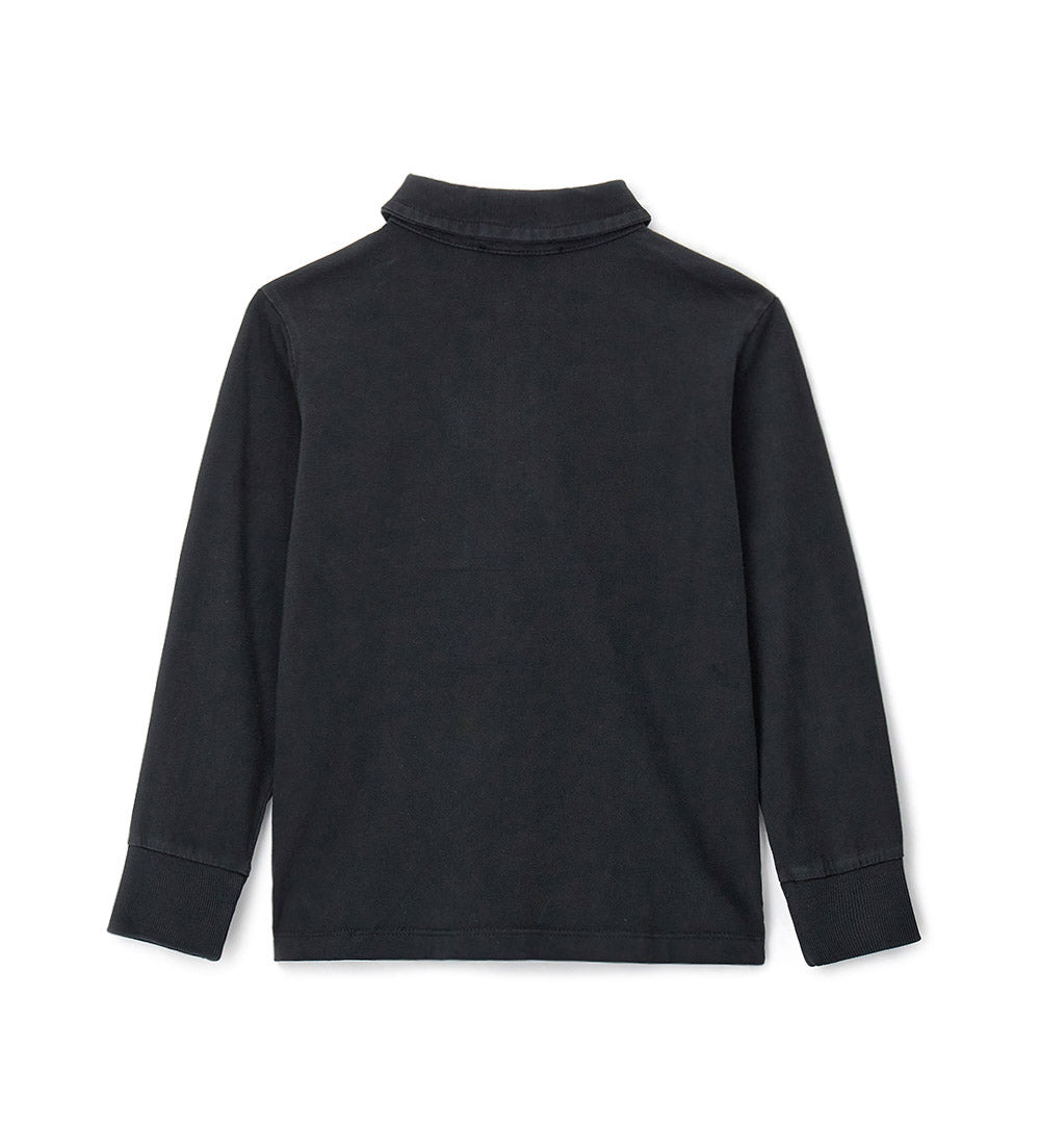 Polo à manches longues en jersey de coton teint en pièce, avec poche avant, étiquette appliquée et poignets côtelés.