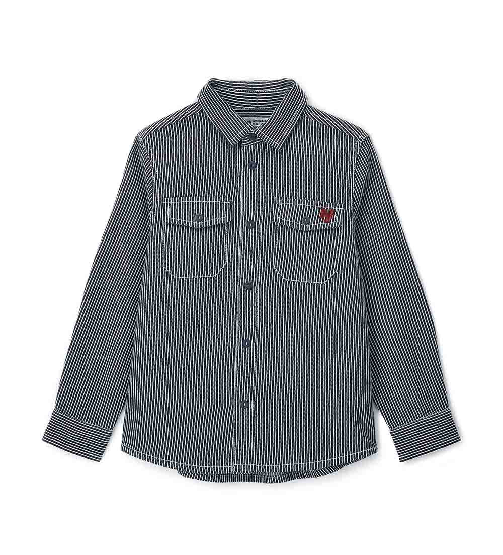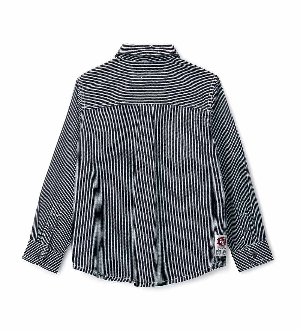 Chemise en coton teint en fil indigo, manches longues et bouton-pression sur le devant. Broderie sur la poche et étiquette brodée pour un look élégant.