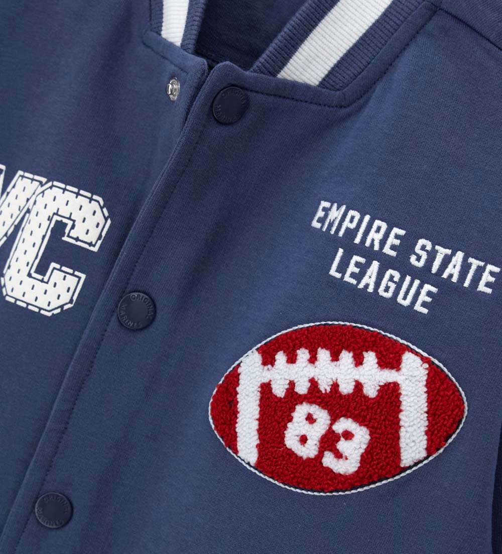 Veste bomber en coton à manches longues, bords-côtes teints en fil, poches passepoilées, boutons-pression, appliqués, imprimés sur le devant et le dos et étiquette brodée sur le côté.