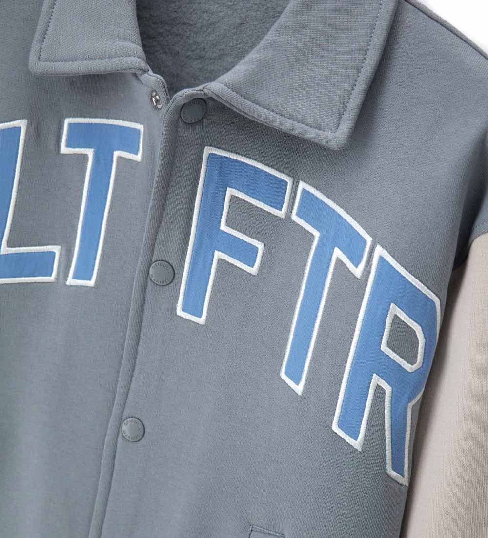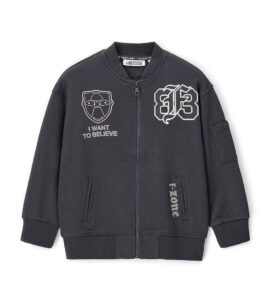 Blouson bomber oversize en coton chaud au style urbain. Manches longues contrastantes, poches passepoilées, finitions côtelées teintes en fil, appliqués brodés et imprimés pour un look moderne et original.